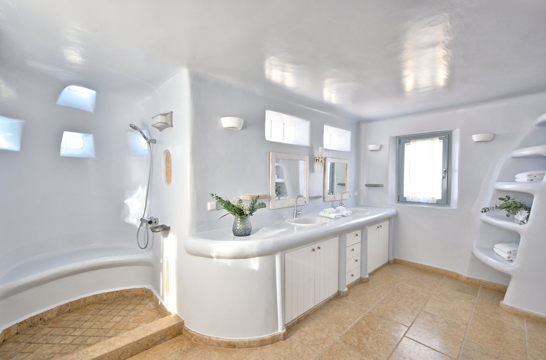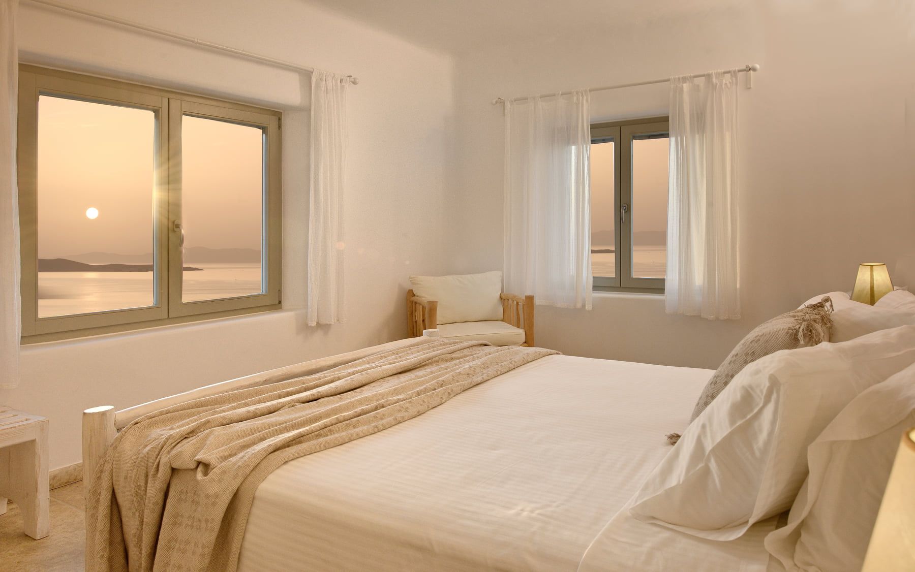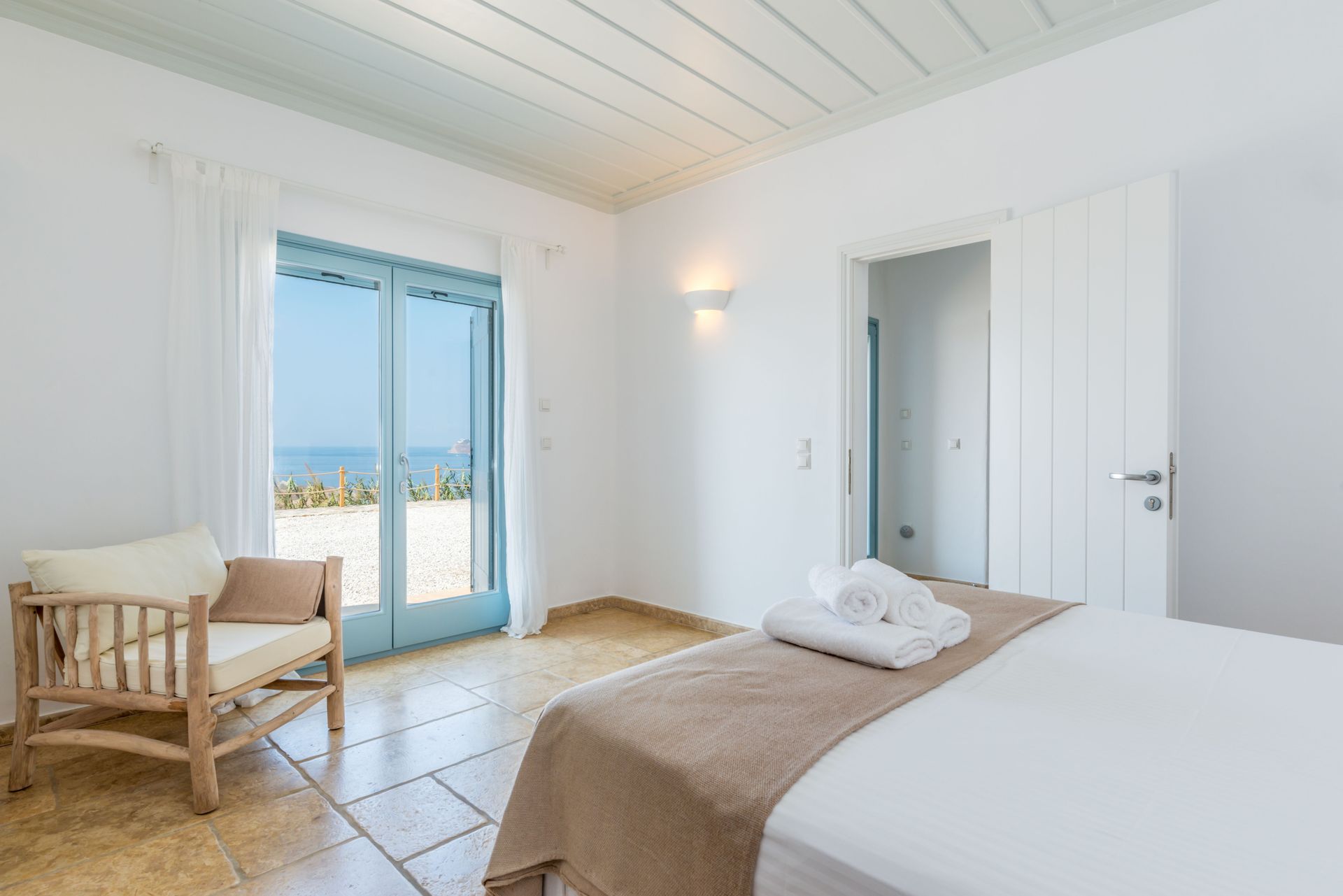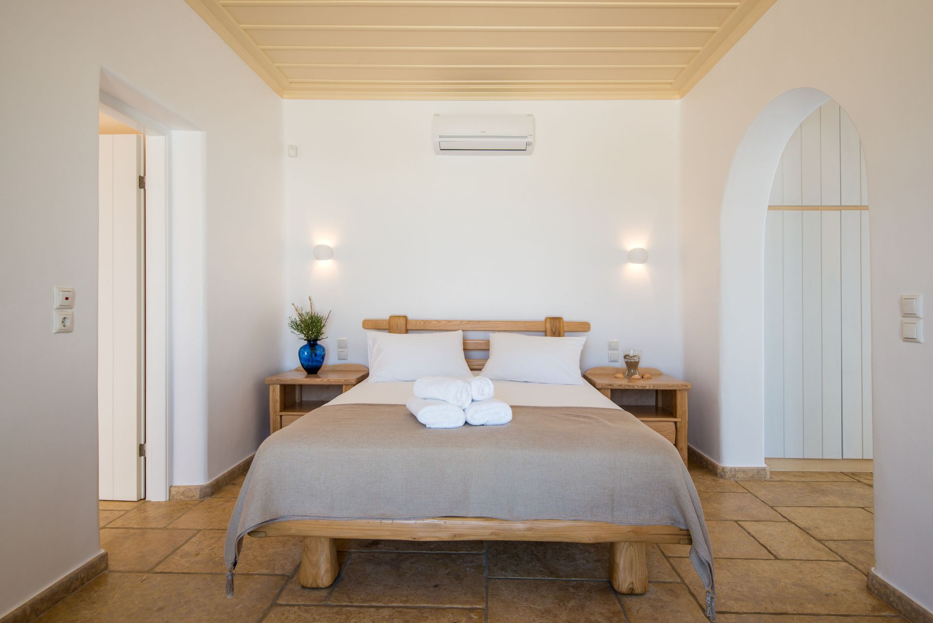 The main villa – a 5 bedroom en suite residence – combines traditional Cycladic design, luxury and absolute privacy. On the same estate there is also an independent Guest House (60sqm) that can accommodate a family of 2+2, and a fully equipped studio (25sqm) for the staff.