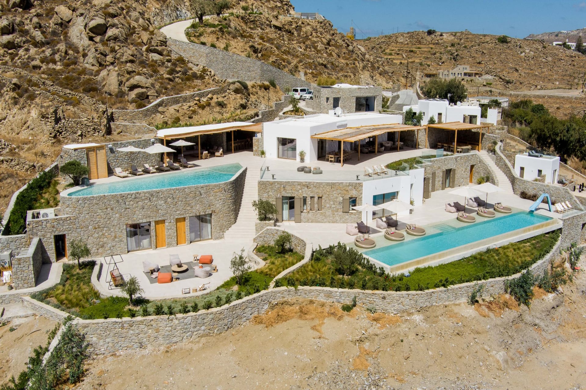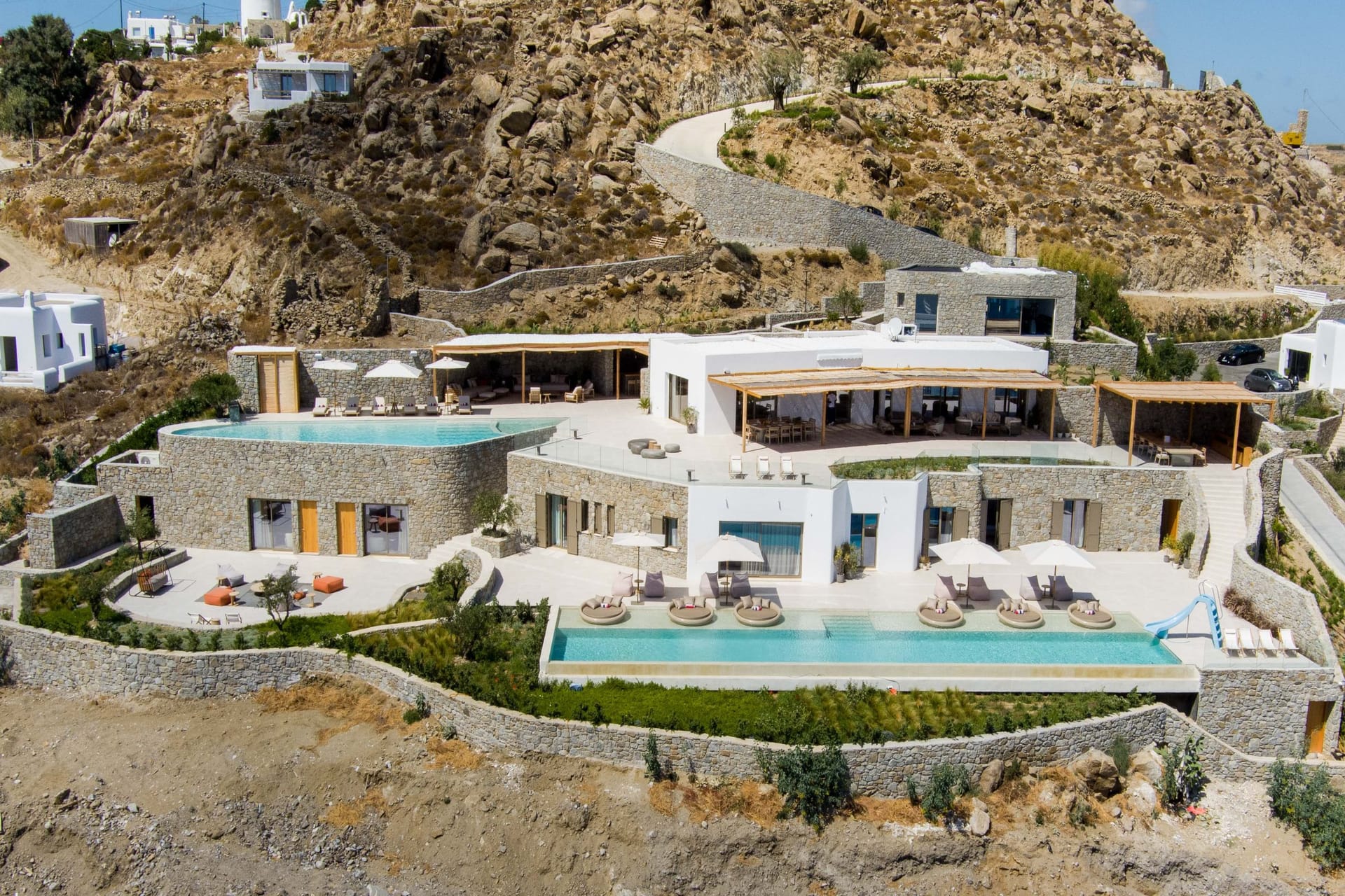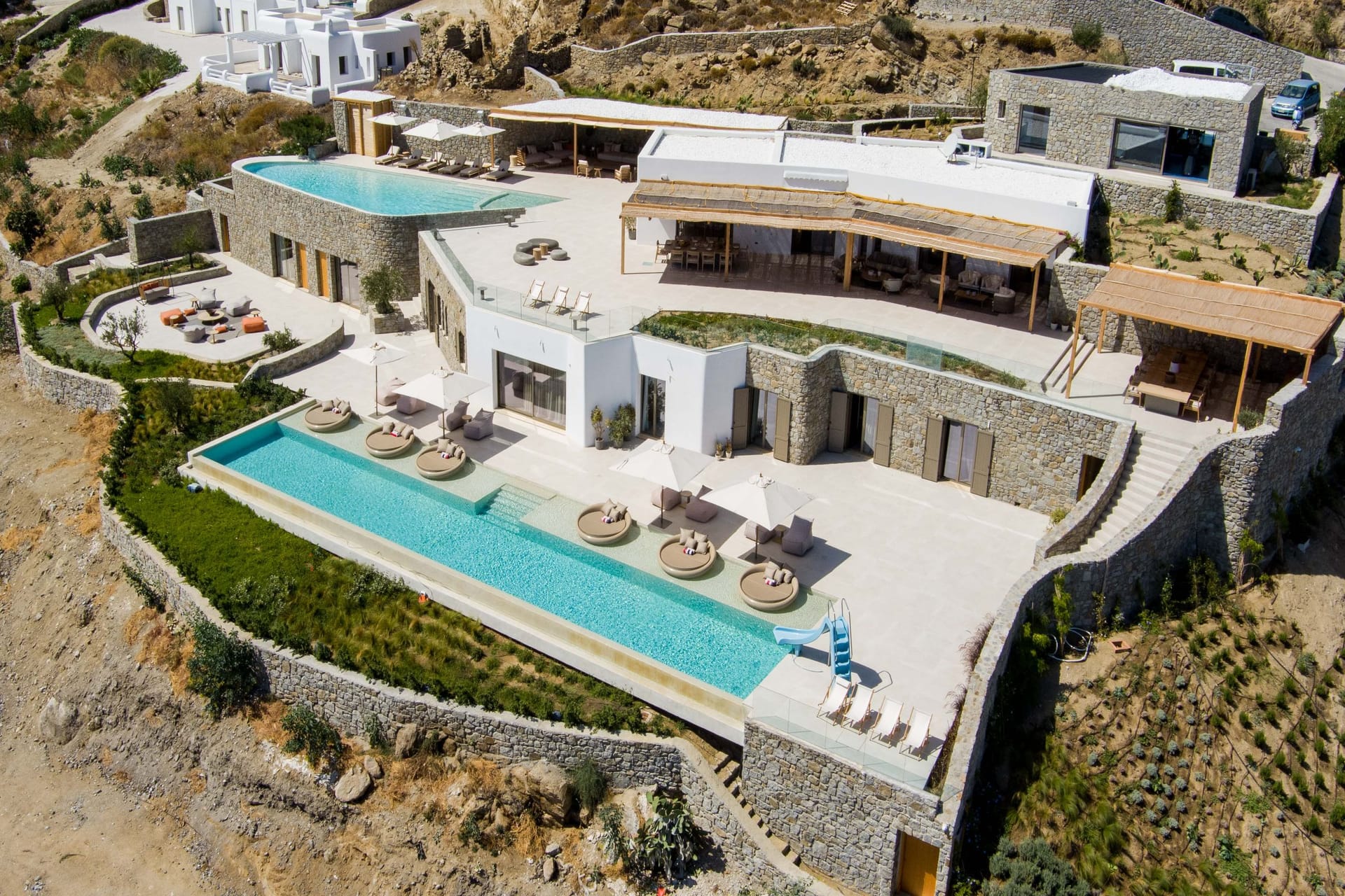In these fantastic settings, the main villa features 7 large en-suite bedrooms, all glazed with panoramic sea views and some with remarkable closets, as well as a huge open-space living room-dining room- kitchen complex with extensive glass window walls, offering passable views to the fabulous Psarou, Platys Gialos and Paraga beaches. On the lower level of the villa fine dining lovers will be happy to discover a professional, restaurant-level, kitchen for the in-house private chefs to work their alchemy, as well as separate staff quarters for the live-in personnel.