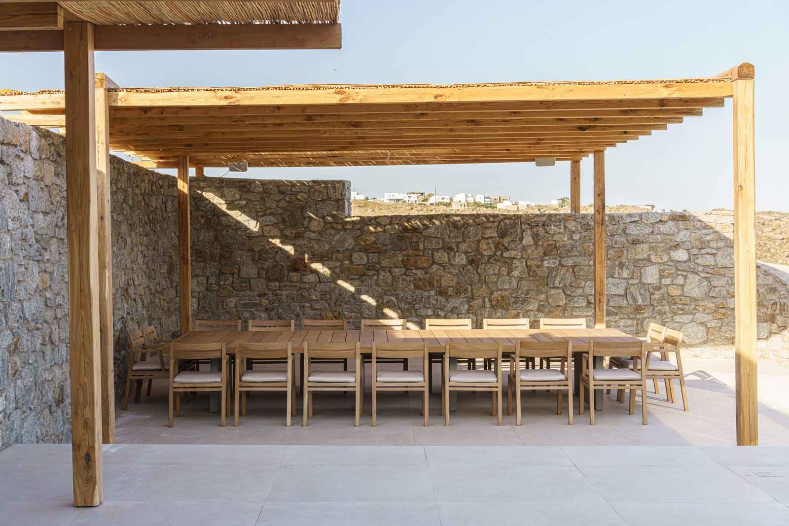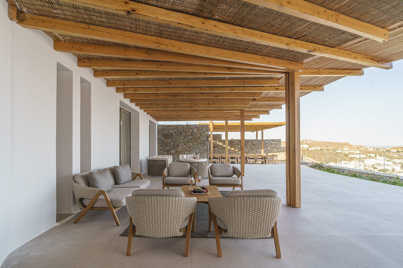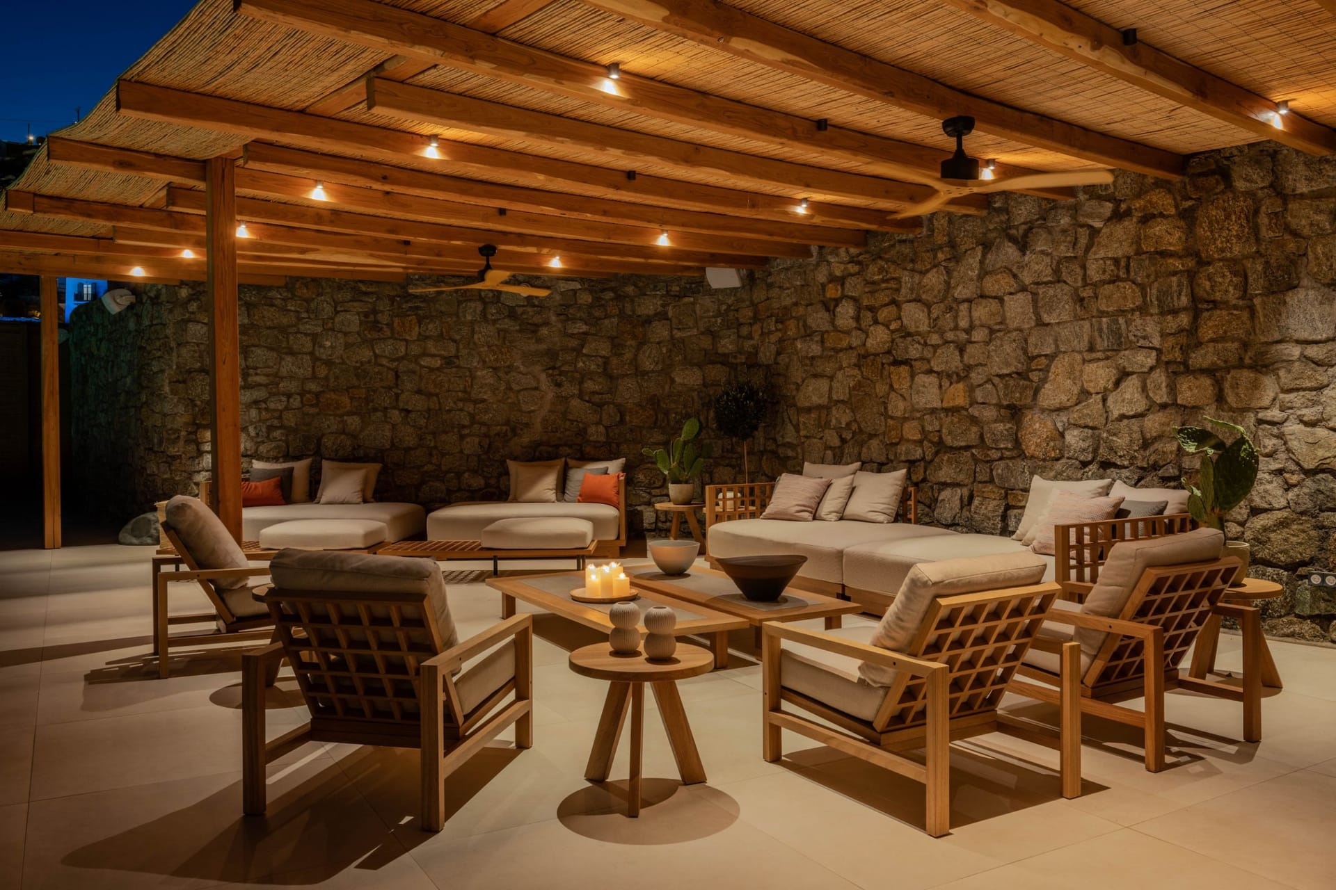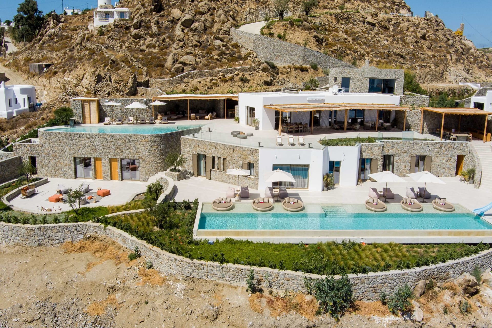 In these fantastic settings, the main villa features 7 large en-suite bedrooms, all glazed with panoramic sea views and some with remarkable closets, as well as a huge open-space living room-dining room- kitchen complex with extensive glass window walls, offering passable views to the fabulous Psarou, Platys Gialos and Paraga beaches. On the lower level of the villa fine dining lovers will be happy to discover a professional, restaurant-level, kitchen for the in-house private chefs to work their alchemy, as well as separate staff quarters for the live-in personnel.