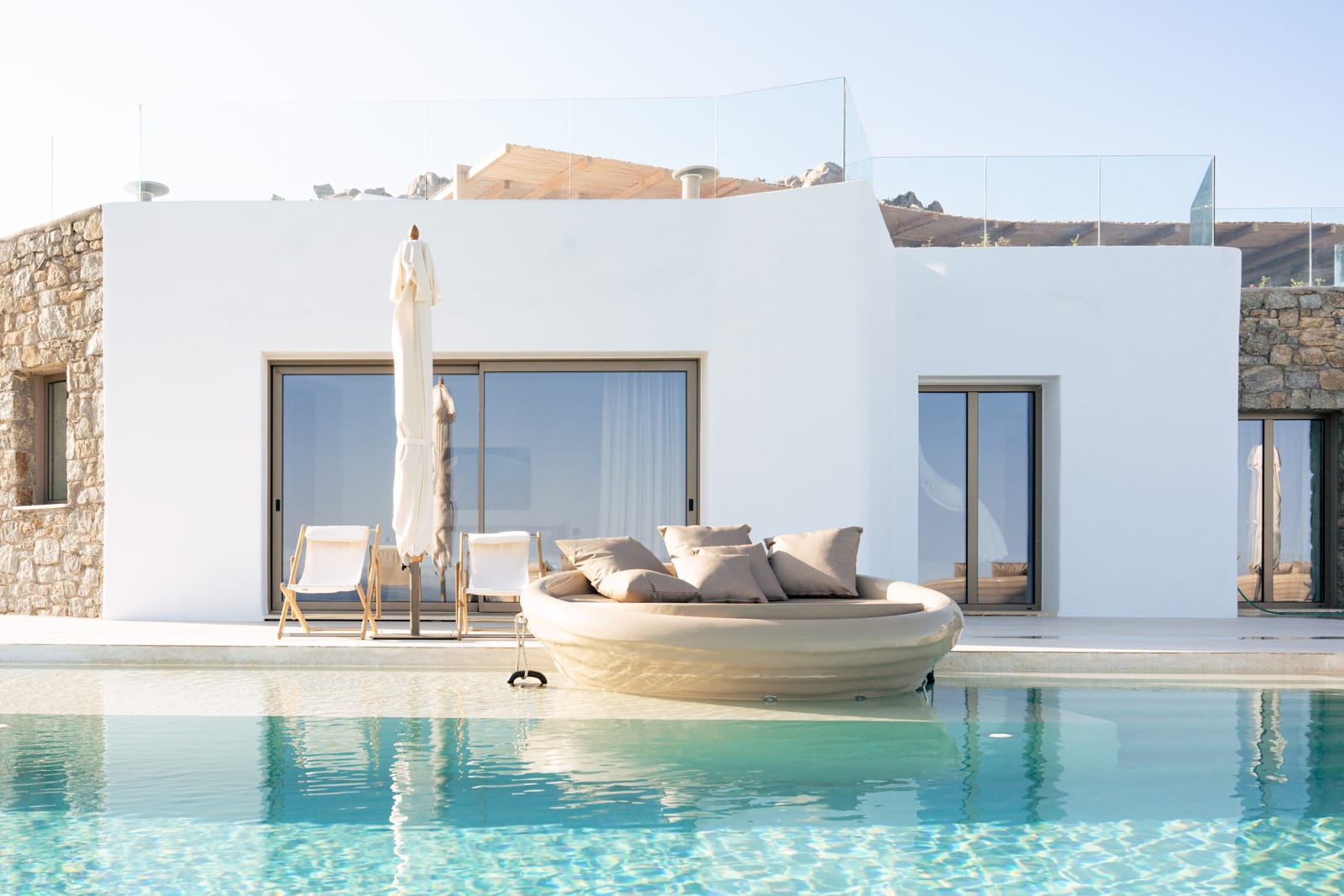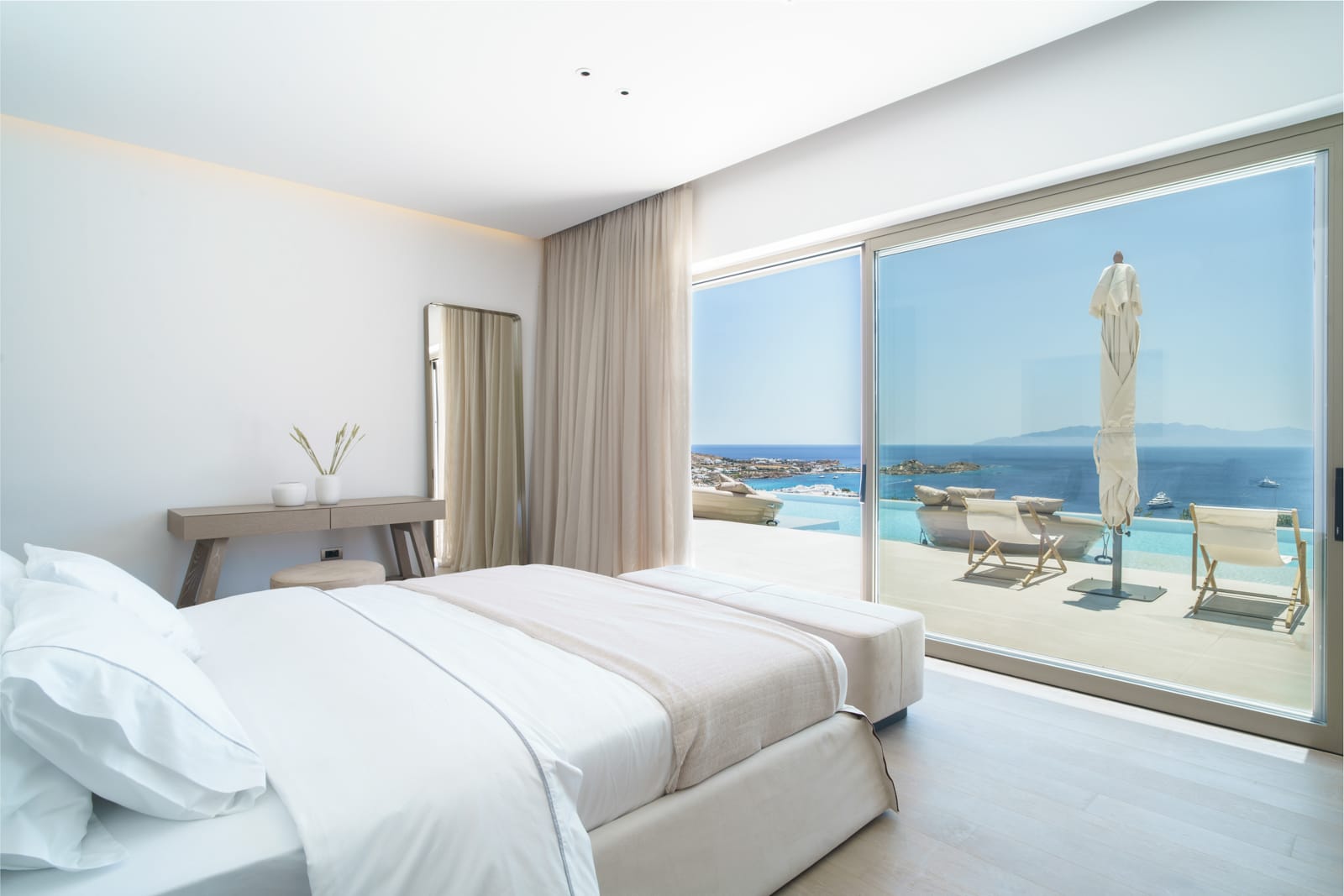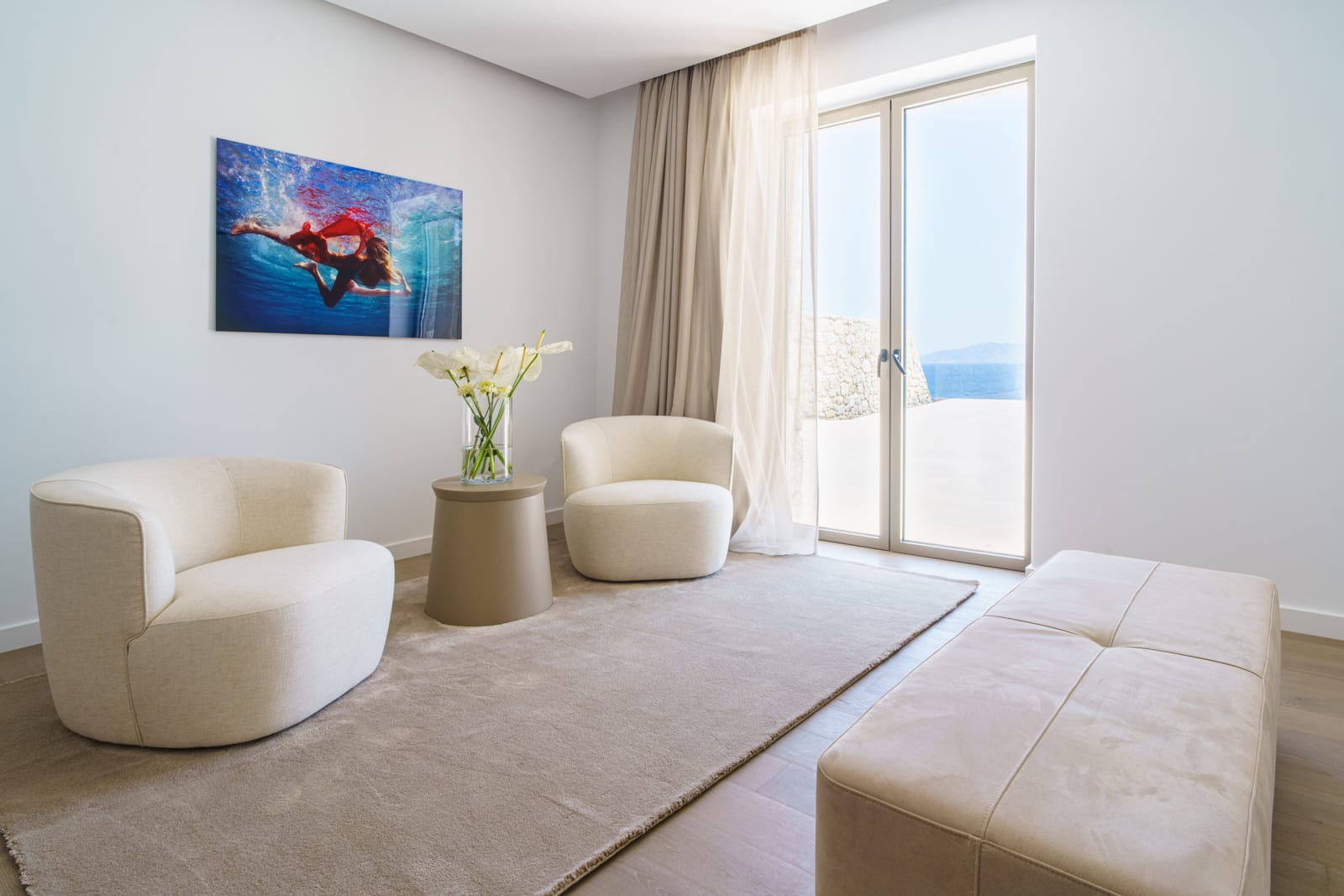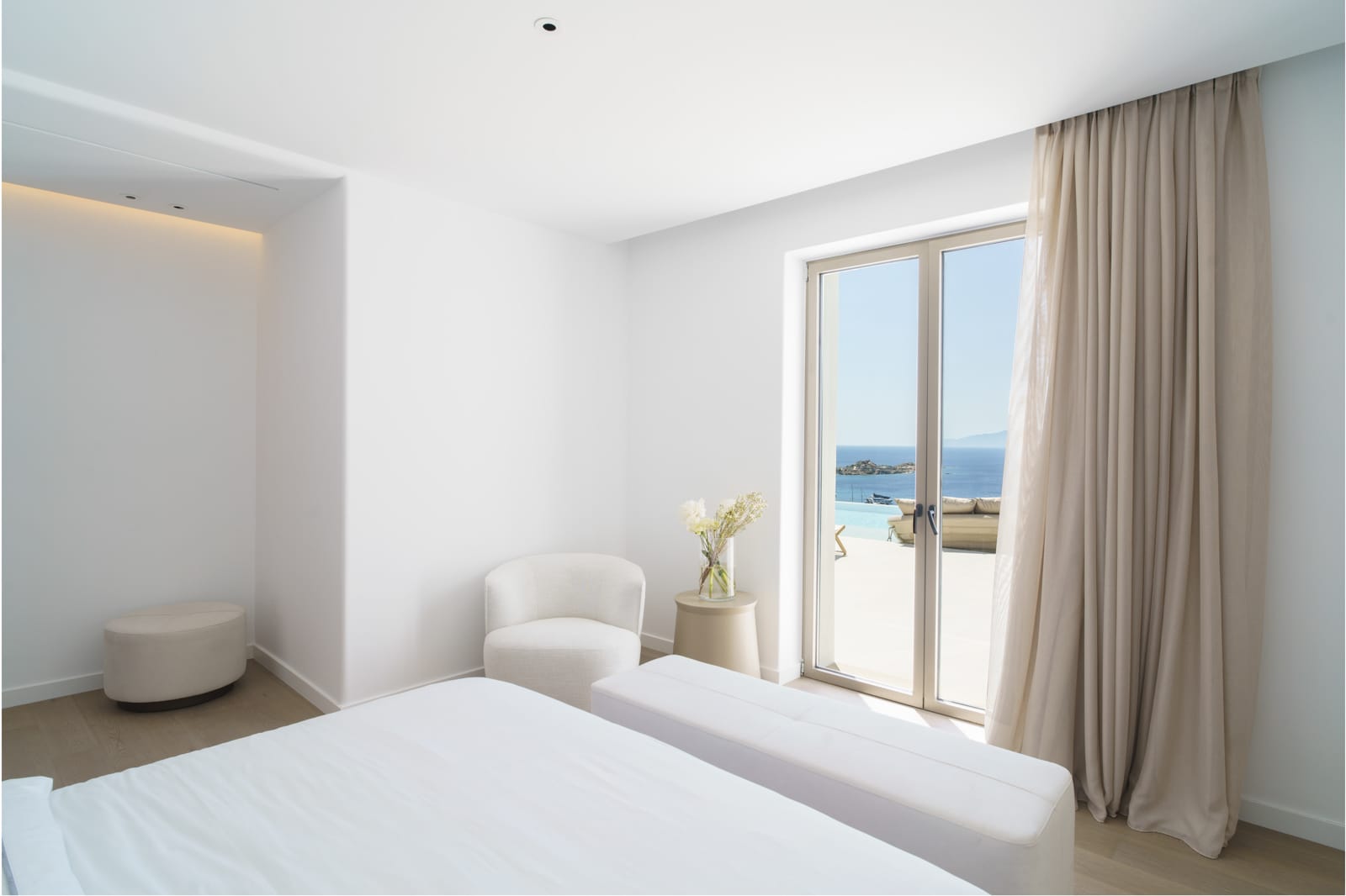 The brilliant white interiors match the exteriors while the subtle, tasteful minimal decorations both reflect and contrast the Mykonian elegance the island is known for.