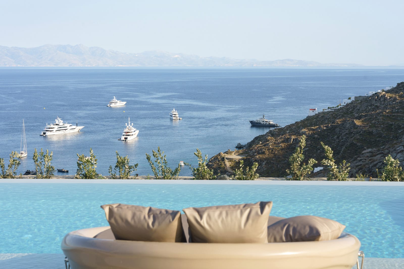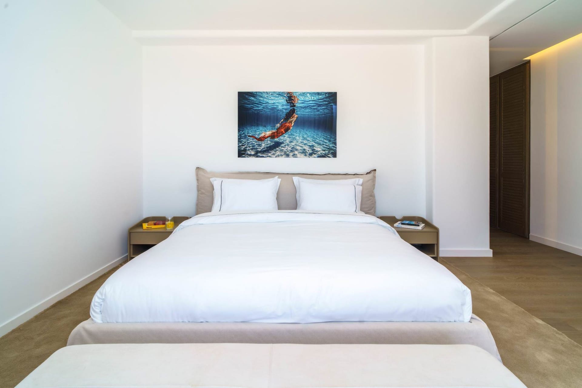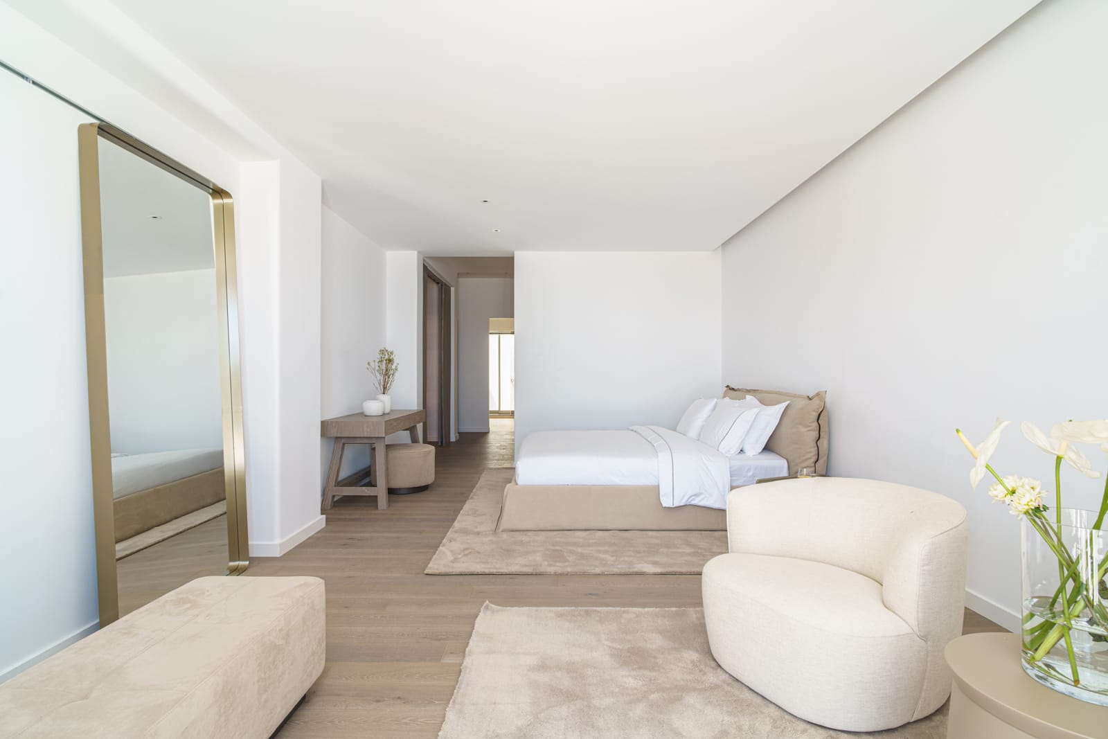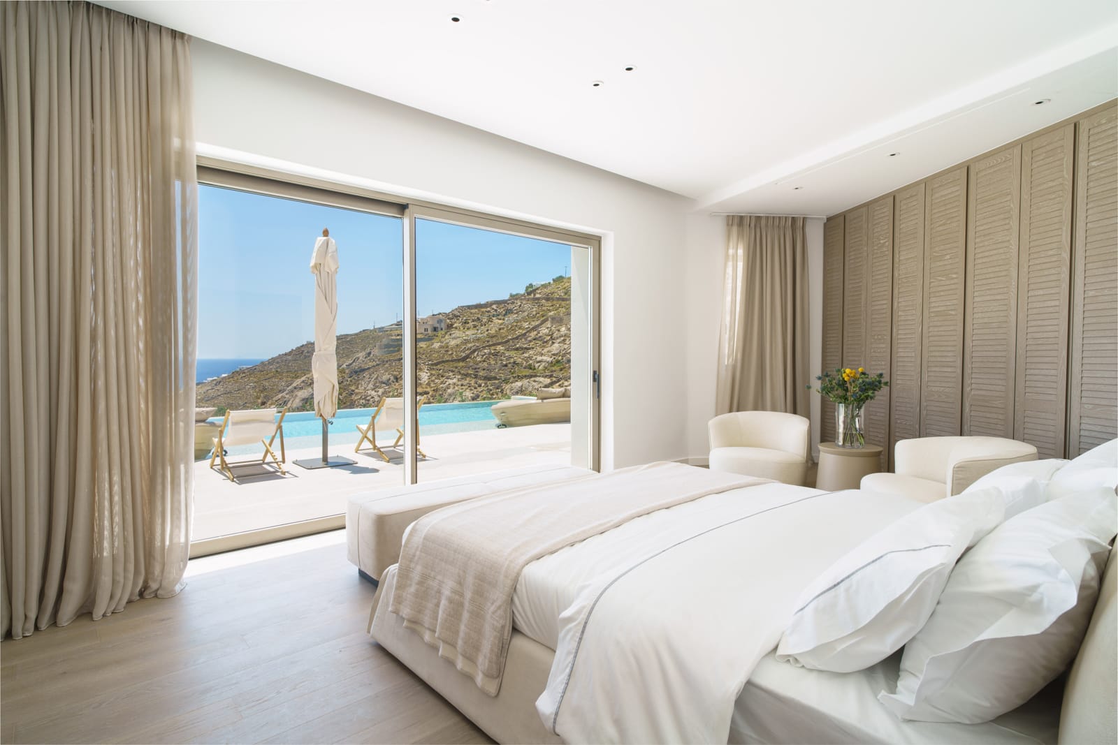 The brilliant white interiors match the exteriors while the subtle, tasteful minimal decorations both reflect and contrast the Mykonian elegance the island is known for.