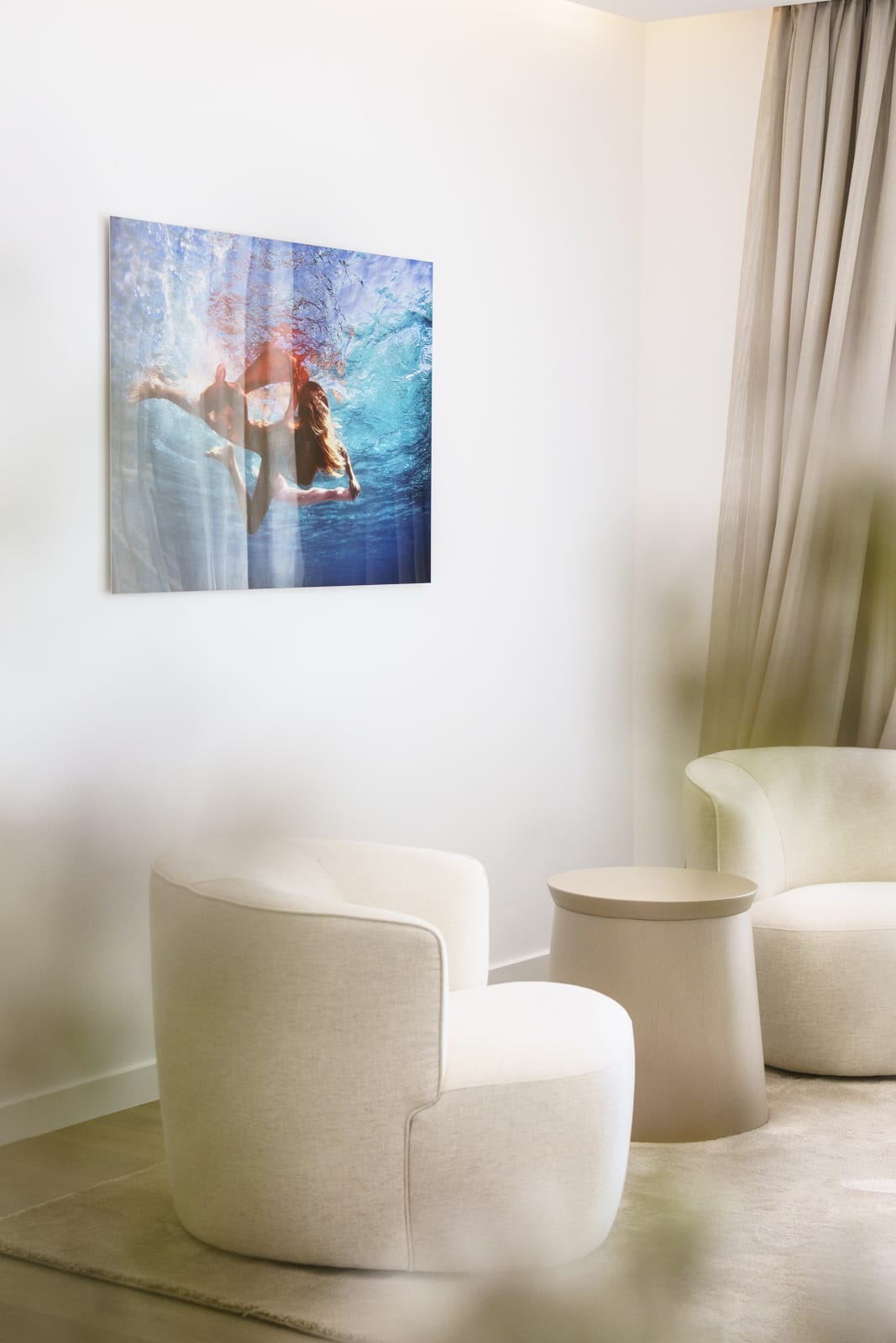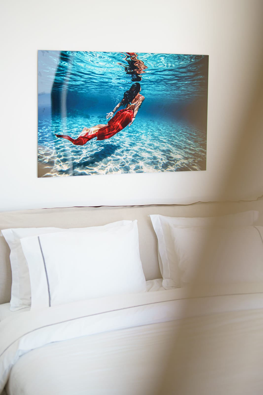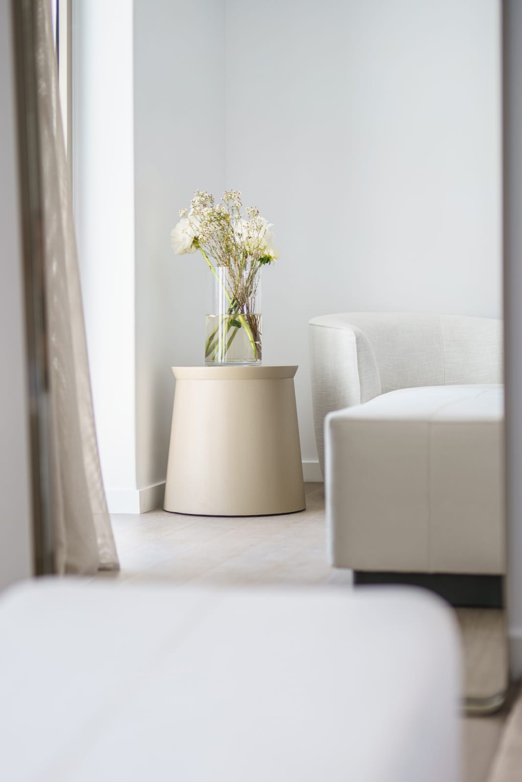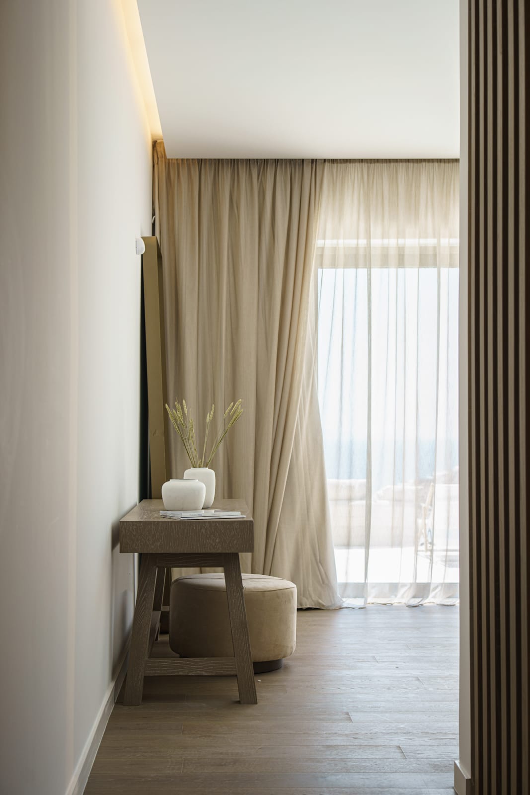 The brilliant white interiors match the exteriors while the subtle, tasteful minimal decorations both reflect and contrast the Mykonian elegance the island is known for.