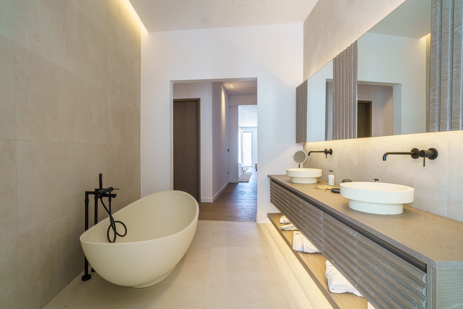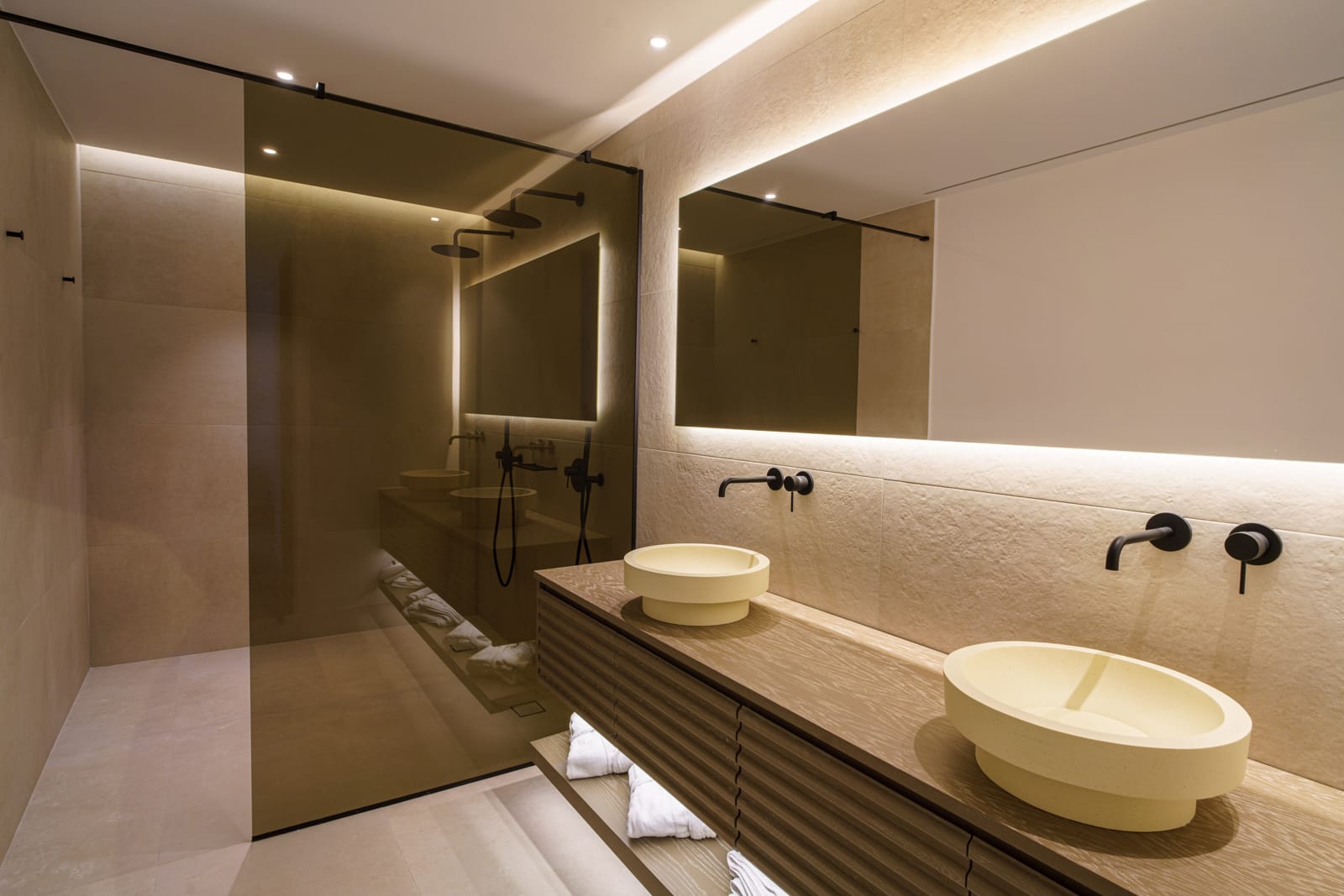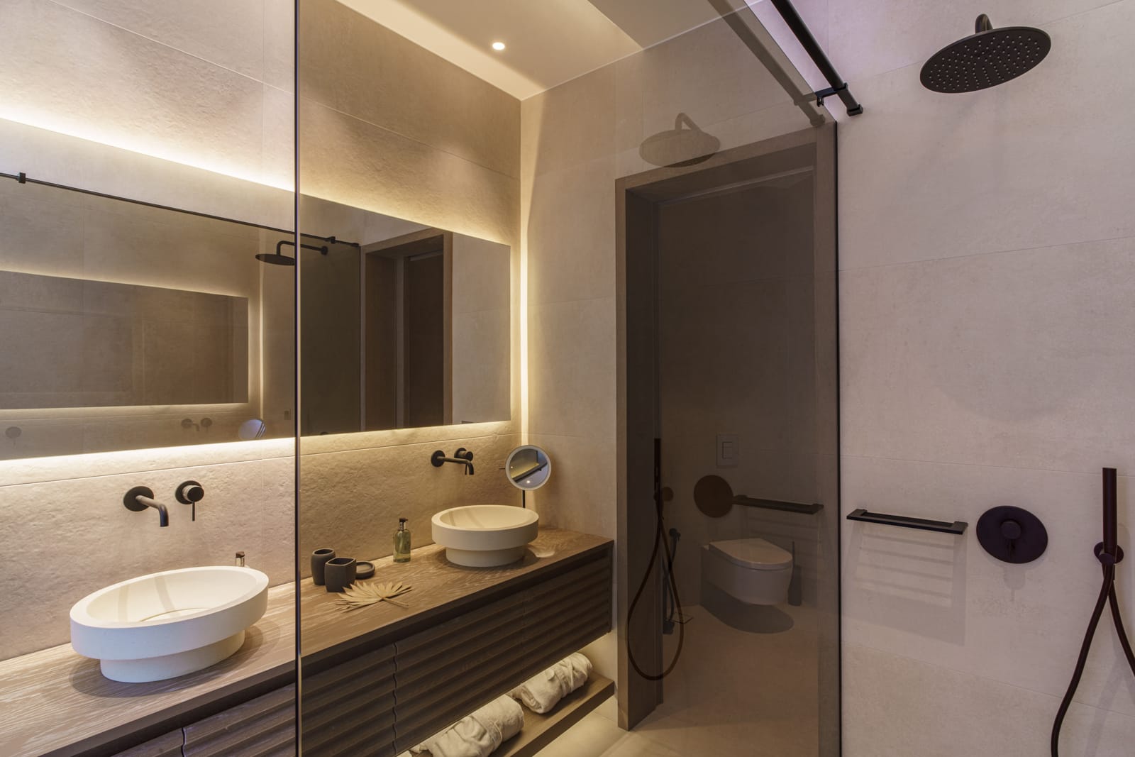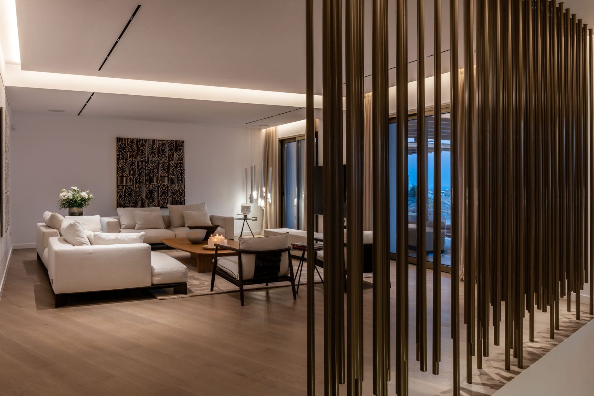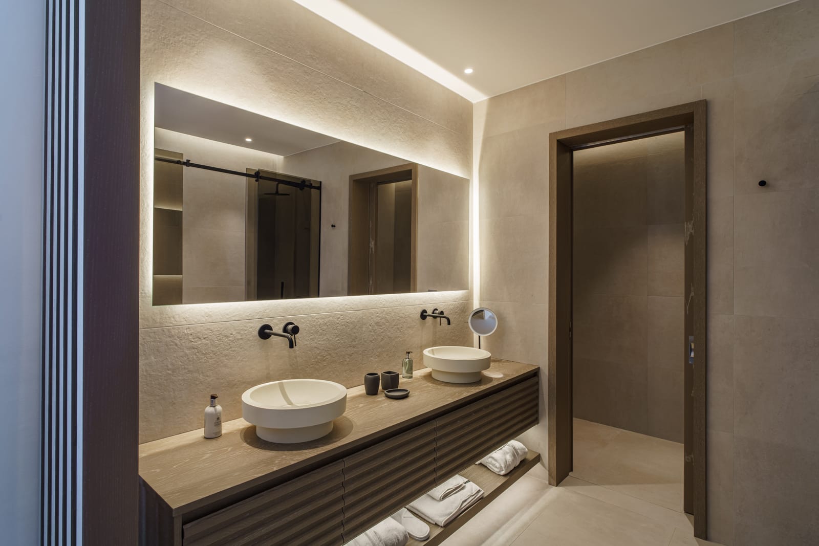 The enormous outdoor spaces are perfectly designed to offer true moments of relaxation and all-day fun in the alfresco BBQ and kitchen, in the surreal lounging and dining areas, in the private luxurious pool bar, as well as the two huge pools (27sm & 18sm with jacuzzi), located on different levels for total privacy. No need to reveal that there is a kids’ pool and that one infinity pool can be heated upon request.