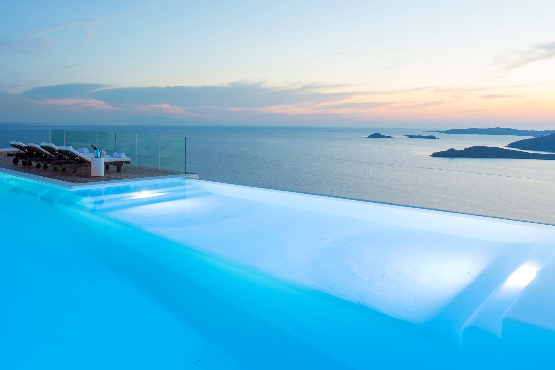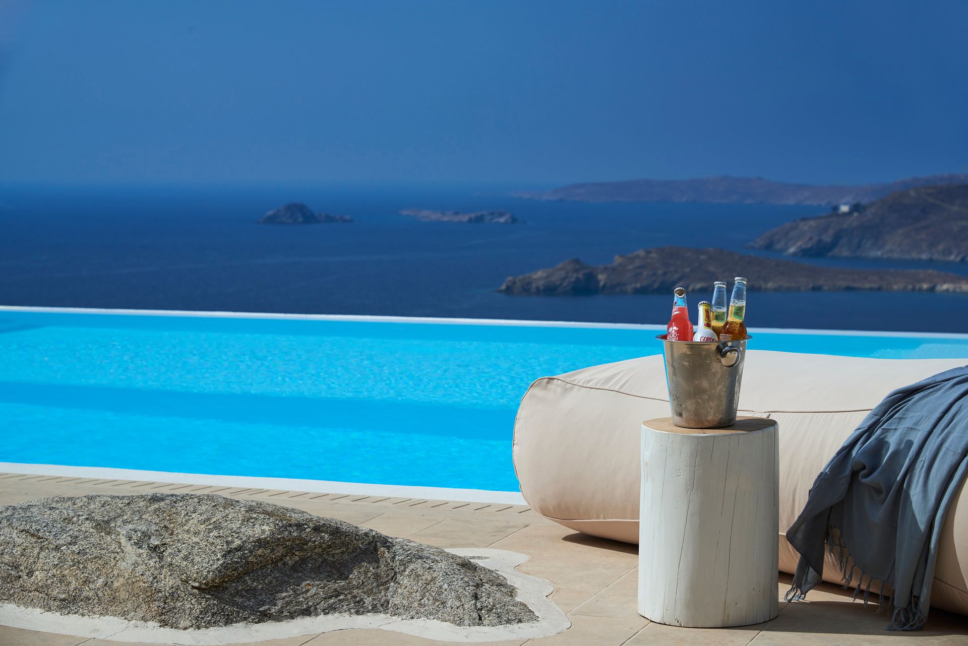 This exceptional residence enjoys one of the most magnificent views in Mykonos, over the gulf of Ornos, towards numerous islands, starting from Delos and Renia till the endless blue of the Aegean sea. Just minutes from Psarou beach and less than 3 km from town center, Callirhoe is located on the unique spot of Agios Lazaros, overhanging at the very edge of the rocky shore. Built on two levels with spacious outdoor areas, infinity swimming pool with a teak deck and plenty of pillowed lounges, it offers total privacy and comfortable living, exactly as you have dreamed.