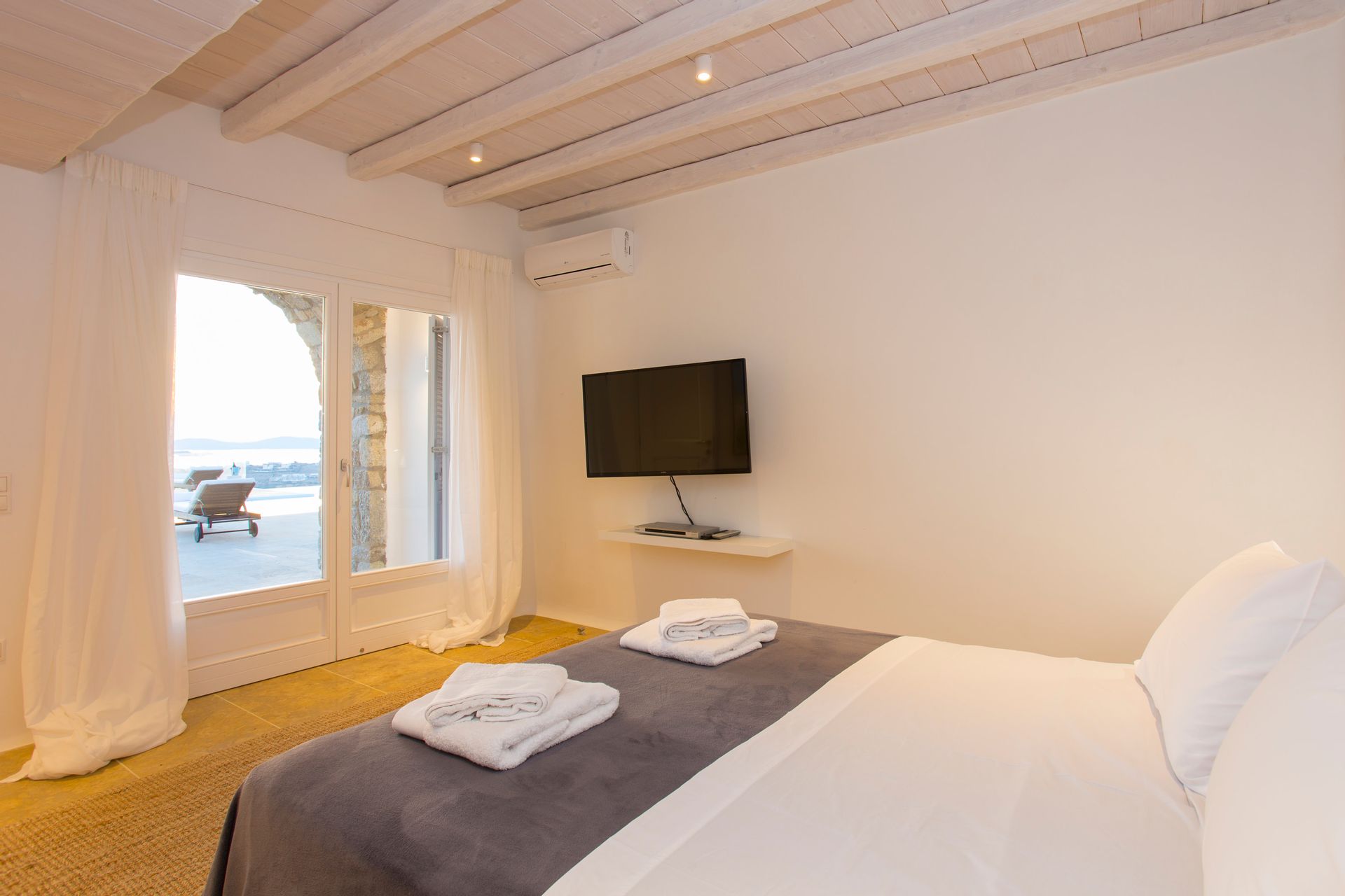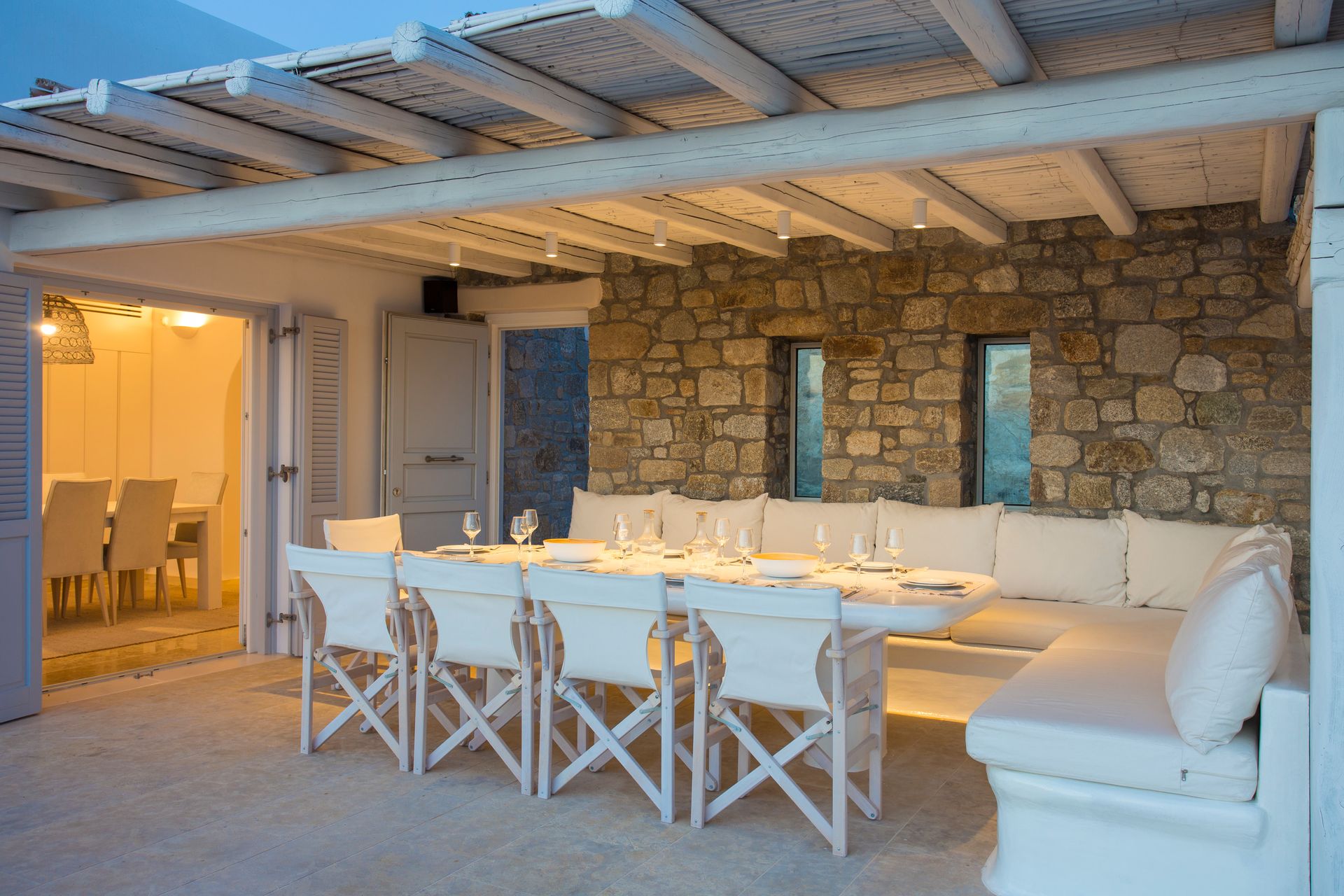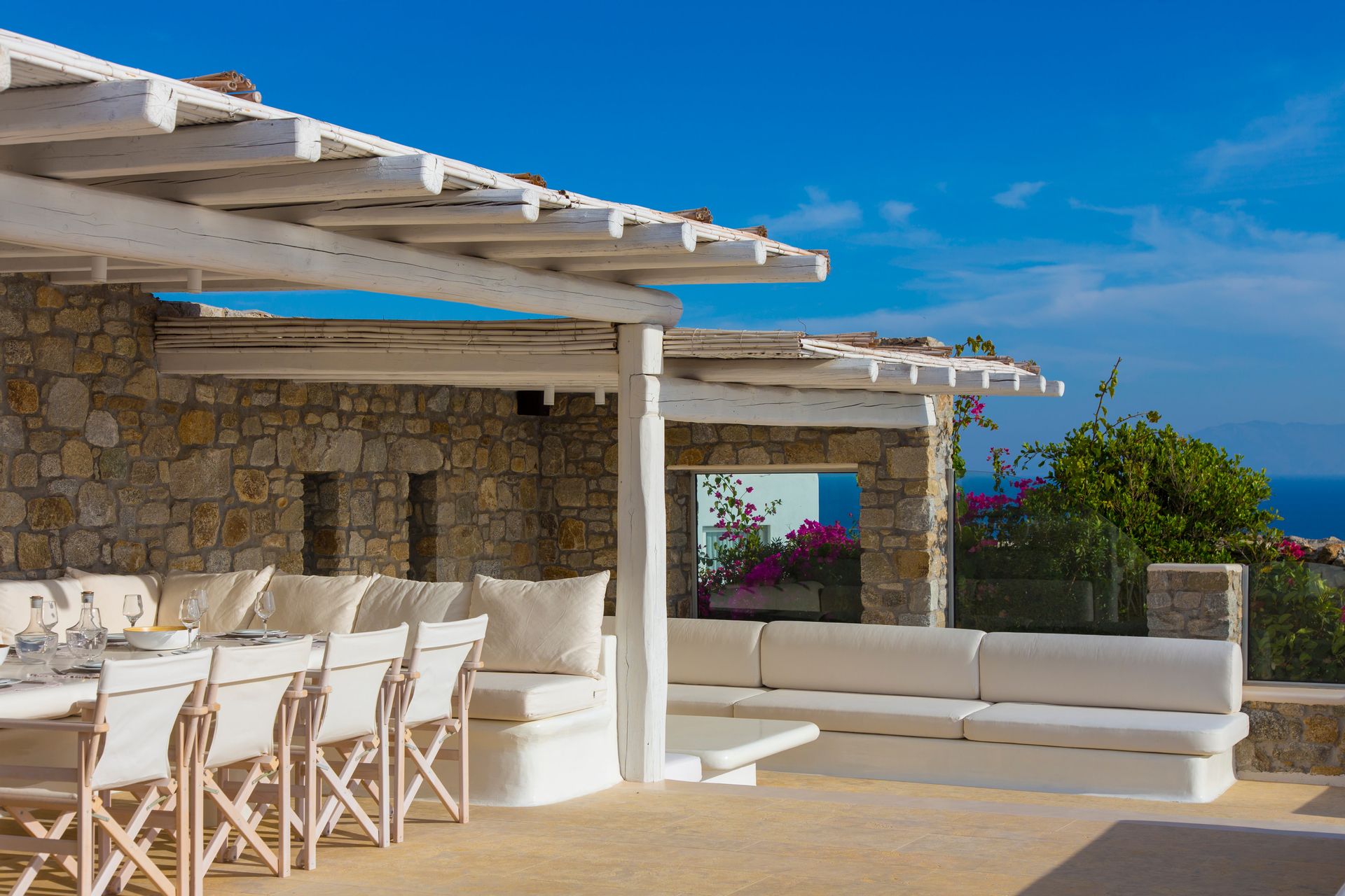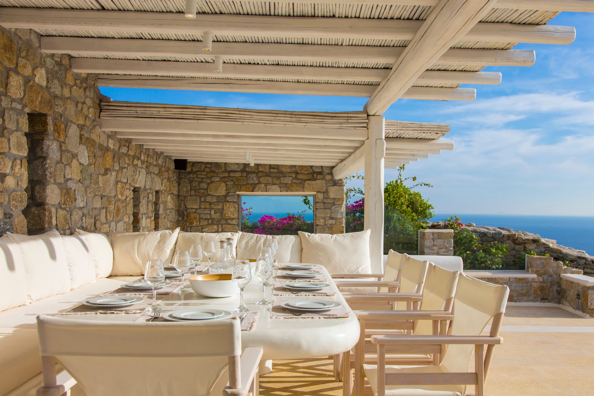 The outdoor areas fulfill every individual need in an oasis-like environment, from every aspect. The deck, almost floating above the waves and equipped with sun loungers, is perfect for leisure days soaking up the sun and the secluded pergola ideal for shaded peaceful afternoons. The upper level consists of another pergola-covered lounge together with an outdoor dining table. After a day of exploring Mykonos, probably you will gather around, enjoying iced cocktails, staring at the spectacular sunset colors. Later at night, you will relax to the sound of sea, tranquil although the sight of Ornos with the luminous yachts will definitely remind you that you are at one of the most cosmopolitan places in the world.