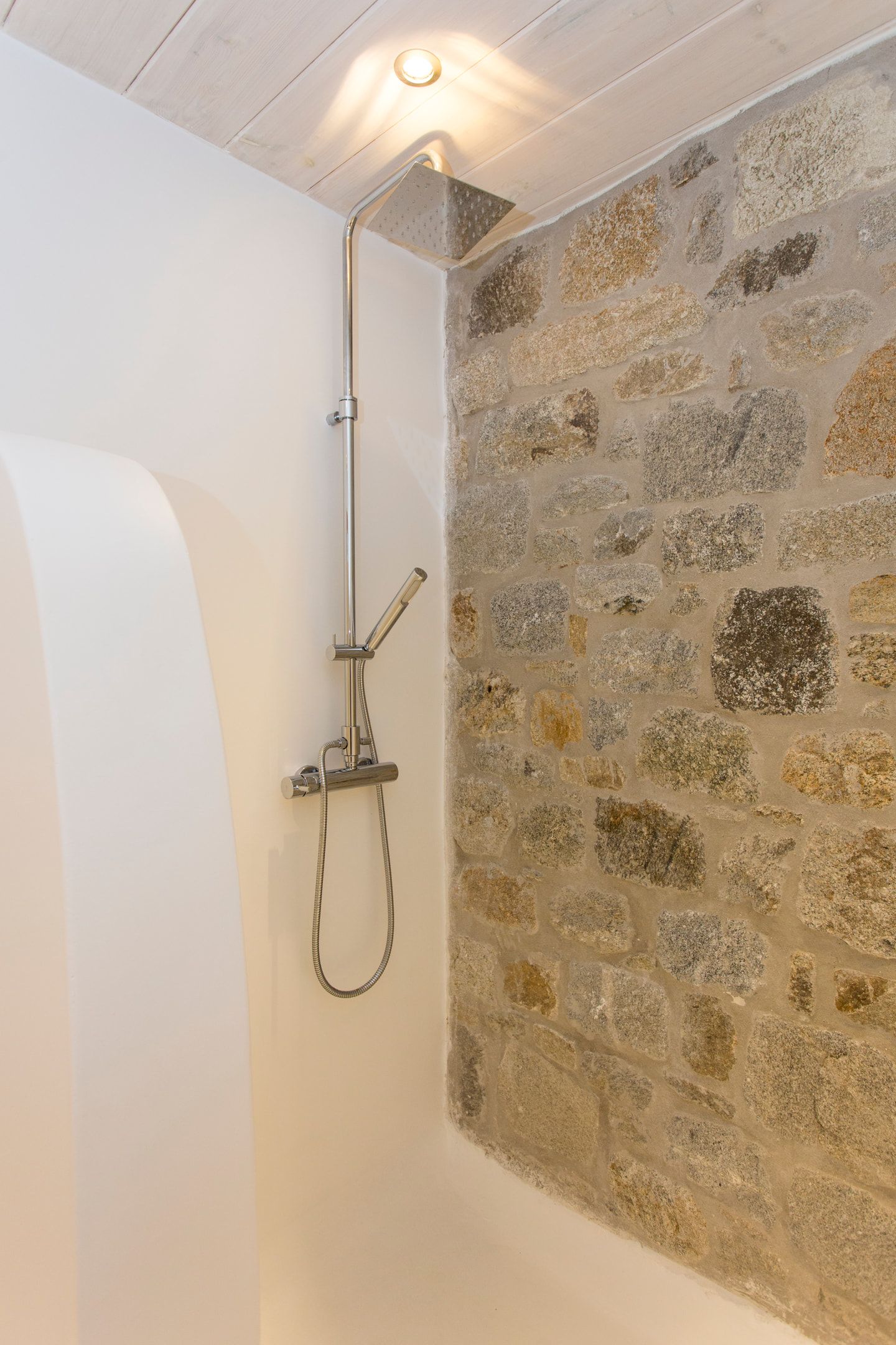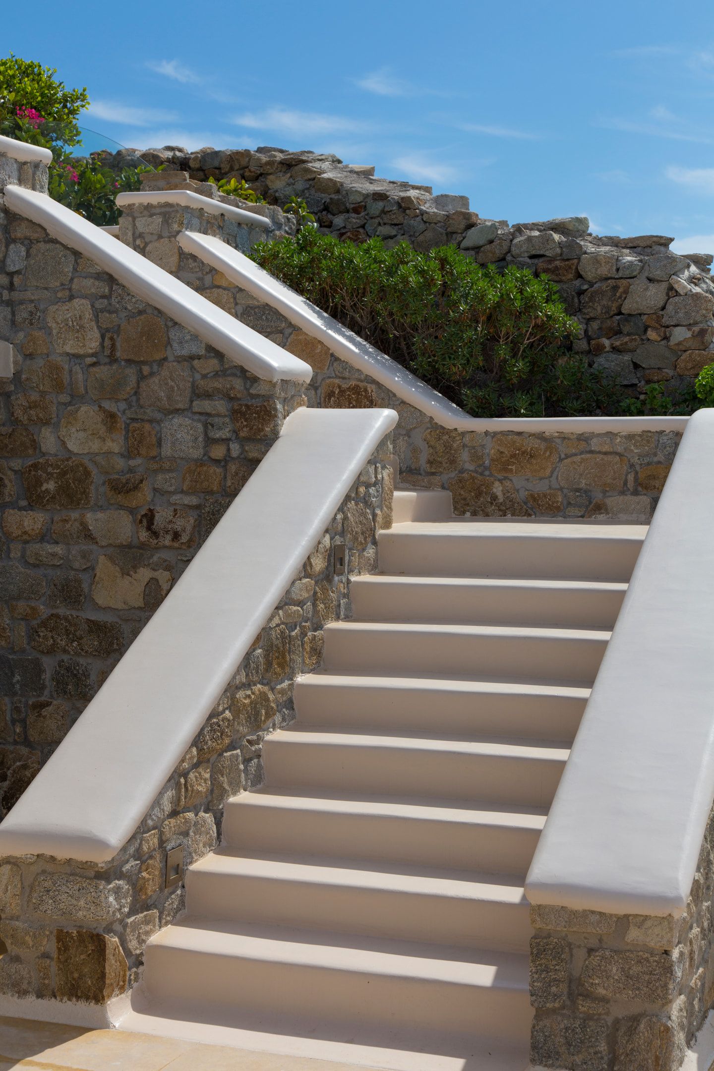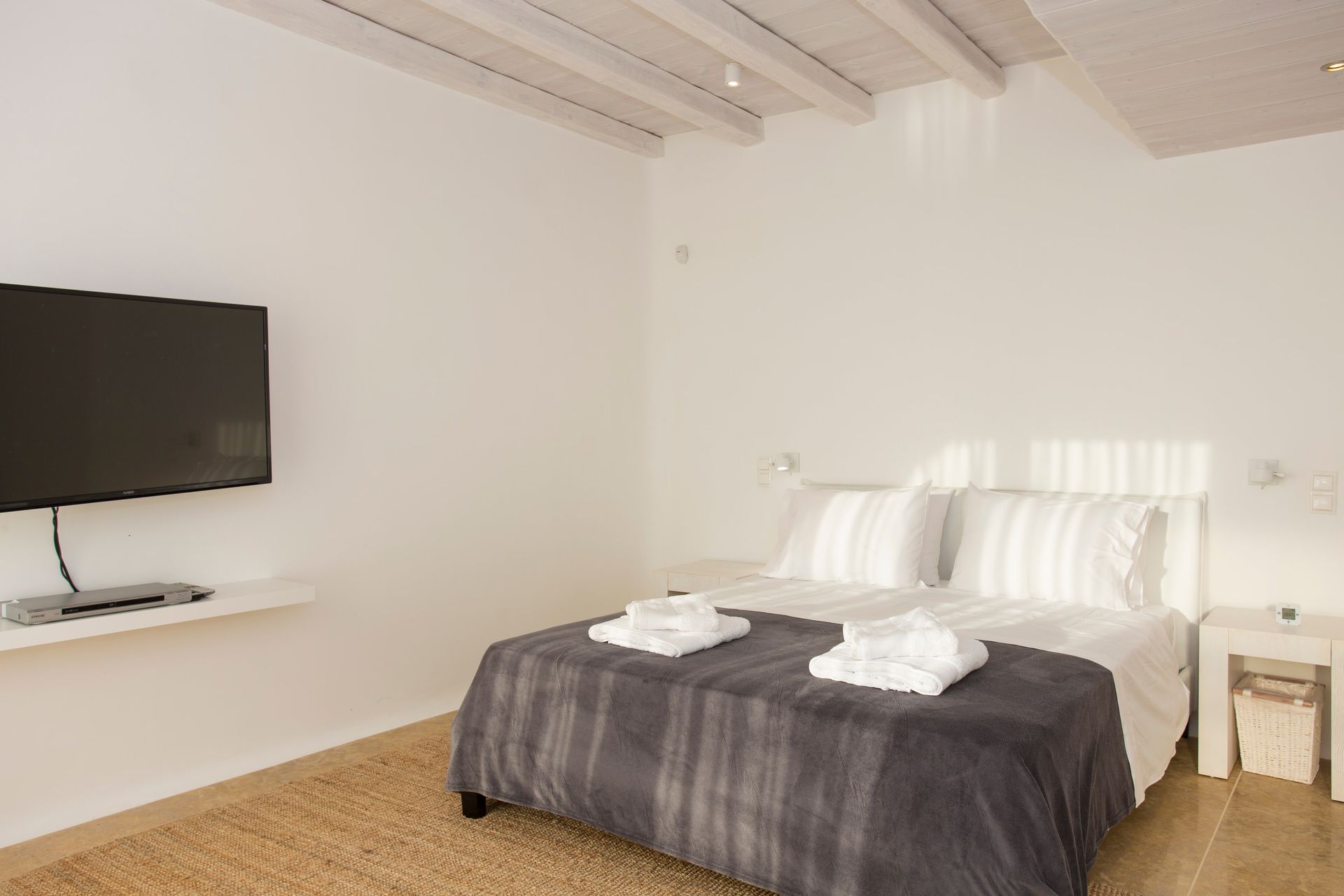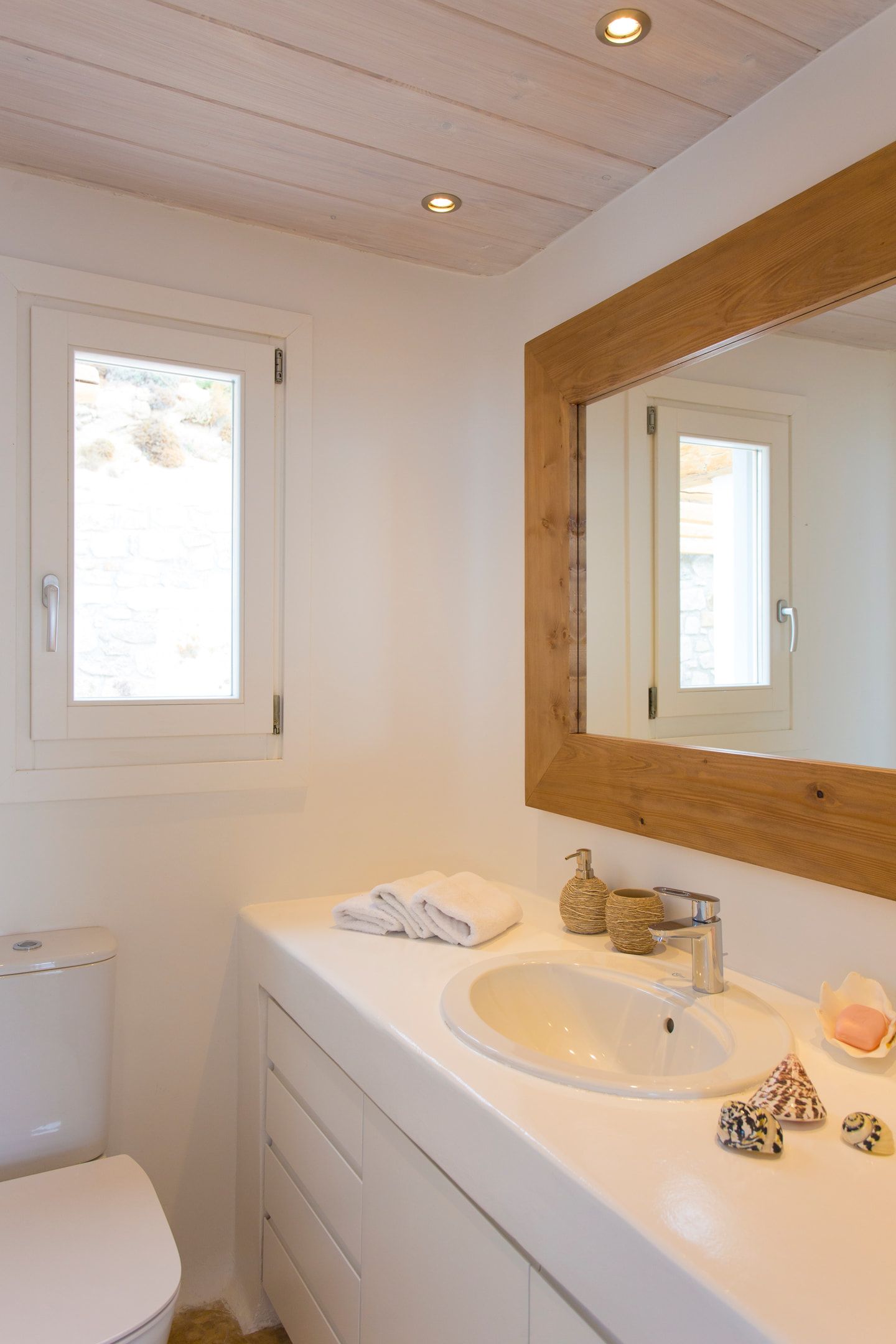 The outdoor areas fulfill every individual need in an oasis-like environment, from every aspect. The deck, almost floating above the waves and equipped with sun loungers, is perfect for leisure days soaking up the sun and the secluded pergola ideal for shaded peaceful afternoons. The upper level consists of another pergola-covered lounge together with an outdoor dining table. After a day of exploring Mykonos, probably you will gather around, enjoying iced cocktails, staring at the spectacular sunset colors. Later at night, you will relax to the sound of sea, tranquil although the sight of Ornos with the luminous yachts will definitely remind you that you are at one of the most cosmopolitan places in the world.