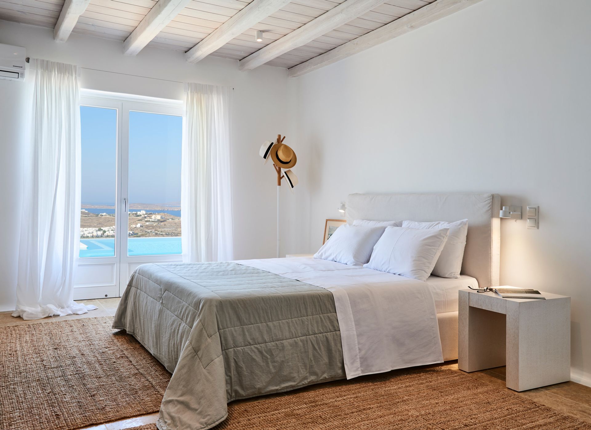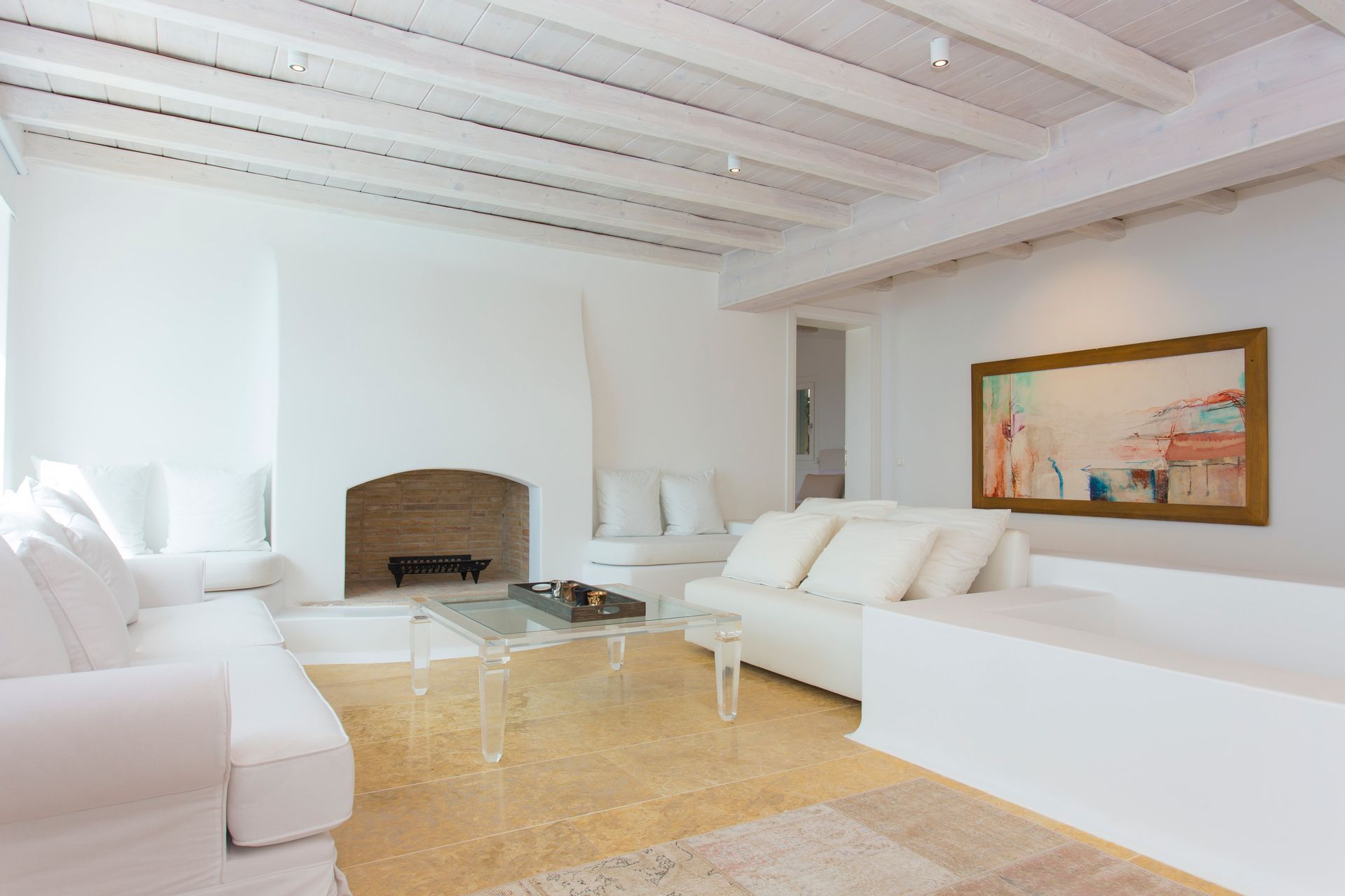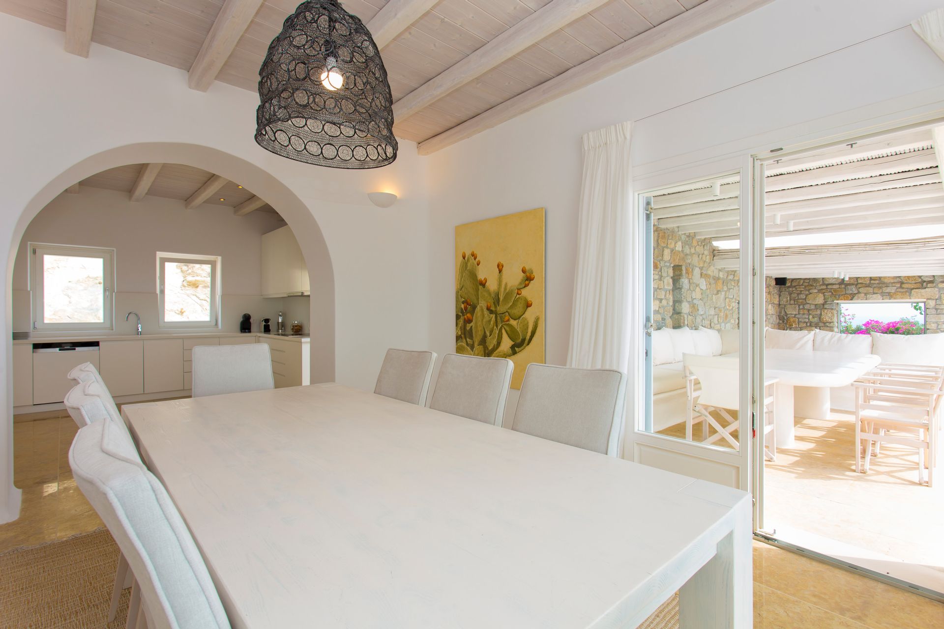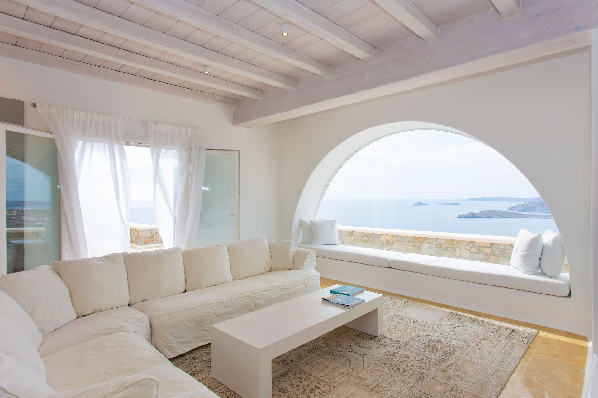 The elegant interiors, with meticulous attention to detail, blend harmoniously the Cycladic architecture with minimal aesthetics and modern art. All white-washed and generously sized with large picture windows, traditional wooden beams on the ceilings and sandy marbles on the floors, compose an impressive scenery. Even more the authentic paintings and sculptures determine the inviting atmosphere of the villa: Both calm and luxurious for you who are longing for a unique vacation home! The open plan living room around the fireplace, with white sofas and hand-made carpets is the first to start the inspiring composition. The nearby dining room and the fully equipped kitchen will undoubtedly attract you to spend time also indoors. As for the six bedrooms, all with en-suite bathrooms, they are suitable for sleeping in comfort and style, looking directly at the sea even when you are lying in bed. Decorated and furnished in earth light tones, each one differs from the others, tailored to meet the highest expectations.