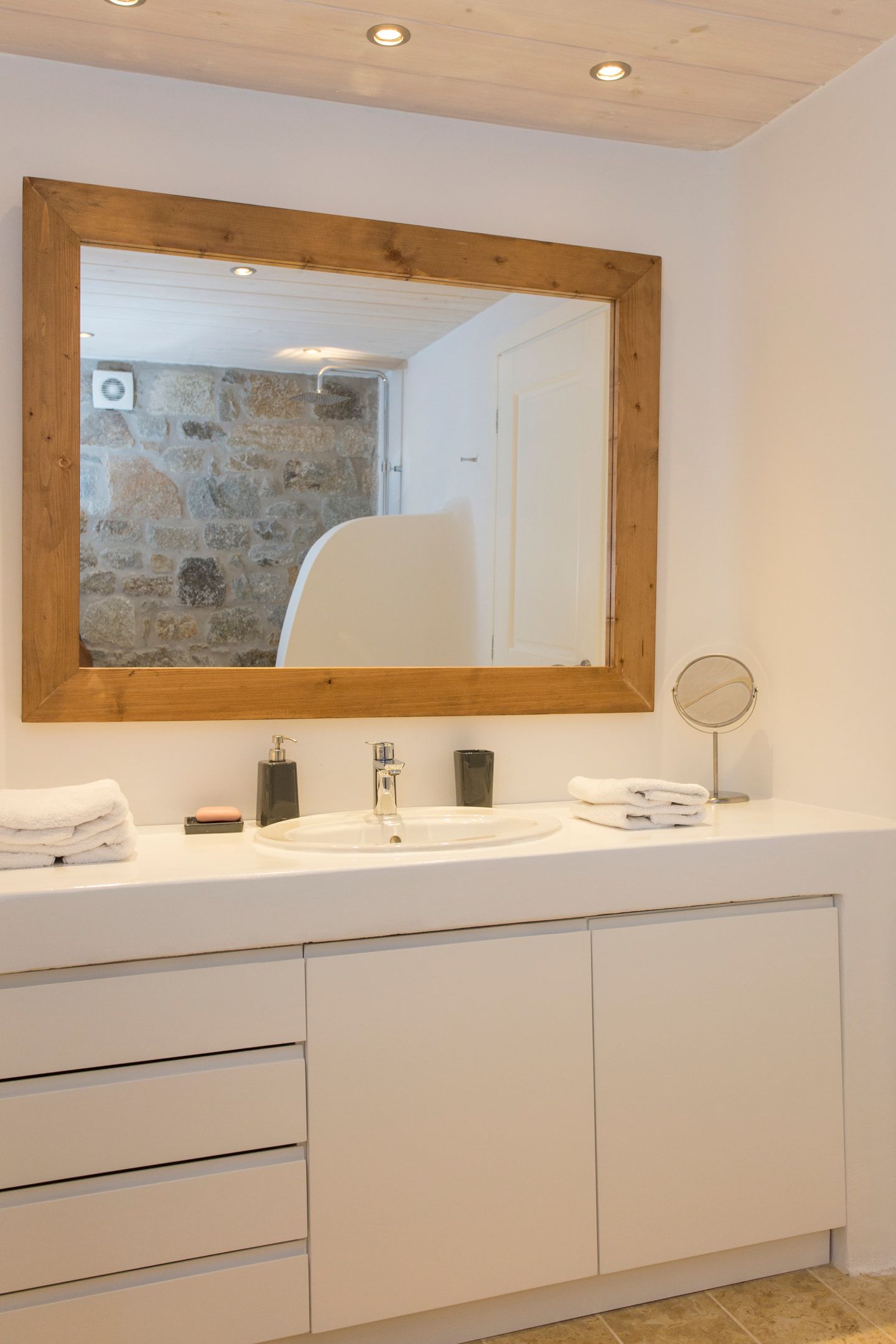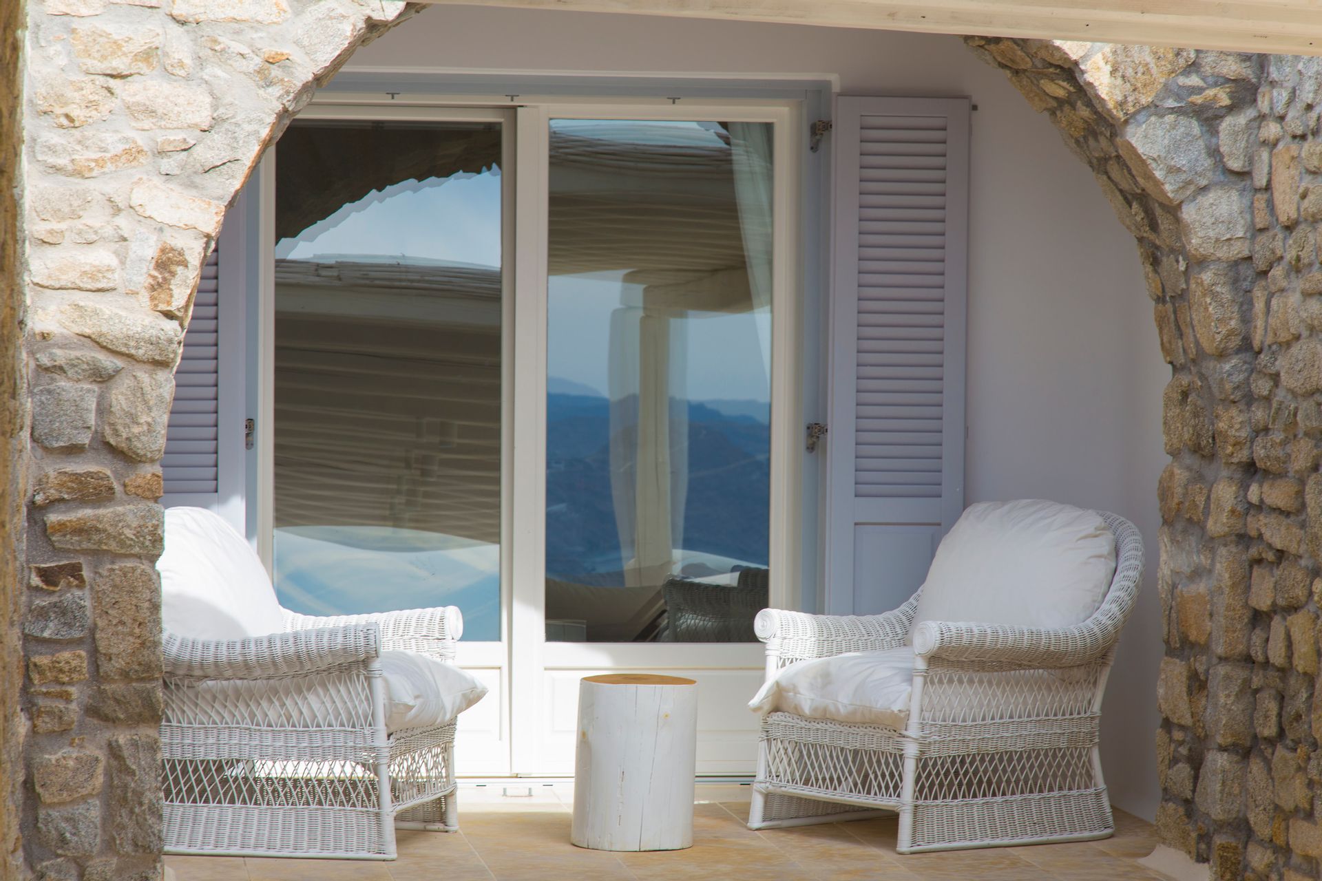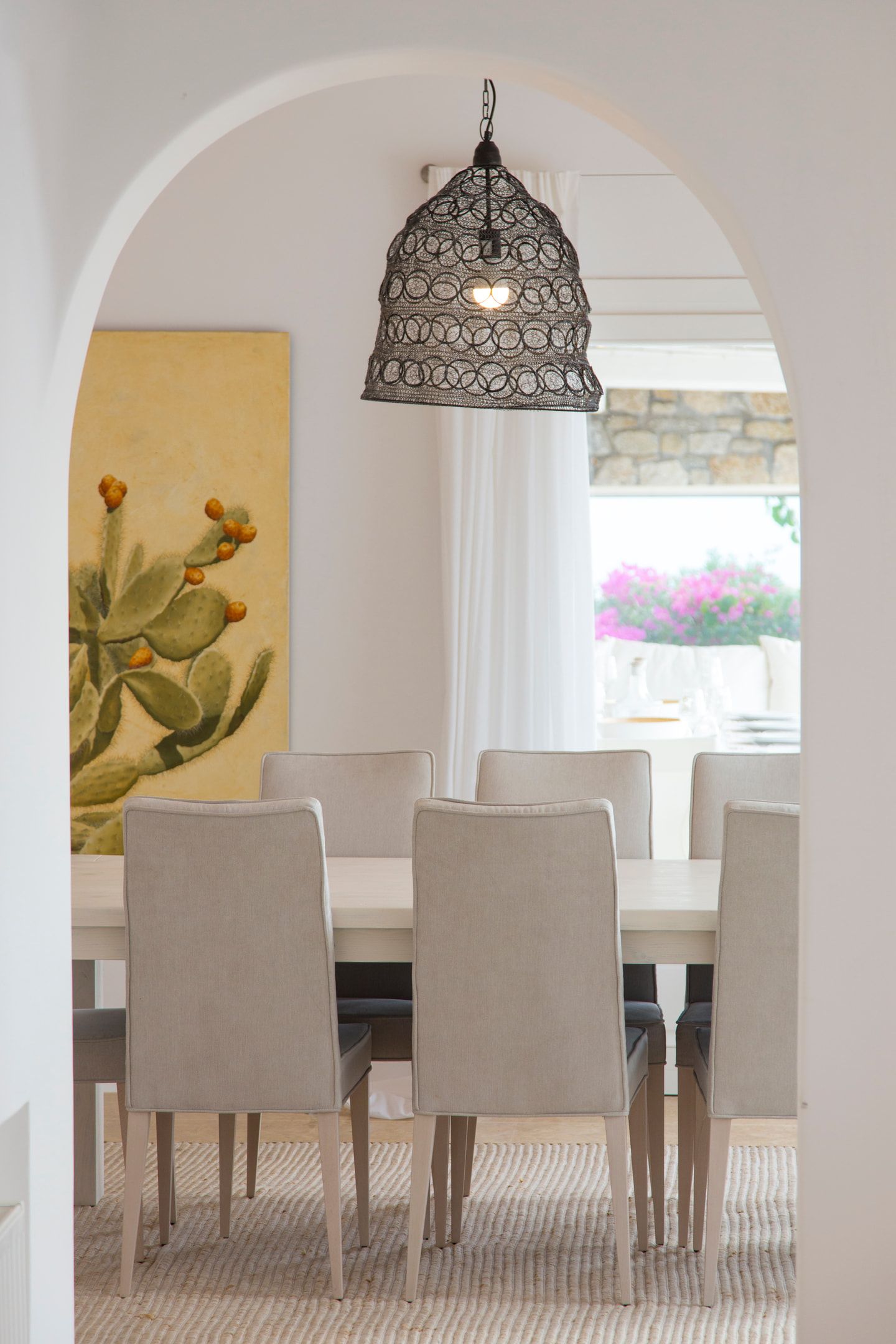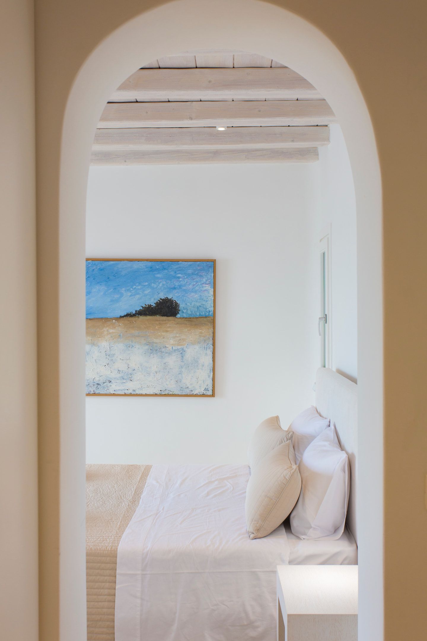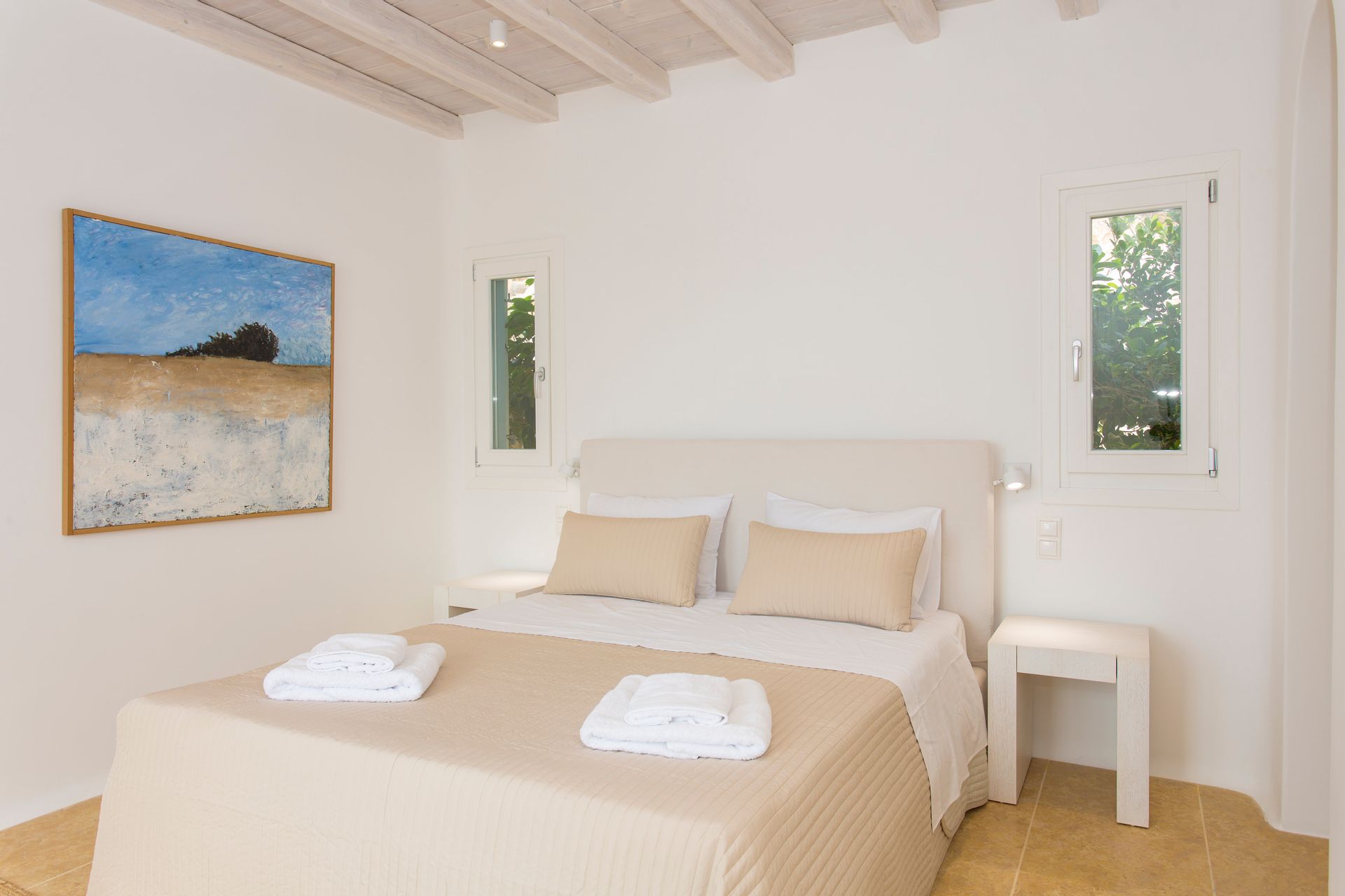 The elegant interiors, with meticulous attention to detail, blend harmoniously the Cycladic architecture with minimal aesthetics and modern art. All white-washed and generously sized with large picture windows, traditional wooden beams on the ceilings and sandy marbles on the floors, compose an impressive scenery. Even more the authentic paintings and sculptures determine the inviting atmosphere of the villa: Both calm and luxurious for you who are longing for a unique vacation home! The open plan living room around the fireplace, with white sofas and hand-made carpets is the first to start the inspiring composition. The nearby dining room and the fully equipped kitchen will undoubtedly attract you to spend time also indoors. As for the six bedrooms, all with en-suite bathrooms, they are suitable for sleeping in comfort and style, looking directly at the sea even when you are lying in bed. Decorated and furnished in earth light tones, each one differs from the others, tailored to meet the highest expectations.