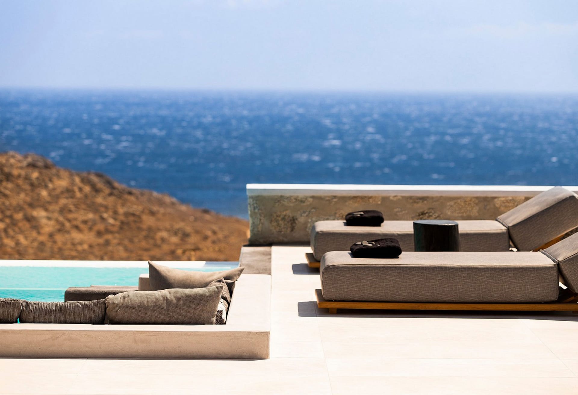 The villa’s expansive terrace is an outdoor sanctuary. Centered around a heated infinity pool (heating upon request), the space also includes stylish sun loungers, a shaded alfresco dining area, and cozy lounge spots for entertaining or unwinding. The panoramic views of the Aegean Sea and spectacular sunsets create a magical atmosphere for any time of day.