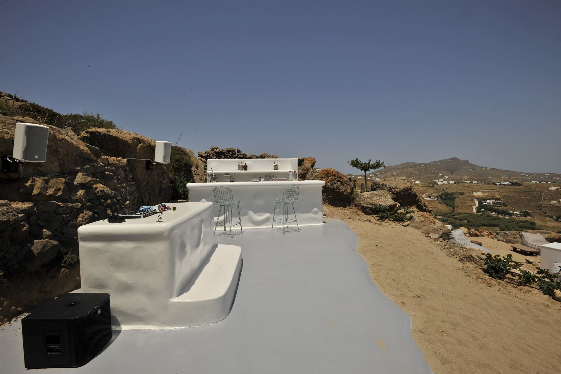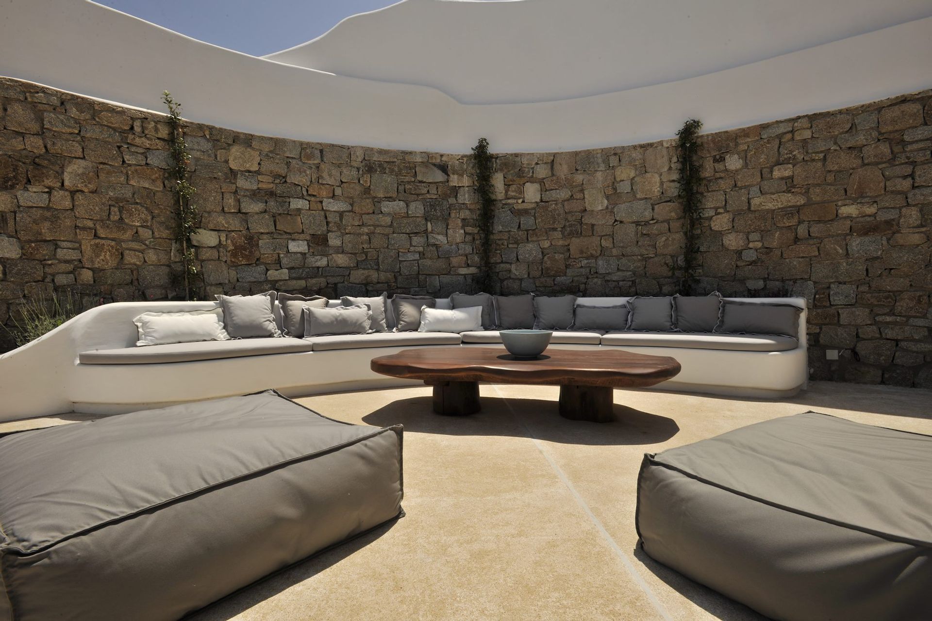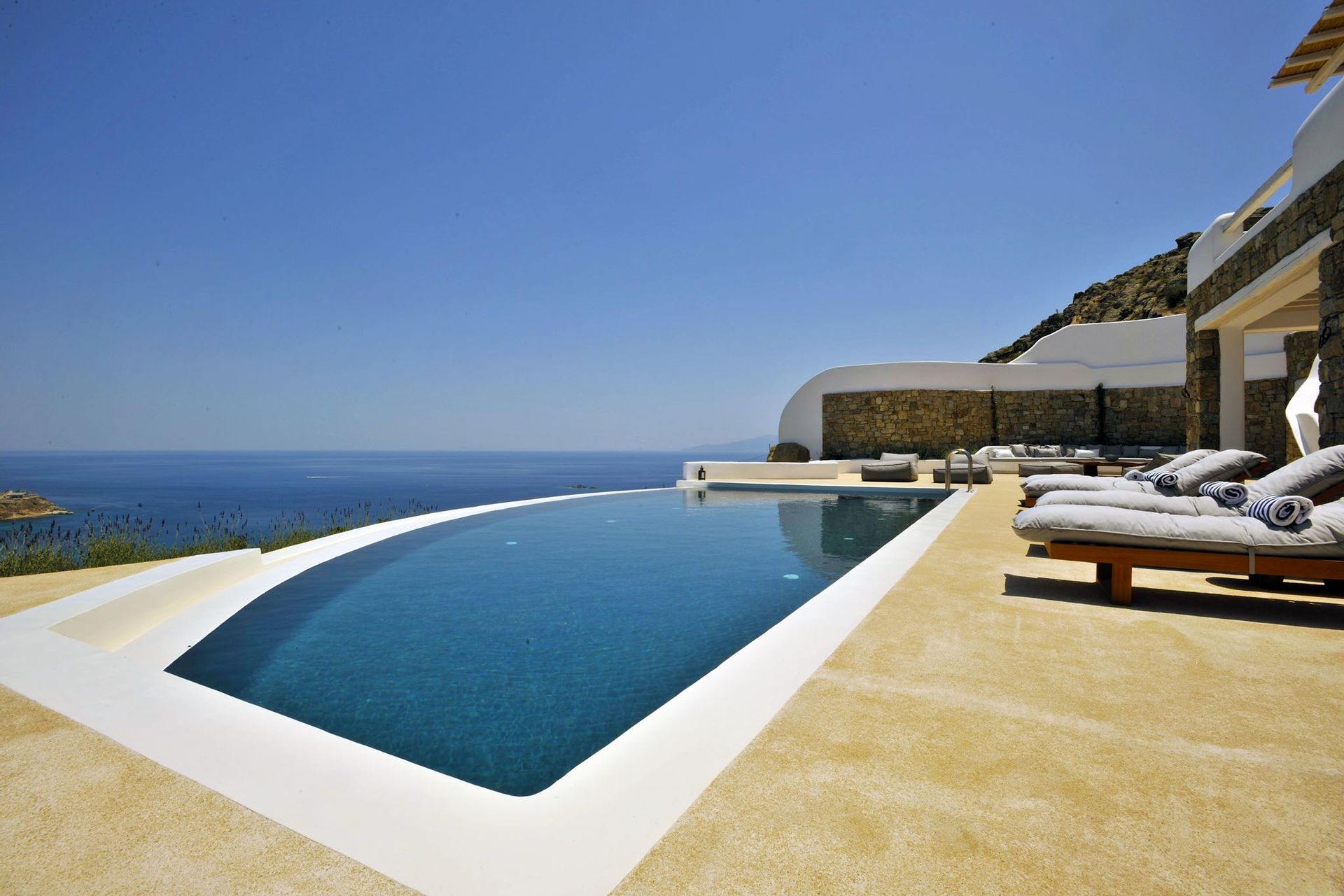 Mykonos is renowned for it’s party side as well as it’s natural beauty, so we have created a bar in the surrounding moutaniside for you to use before or after going out on the town. And to top things off, there is a small screening area, perfect for all movie enthusiasts who just want to unwind in front of a big screen. All of the furniture is part of a private collection, imported from Italy, Bali and many old Greek pieces that were recently restored, giving the villa an authentic yet edgy feel.