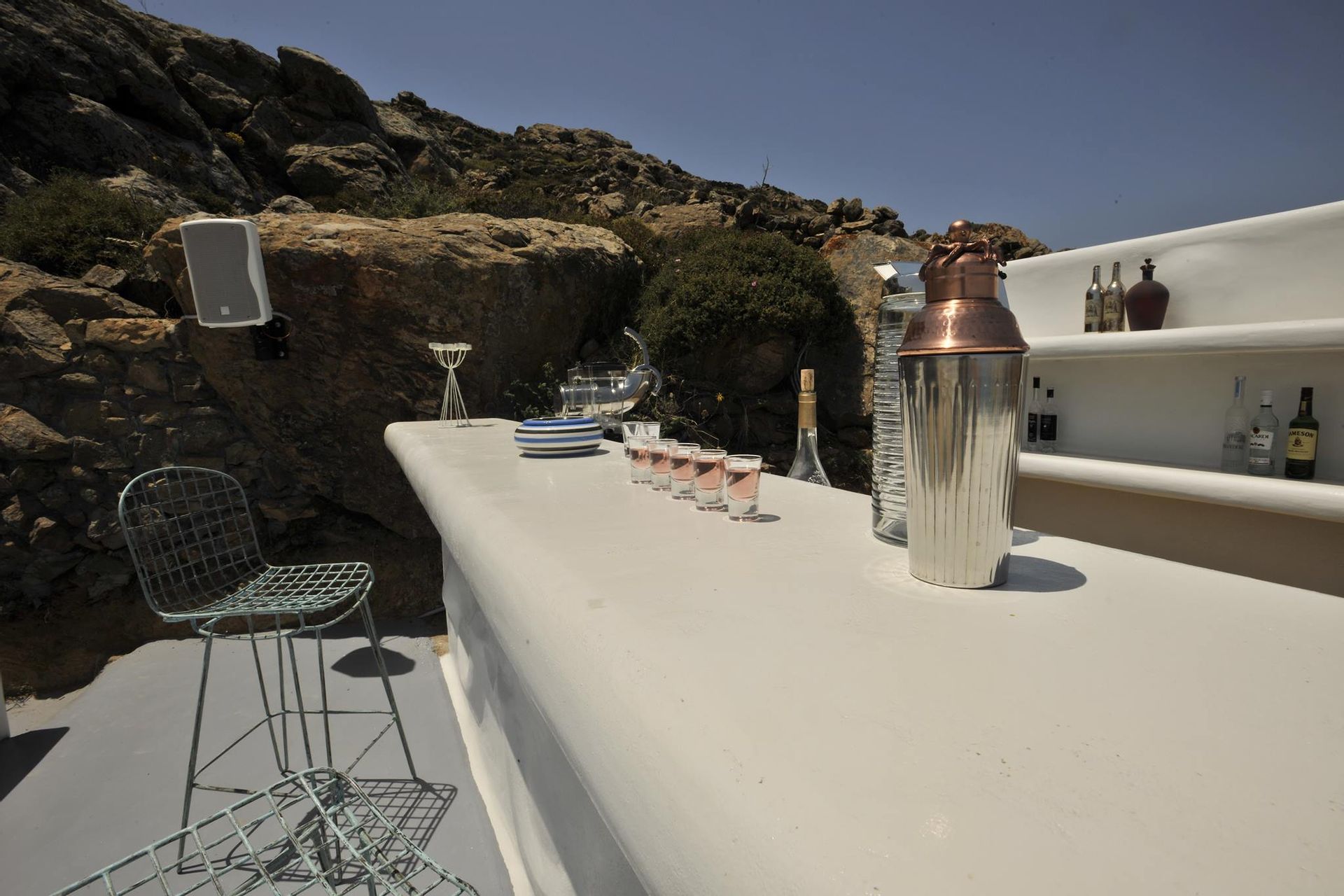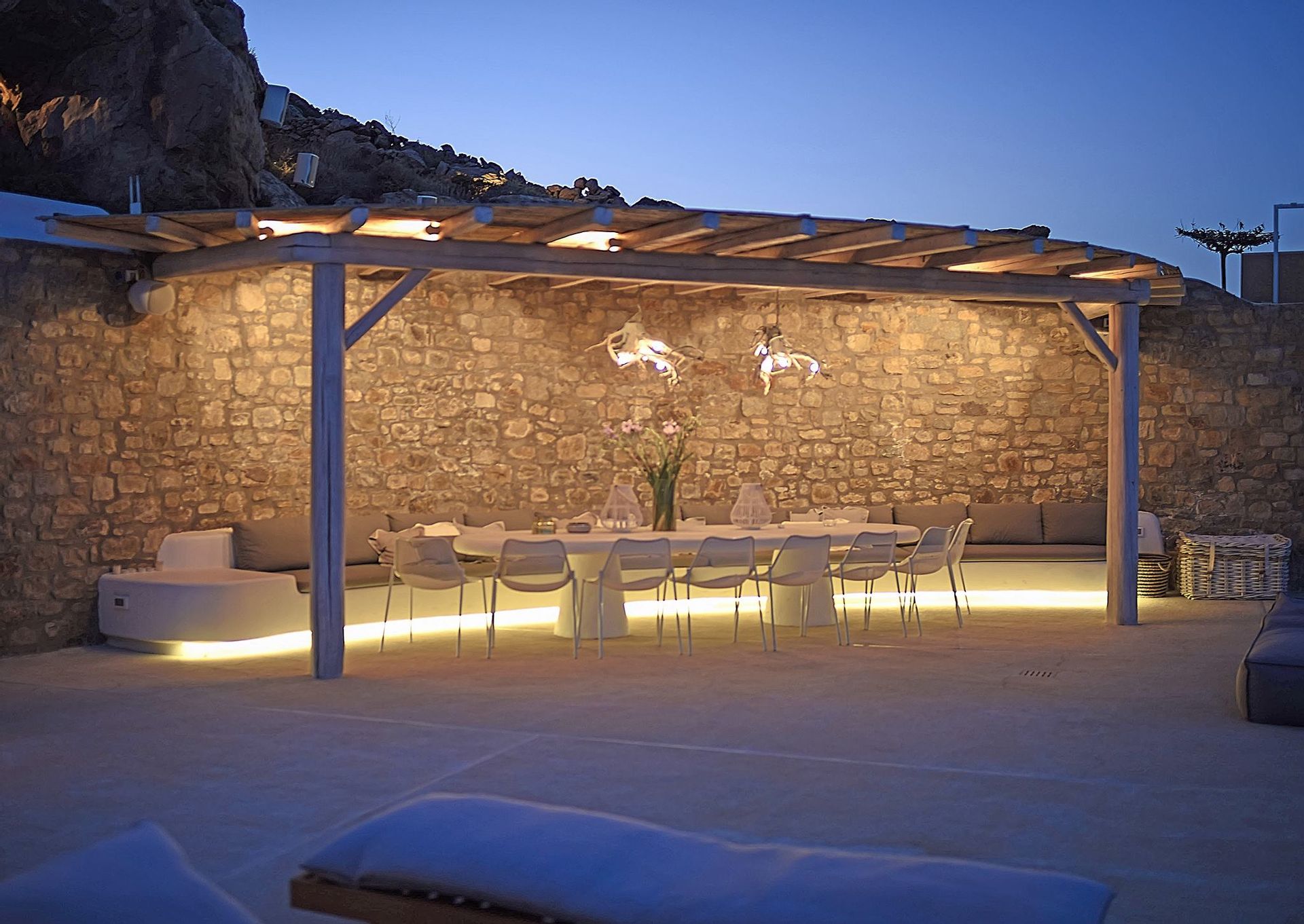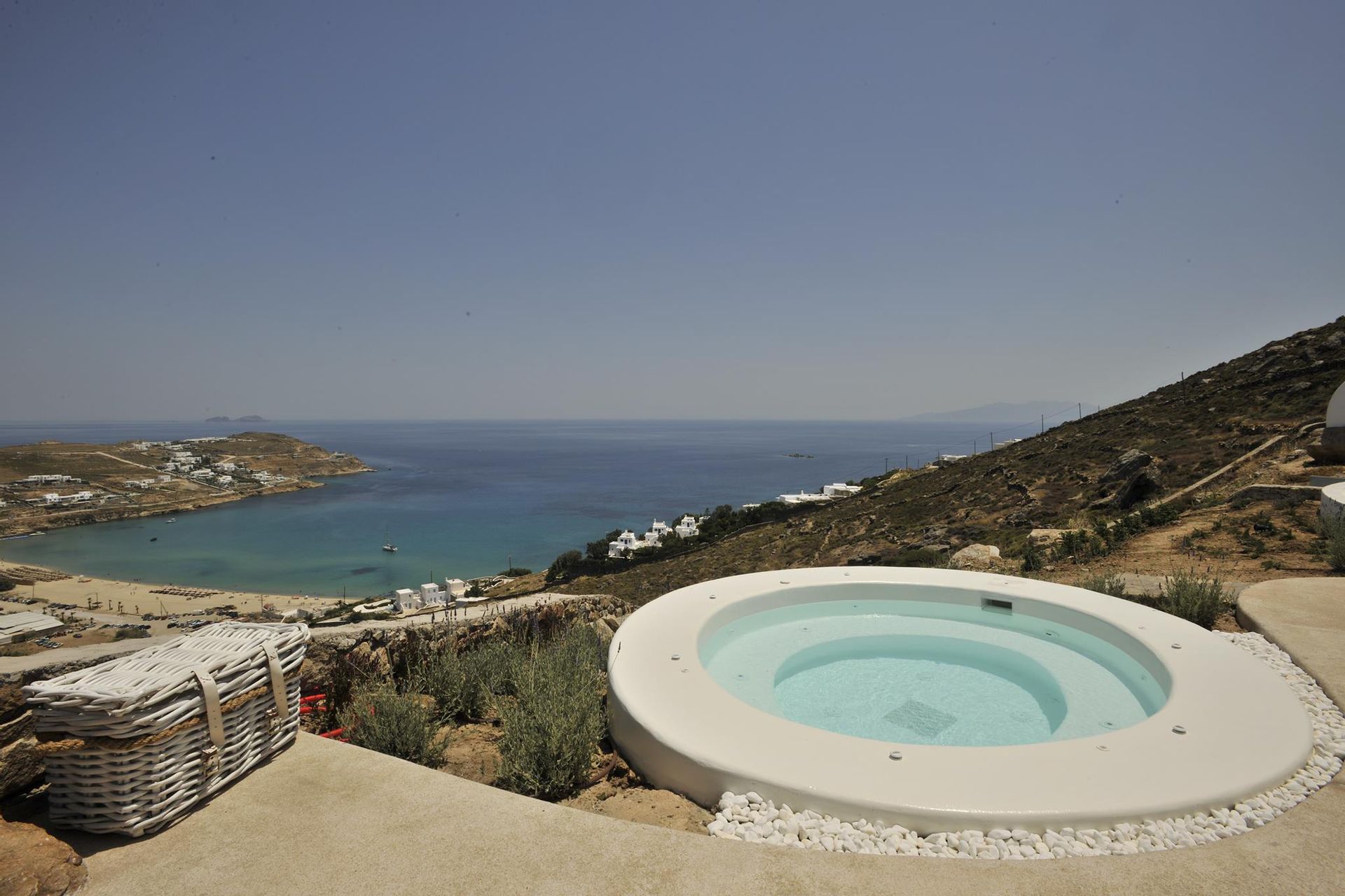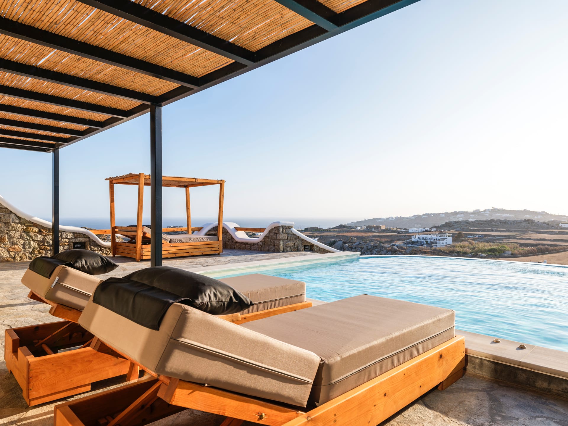 The exterior is where the fun truly begins. At your disposal you will have the perfect space for entertaining, relaxing and just enjoying your stay. Whether you’re sitting in the hot-tub listening to the waves rolling in below, or having a full-on barbeque for 25 people, you will do it with an beautiful backdrop of the aegean sea and all of it’s colours. There are more than 6 different chill-out areas, ensuring you will never get bored of being in the same spot.