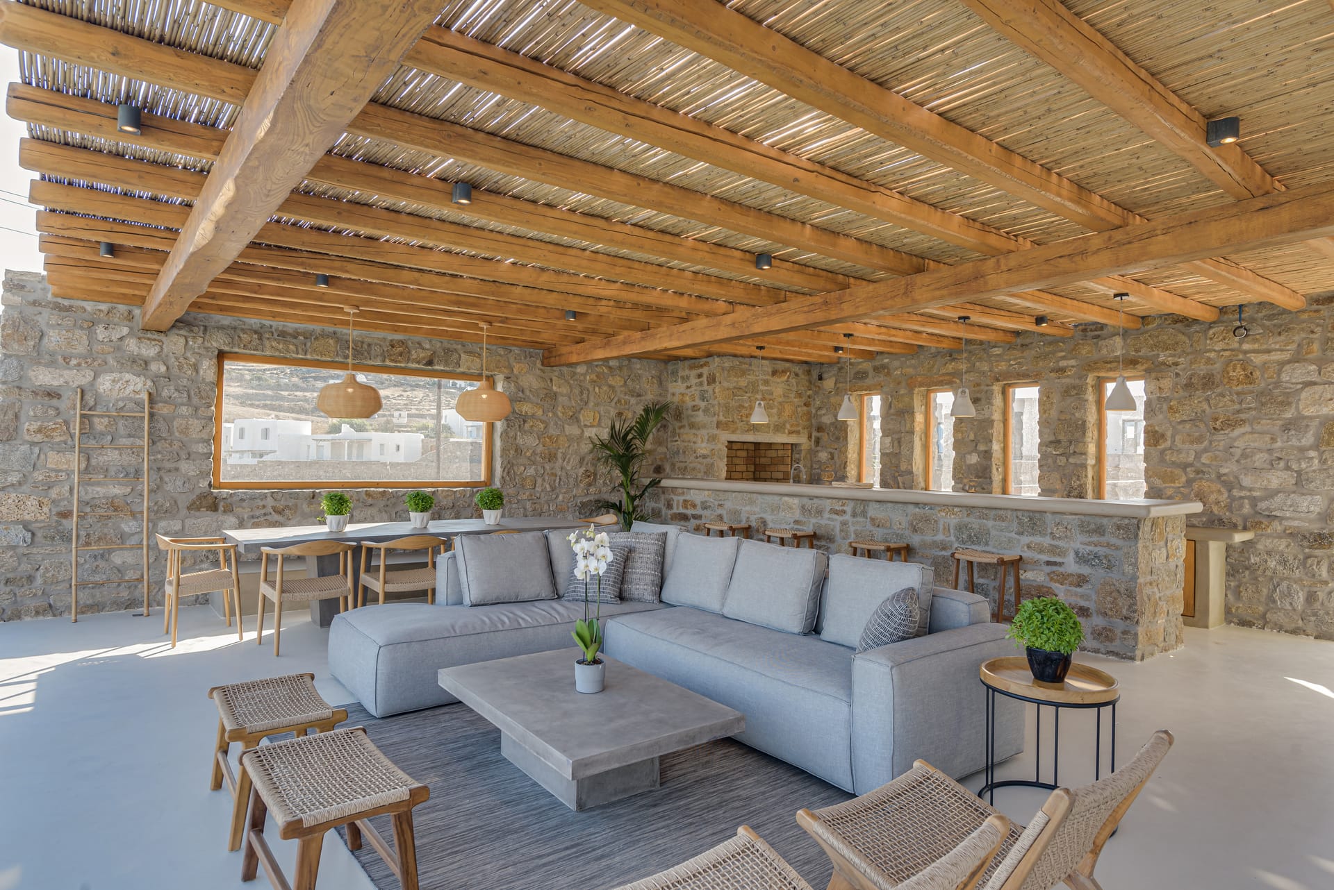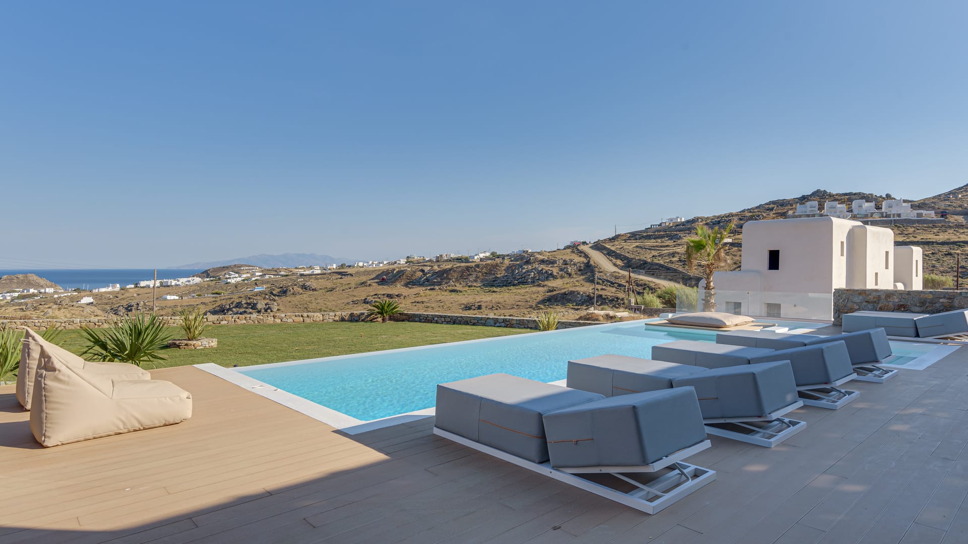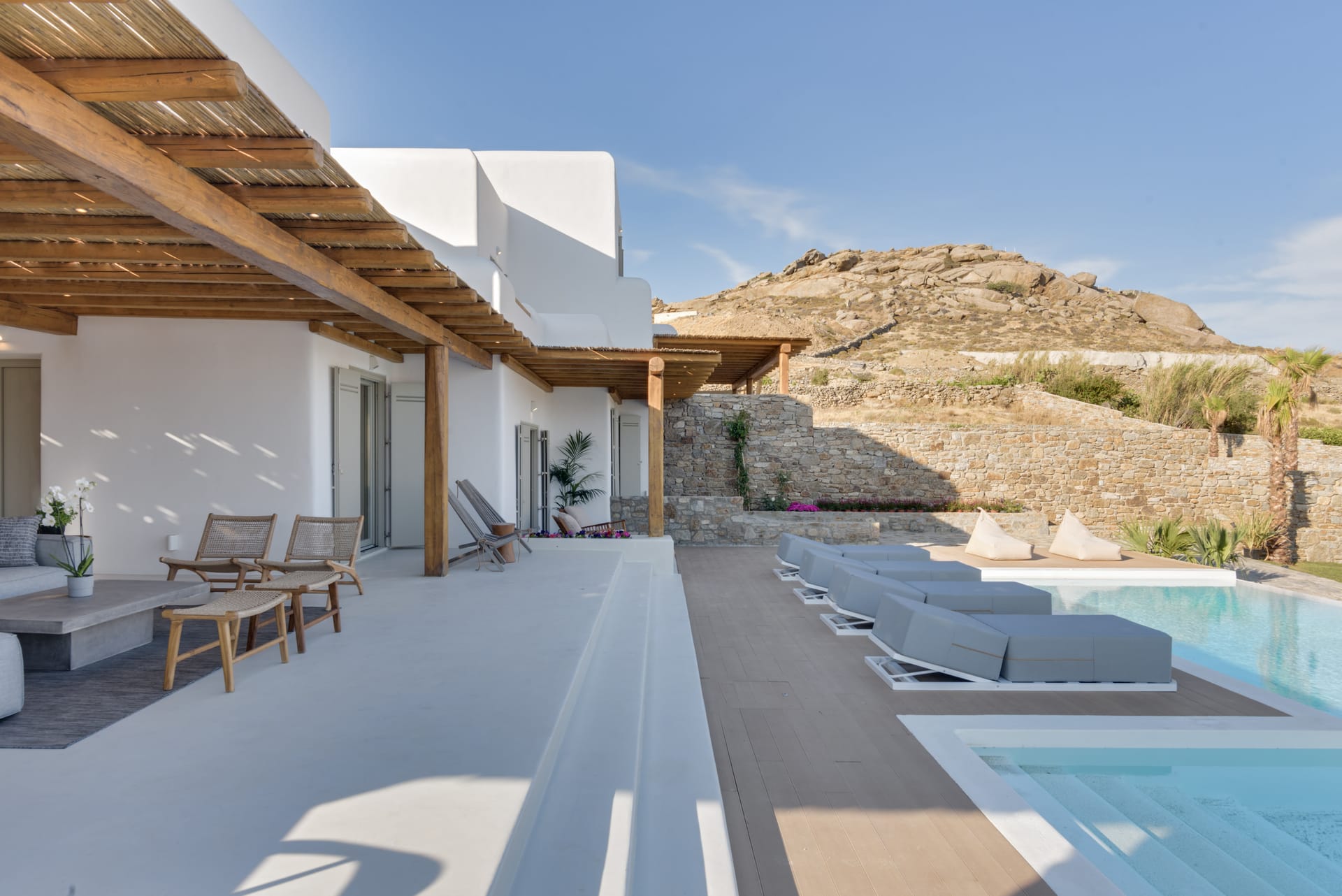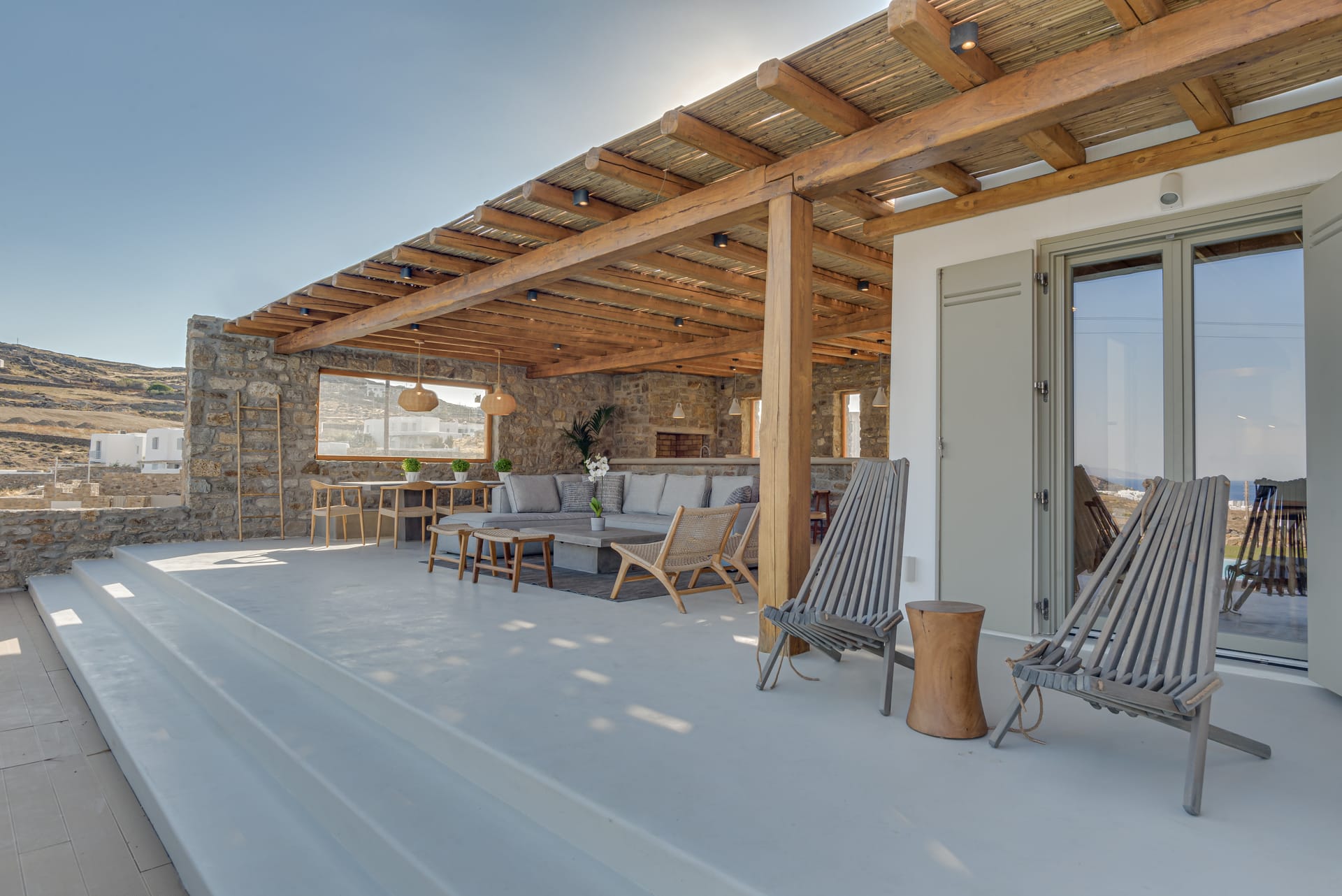 You can enjoy the magnificent view, sitting in the 10-person outdoor dining room, the stone bar with BBQ, the built-in seating areas, and the sofas on different levels.