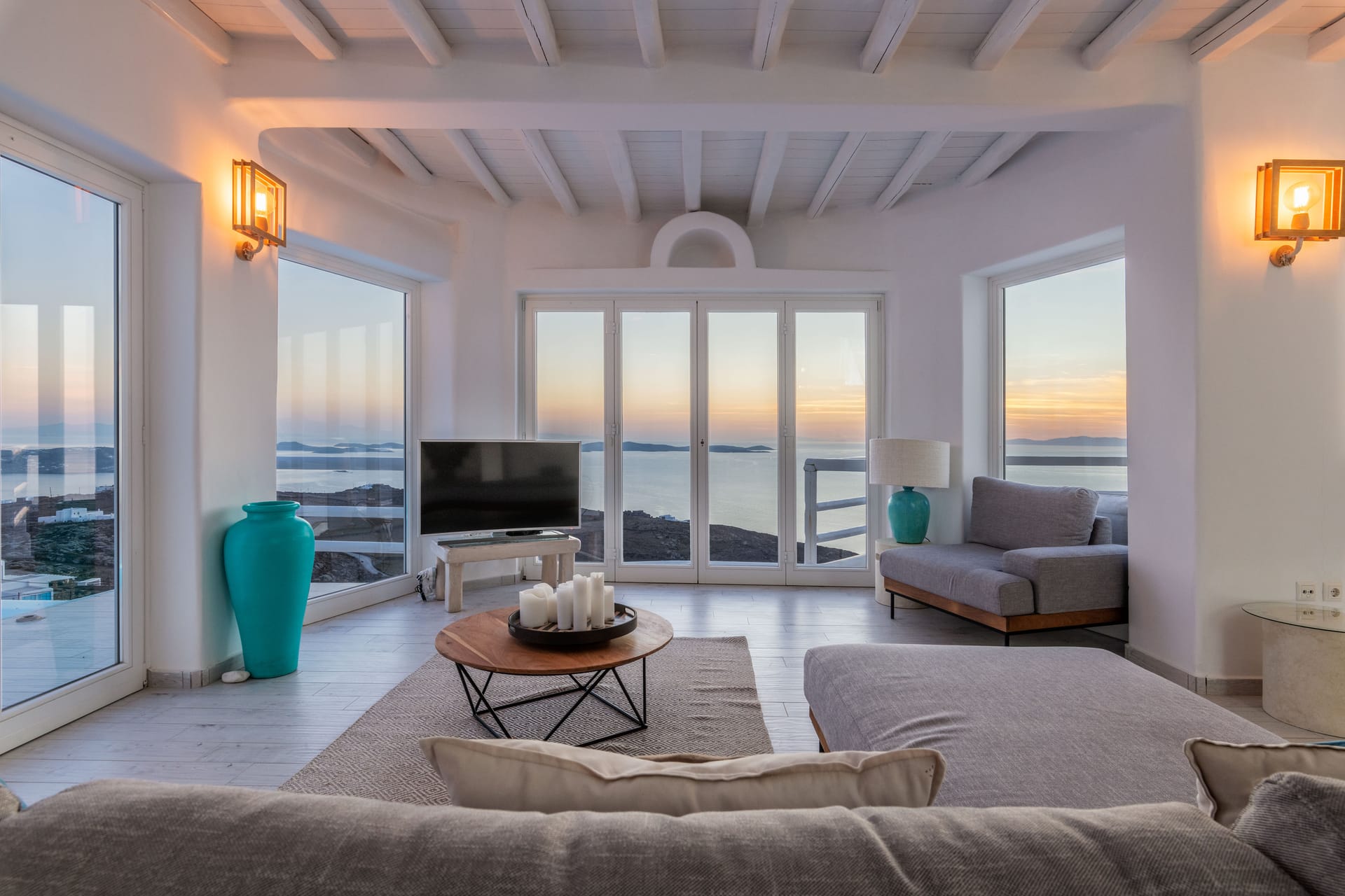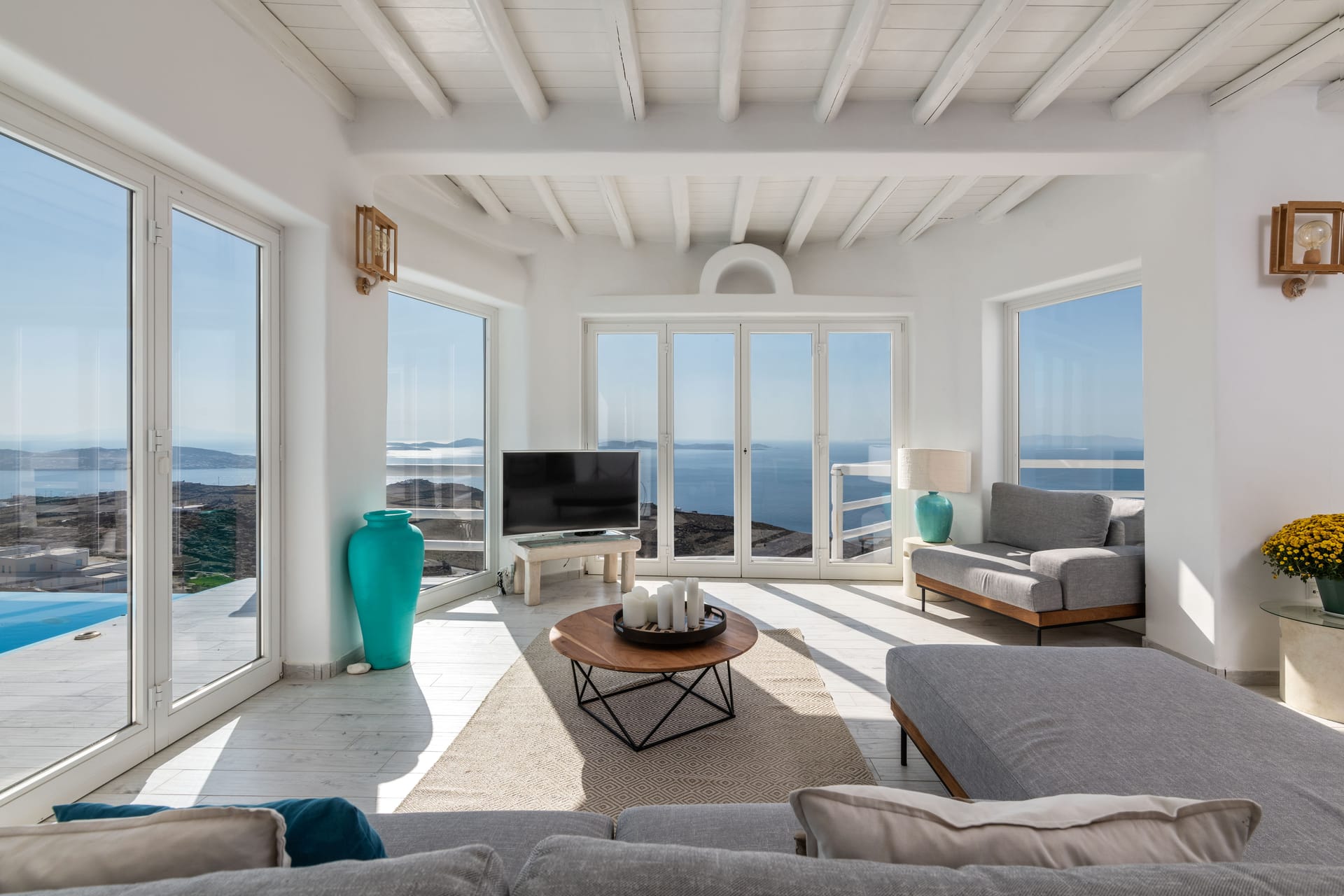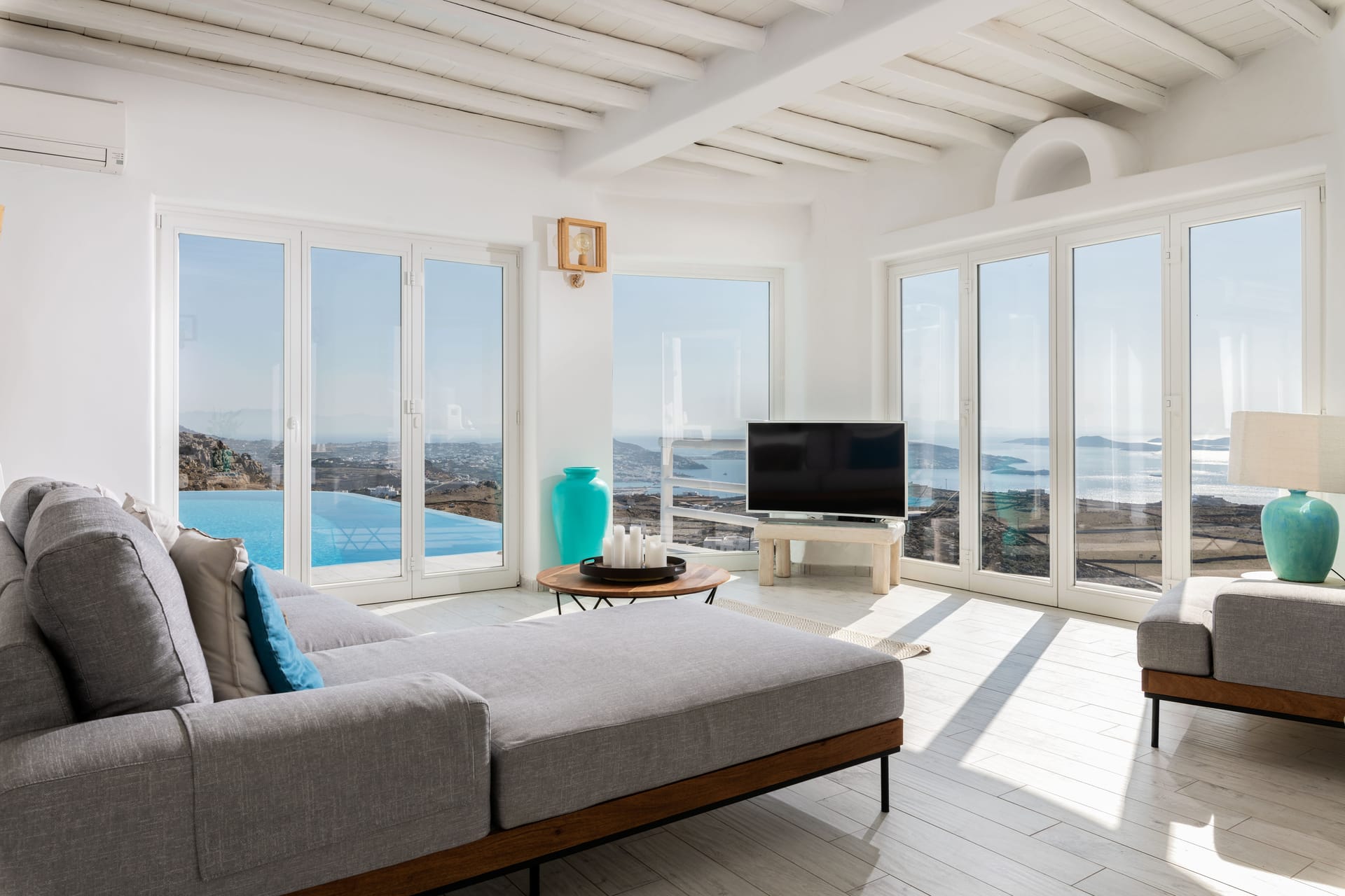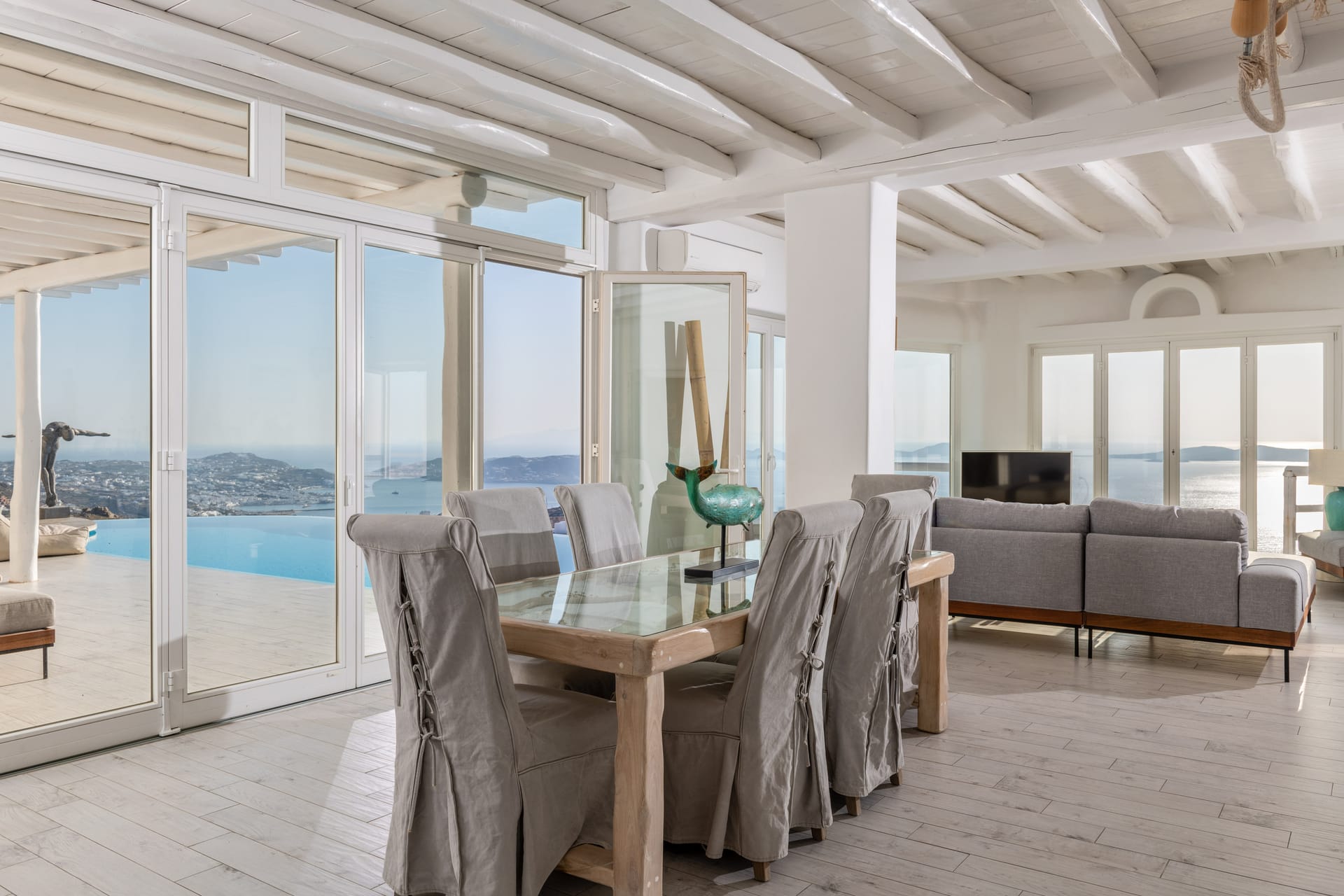 - Living room, 100 sq.m, with 270-degree Aegean views via floor-to-ceiling windows