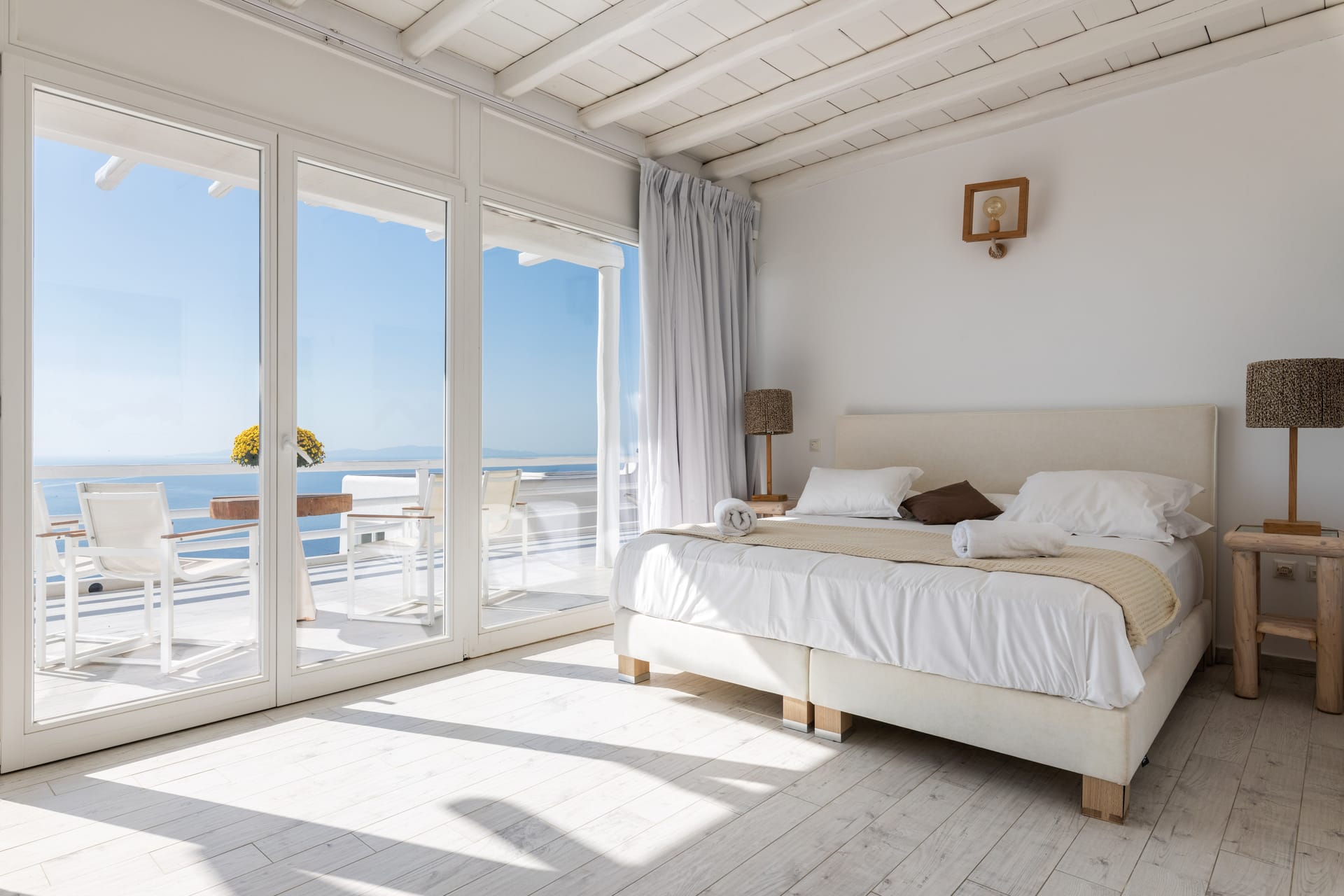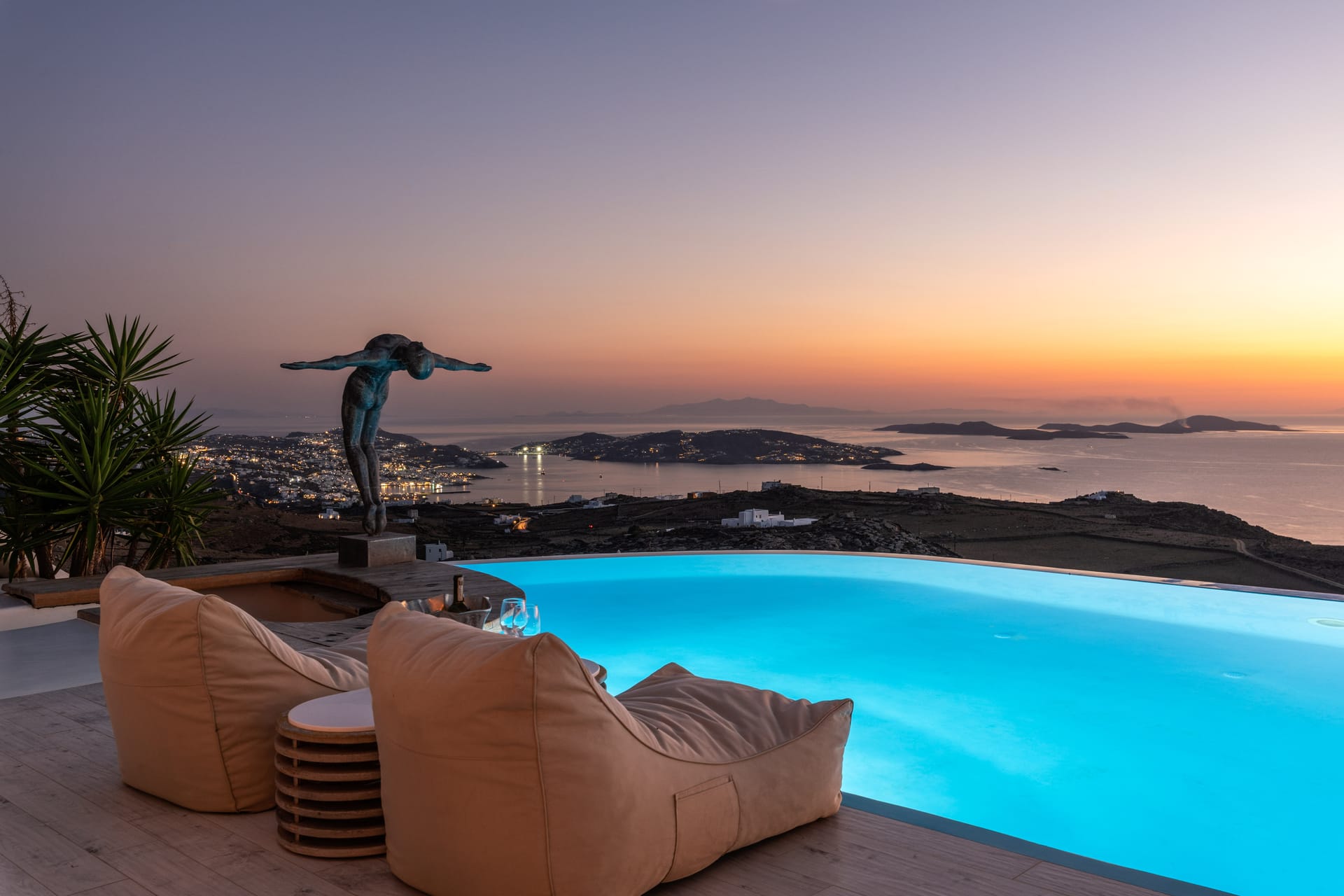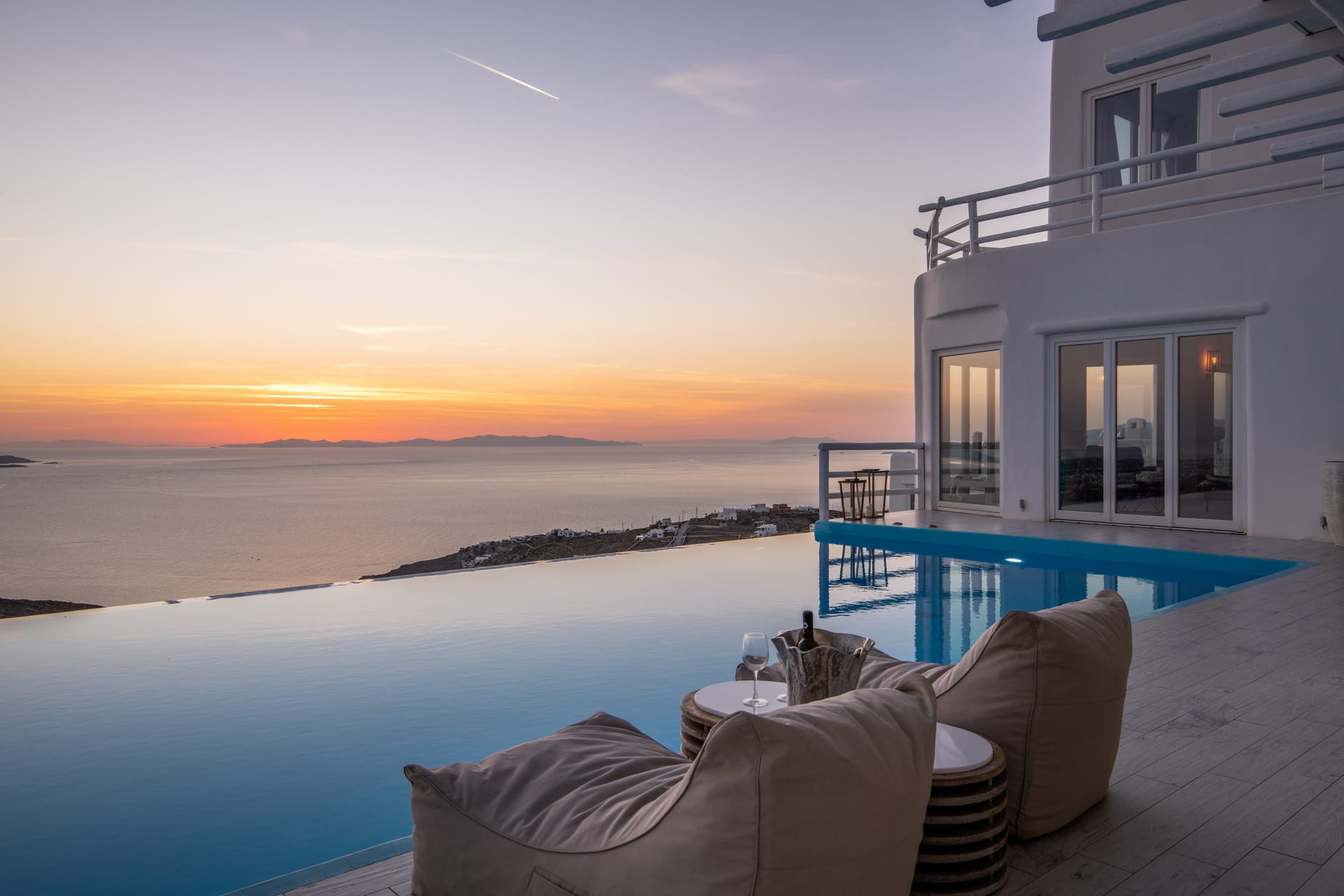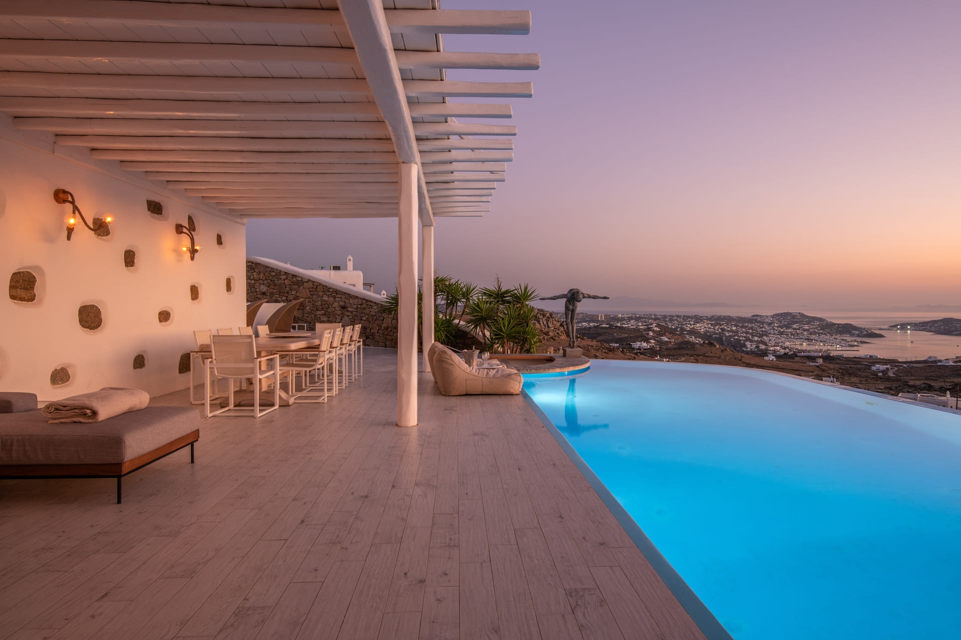 The outdoor spaces of the villa are spacious and very comfortable. There you will find a terrace with a dining area and BBQ facilities, a 50 sq.m private infinity swimming pool, numerous lounge areas, sunbeds, poufs, and all with extraordinary views. At nighttime, you will have the chance to experience the beautiful scenery, of the lighted whitewashed Mykonos town and enjoy a dinner meal or a refreshingly cool cocktail.