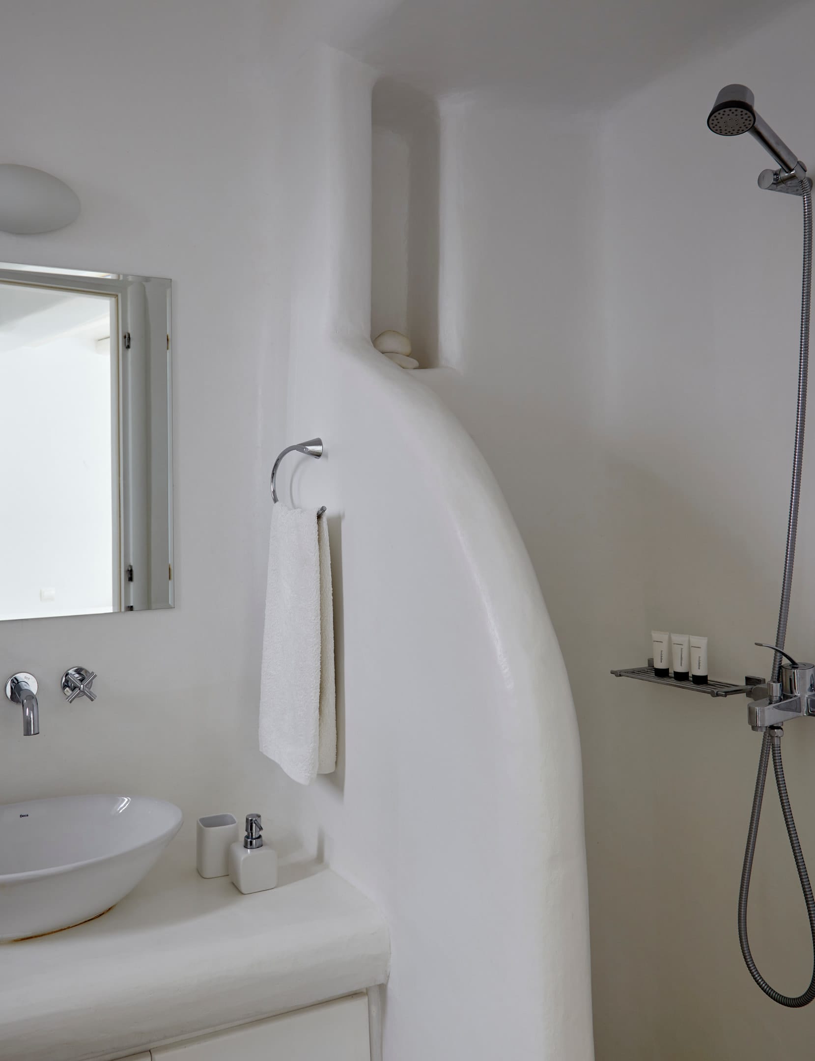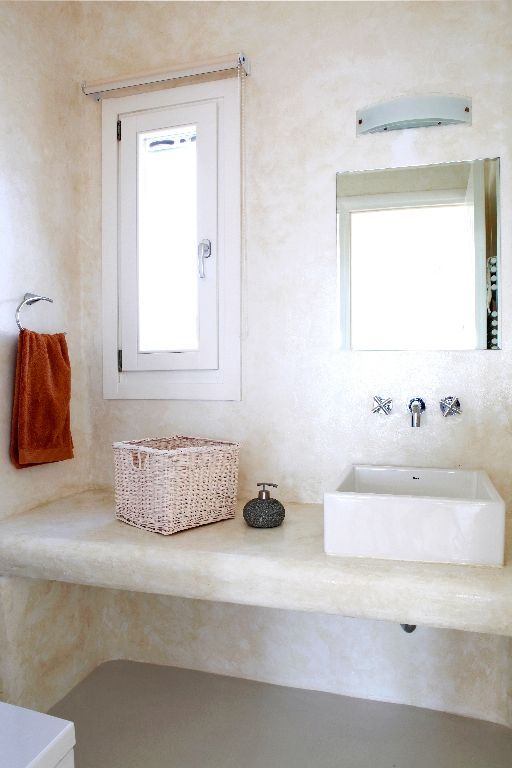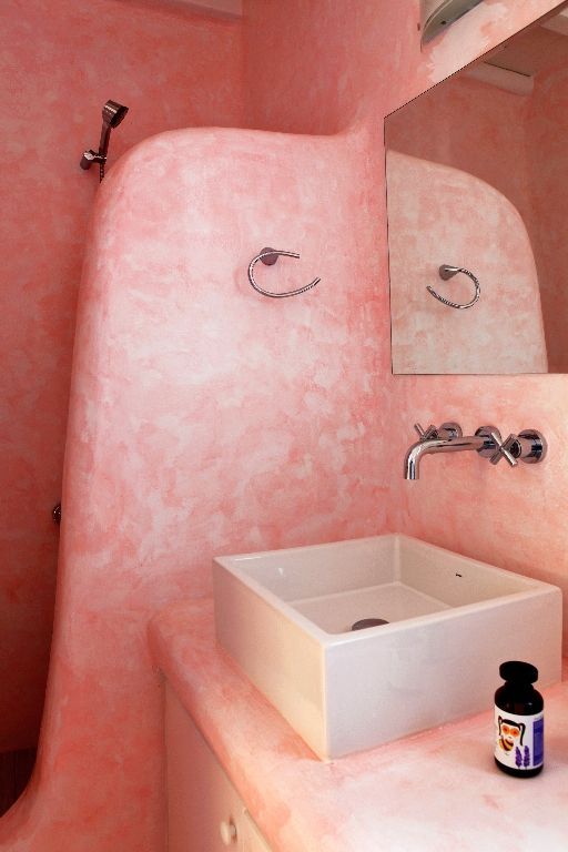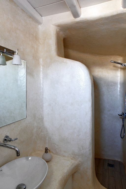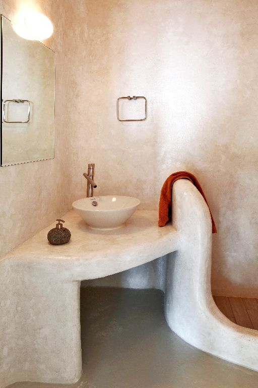 The 6 bathrooms are made of polished cement with smooth curves and light colors.