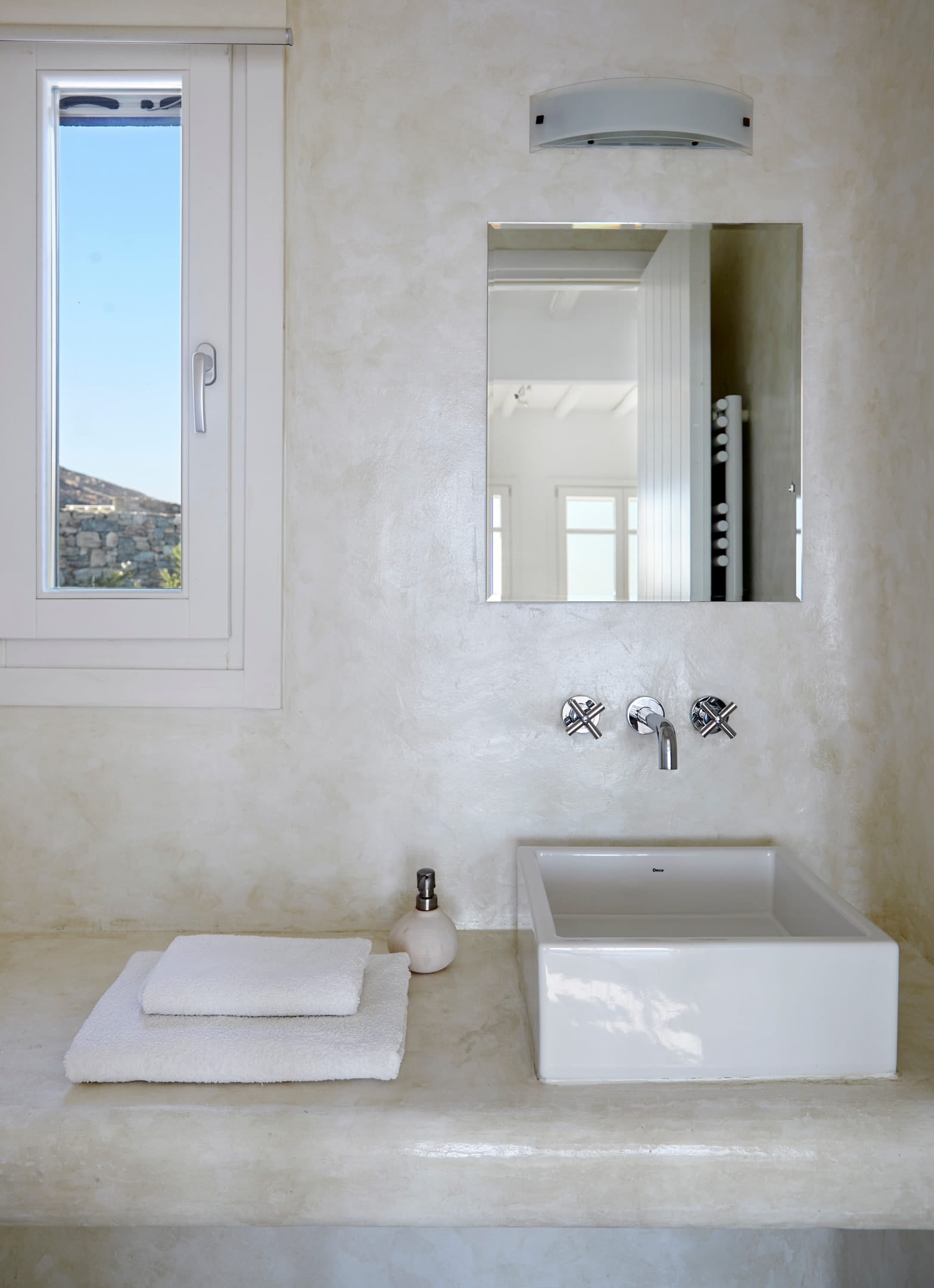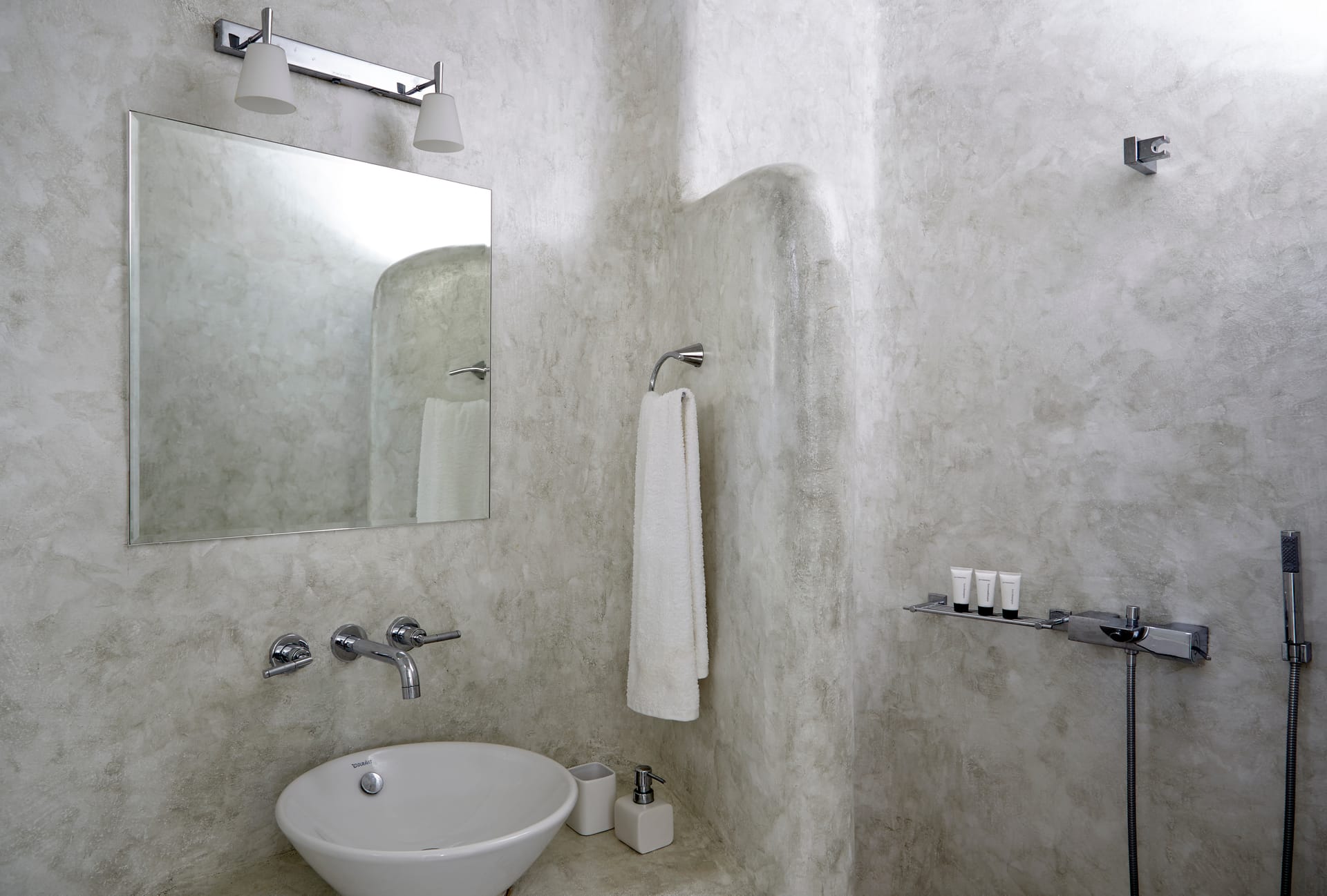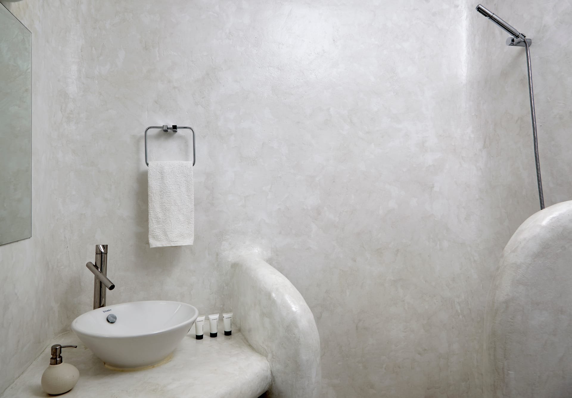 The 6 bathrooms are made of polished cement with smooth curves and light colors.