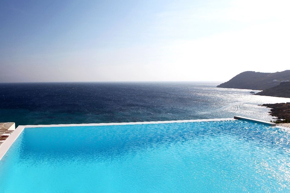 The infinity pool is situated in a location where the pool water view dives in the blue of the sea. Water flows from every point of view of the villa.