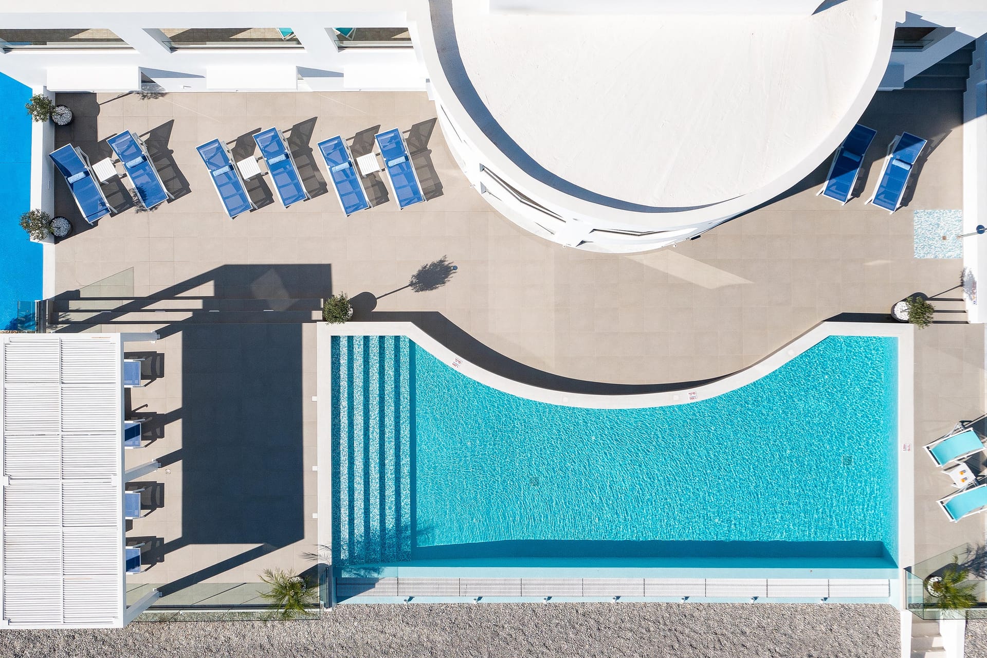 The exterior space of this luxurious property includes 2 impressive infinity pools that create the unique feeling of absolute extension of water flowing into the vast horizon and the sparkling sea. This sense of freedom combined with the breathtaking view of the Aegean Sea make swimming here a truly enjoyable and relaxing experience. The pools include floating loungers for a cool and pleasant stay under the hot and persistent summer sun. The area around the pools has additional loungers and umbrellas for shade, protection from the heat, and uninterrupted reading or mind-wandering any time of the day.