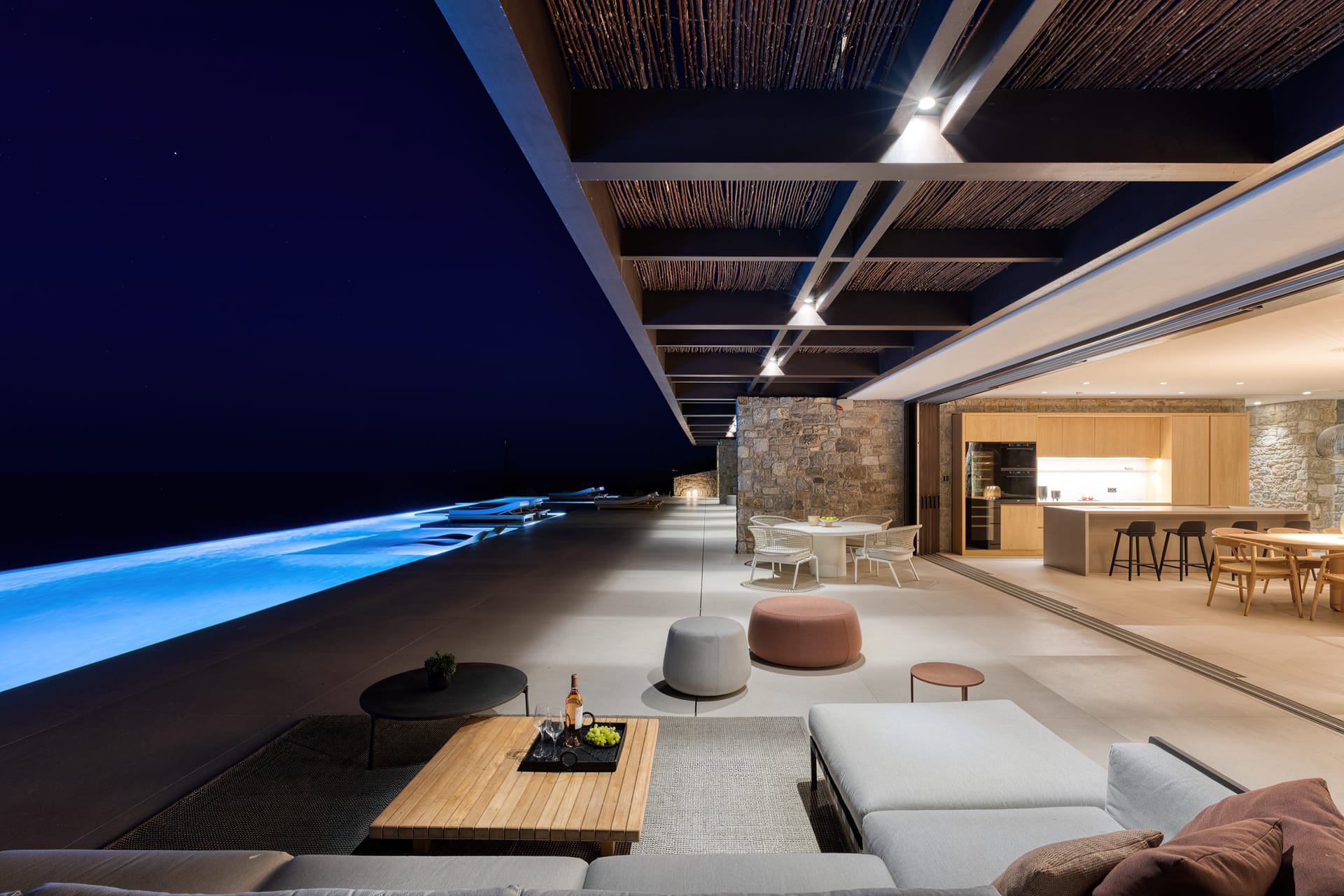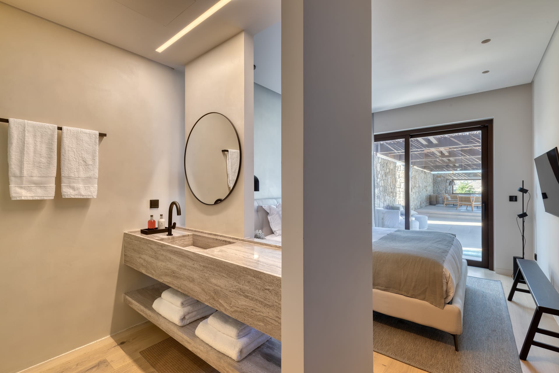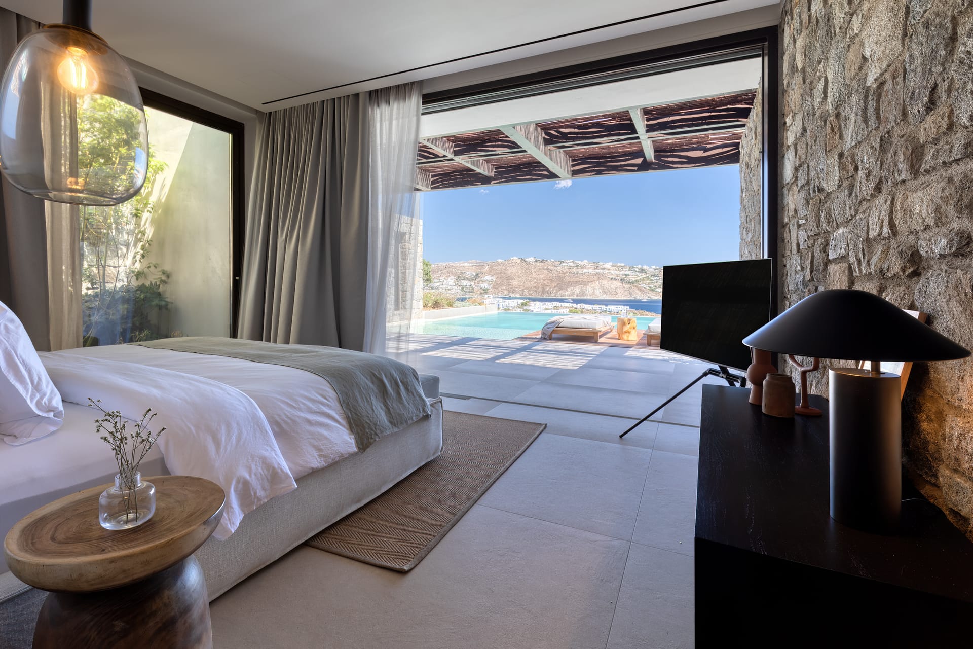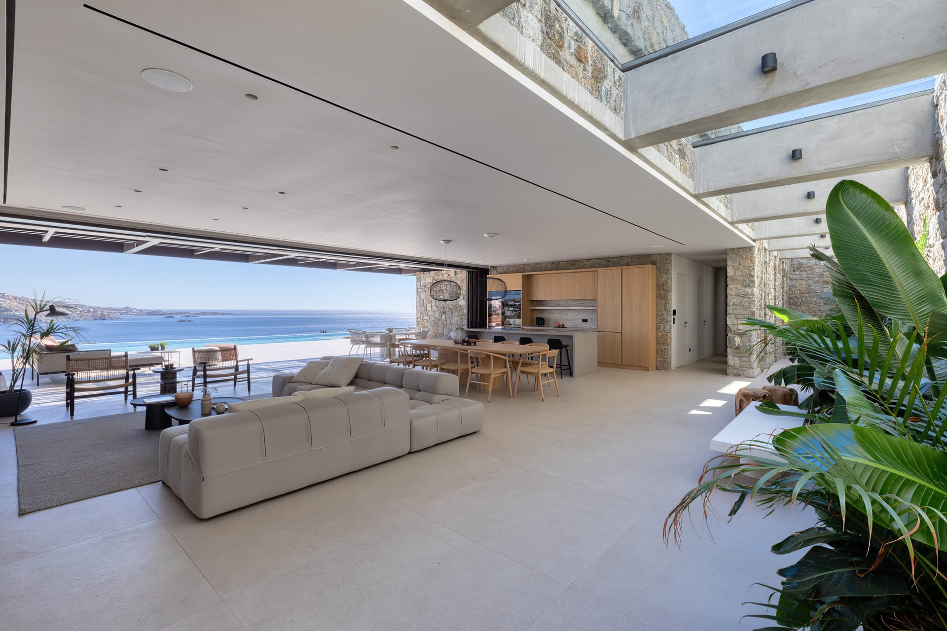 The exceptional architectural design of the property includes 2 indoor living rooms and 4 outdoor lounge areas spread around and oriented differently along the impressive patio. Natural materials, such as stone and wood, dominating both interior and exterior, minimal design, and soft tones create a sense of tranquillity and balance, gently absorbing and diffusing light throughout the day. The luxurious, subtly decorated interior generates a light atmosphere, and blends harmoniously with its natural environment, creating comfortable, autonomous spaces in a prominent location. *The 2 living rooms and 4 lounge areas are included in the 10 bedroom villa with private swimming pool. Guests staying in the 5-bedroom villas have access to 1 indoor living room and 2 lounge areas on the terrace.