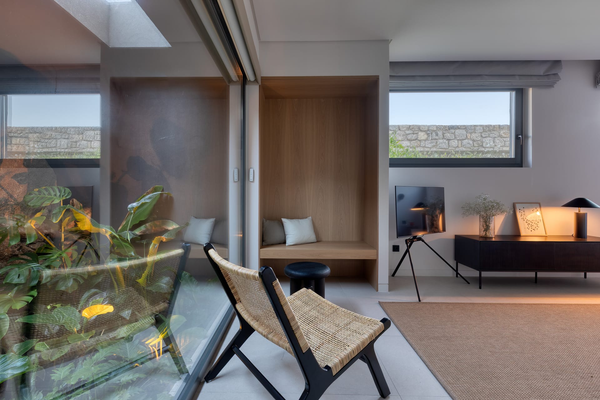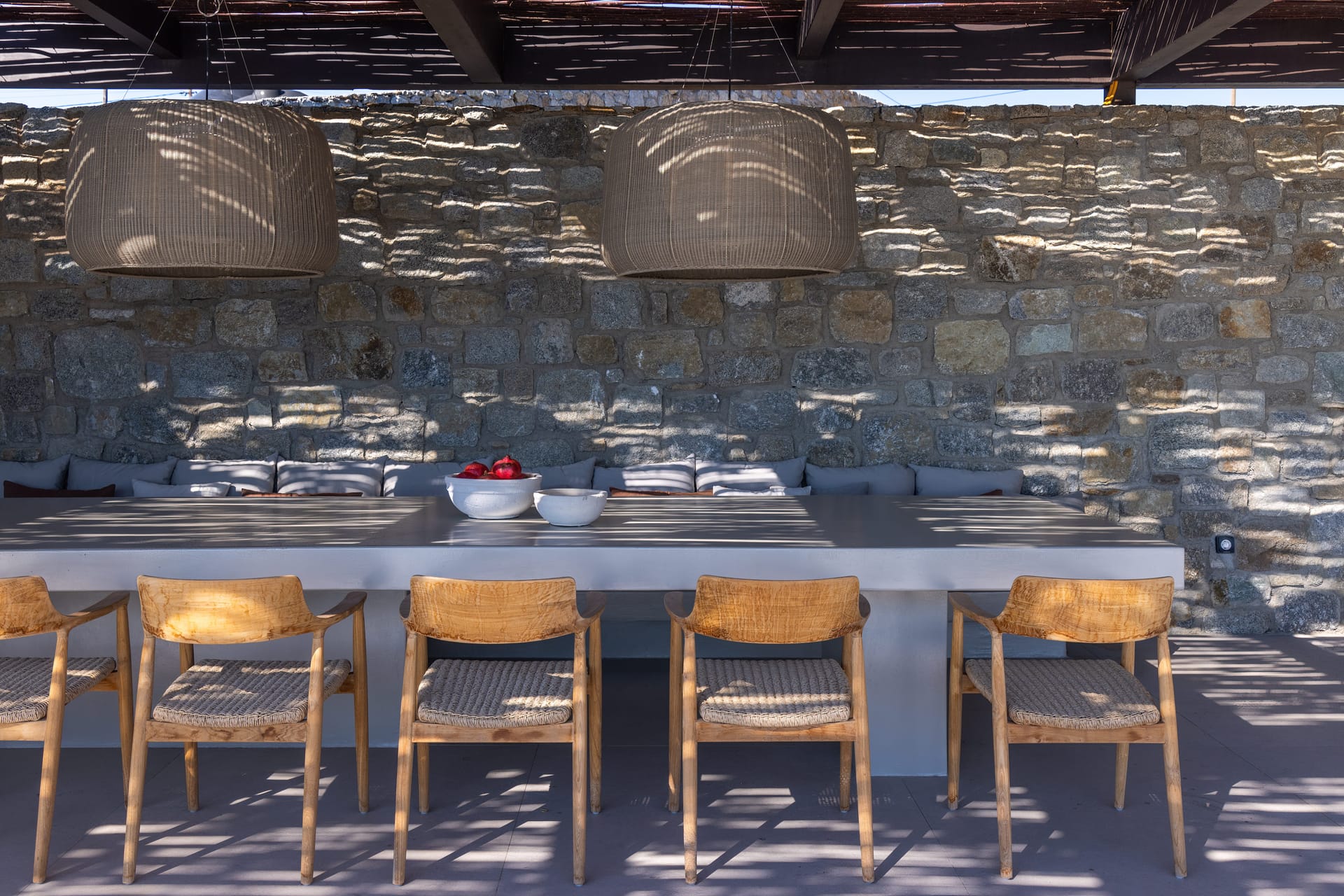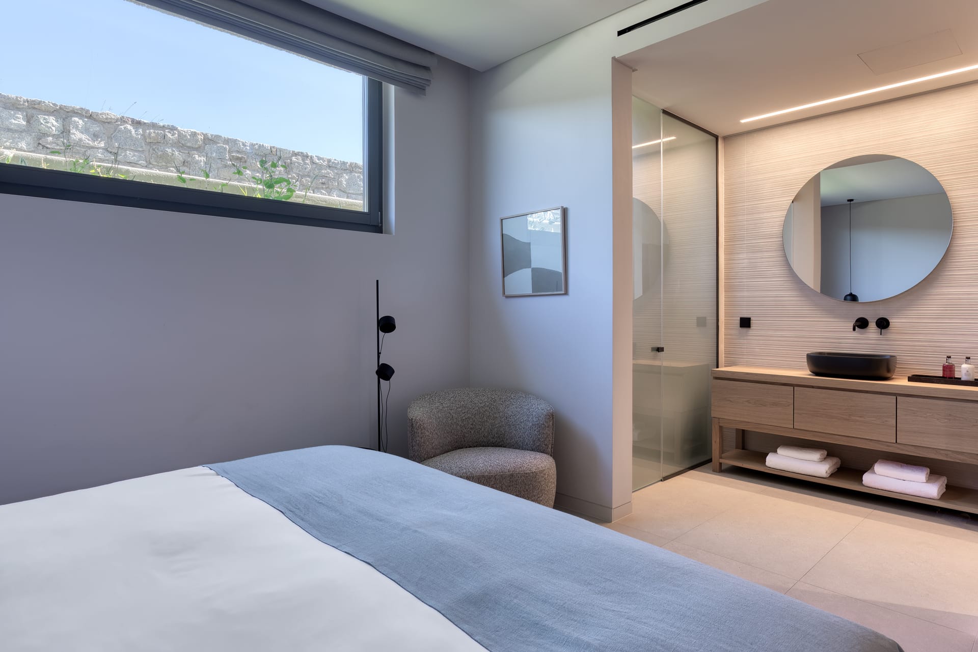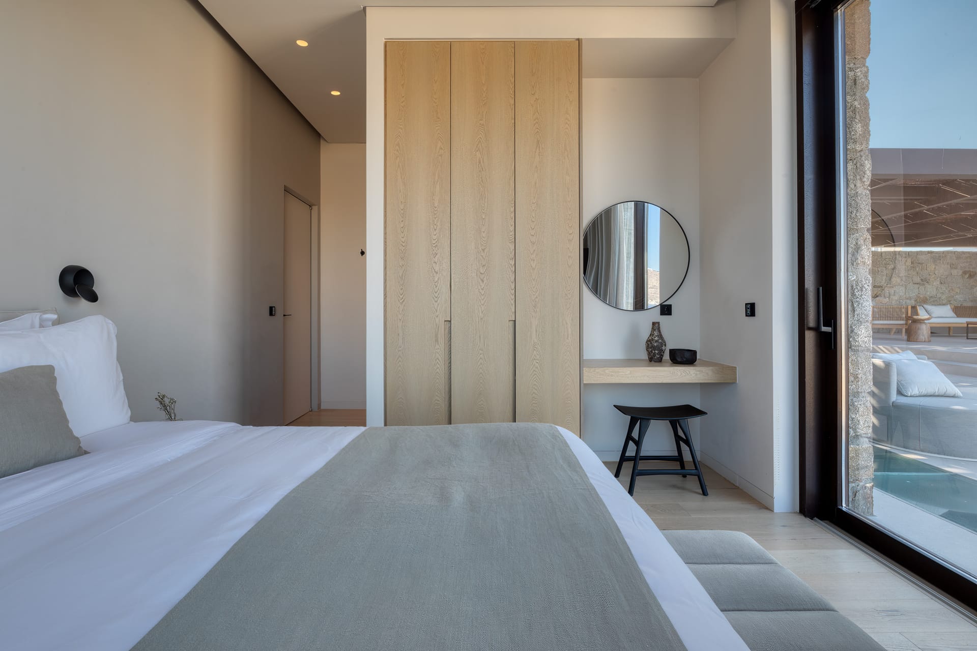 The exceptional architectural design of the property includes 2 indoor living rooms and 4 outdoor lounge areas spread around and oriented differently along the impressive patio. Natural materials, such as stone and wood, dominating both interior and exterior, minimal design, and soft tones create a sense of tranquillity and balance, gently absorbing and diffusing light throughout the day. The luxurious, subtly decorated interior generates a light atmosphere, and blends harmoniously with its natural environment, creating comfortable, autonomous spaces in a prominent location. *The 2 living rooms and 4 lounge areas are included in the 10 bedroom villa with private swimming pool. Guests staying in the 5-bedroom villas have access to 1 indoor living room and 2 lounge areas on the terrace.