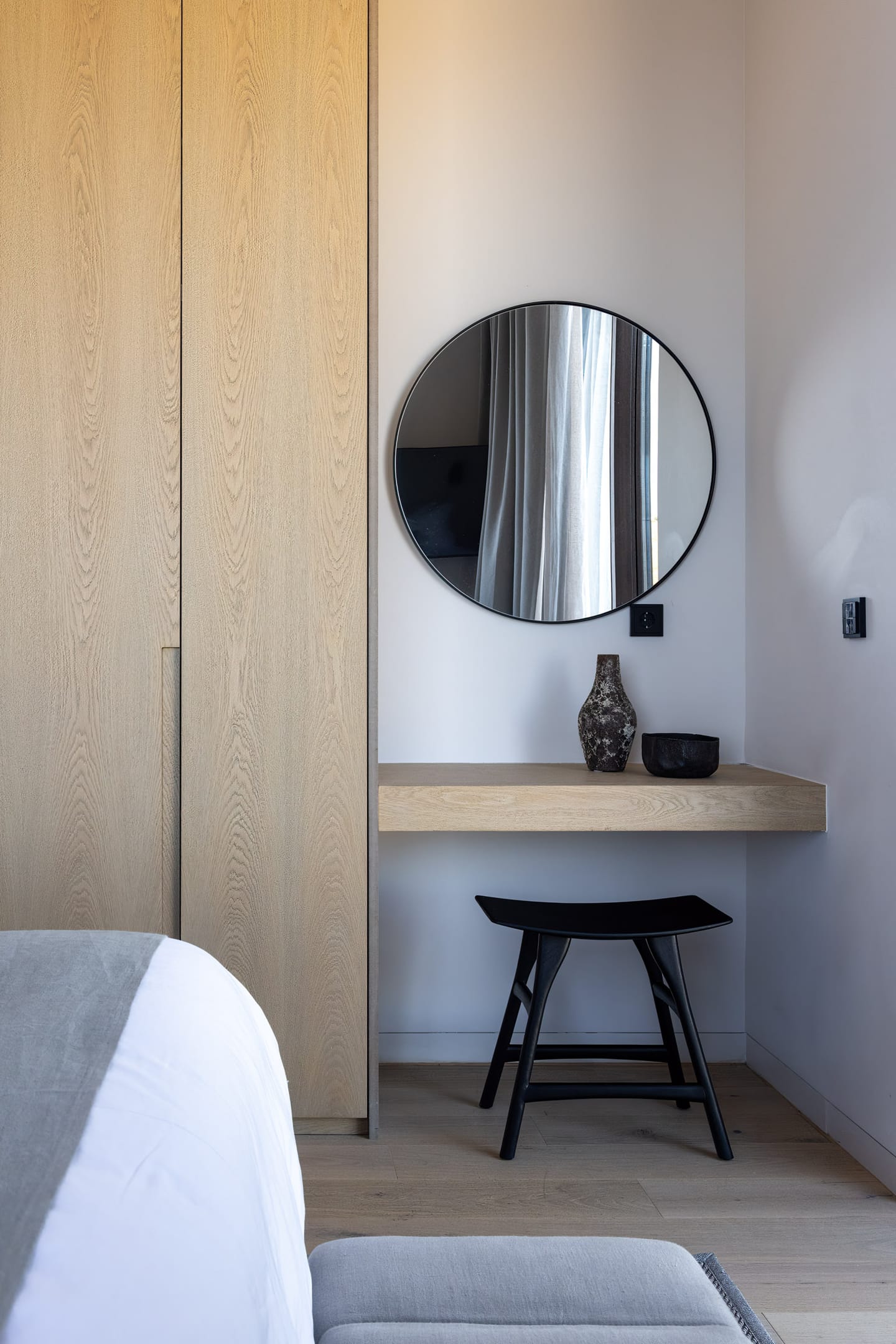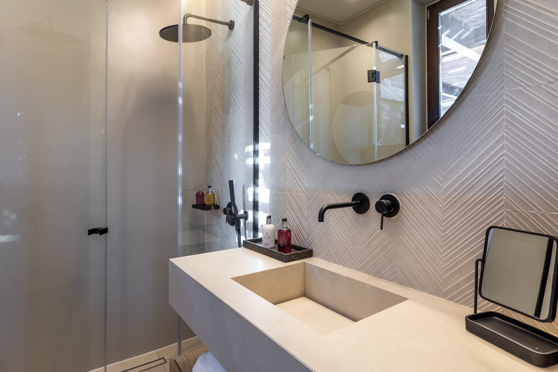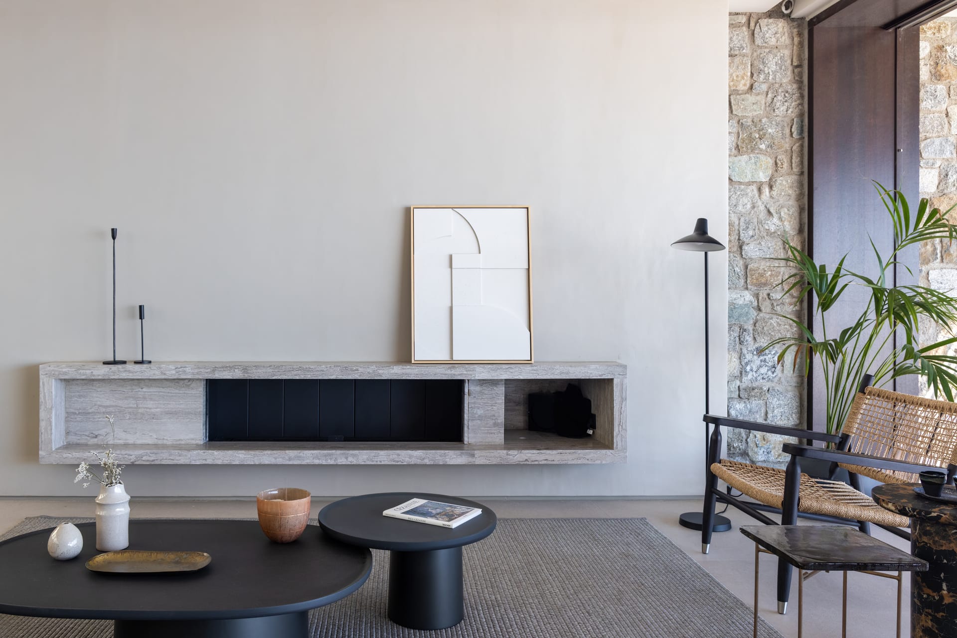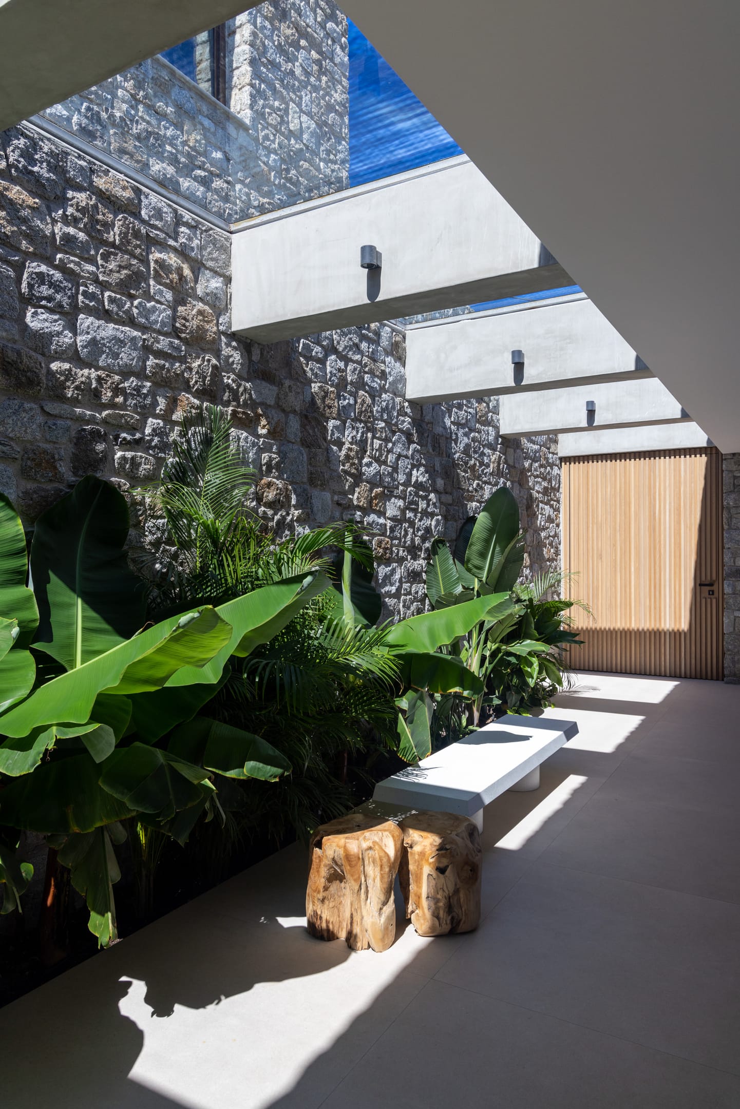 The exceptional architectural design of the property includes 2 indoor living rooms and 4 outdoor lounge areas spread around and oriented differently along the impressive patio. Natural materials, such as stone and wood, dominating both interior and exterior, minimal design, and soft tones create a sense of tranquillity and balance, gently absorbing and diffusing light throughout the day. The luxurious, subtly decorated interior generates a light atmosphere, and blends harmoniously with its natural environment, creating comfortable, autonomous spaces in a prominent location. *The 2 living rooms and 4 lounge areas are included in the 10 bedroom villa with private swimming pool. Guests staying in the 5-bedroom villas have access to 1 indoor living room and 2 lounge areas on the terrace.
