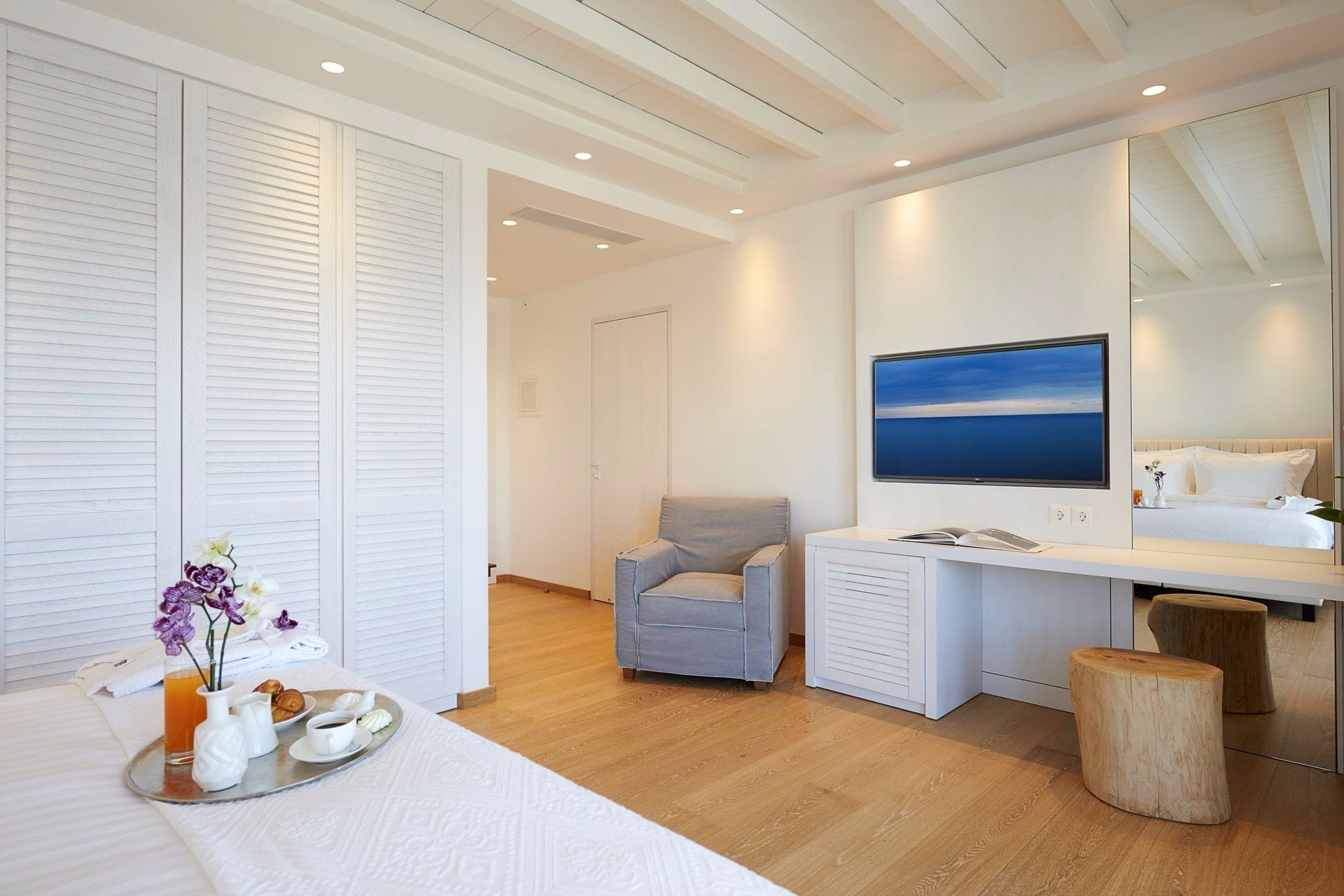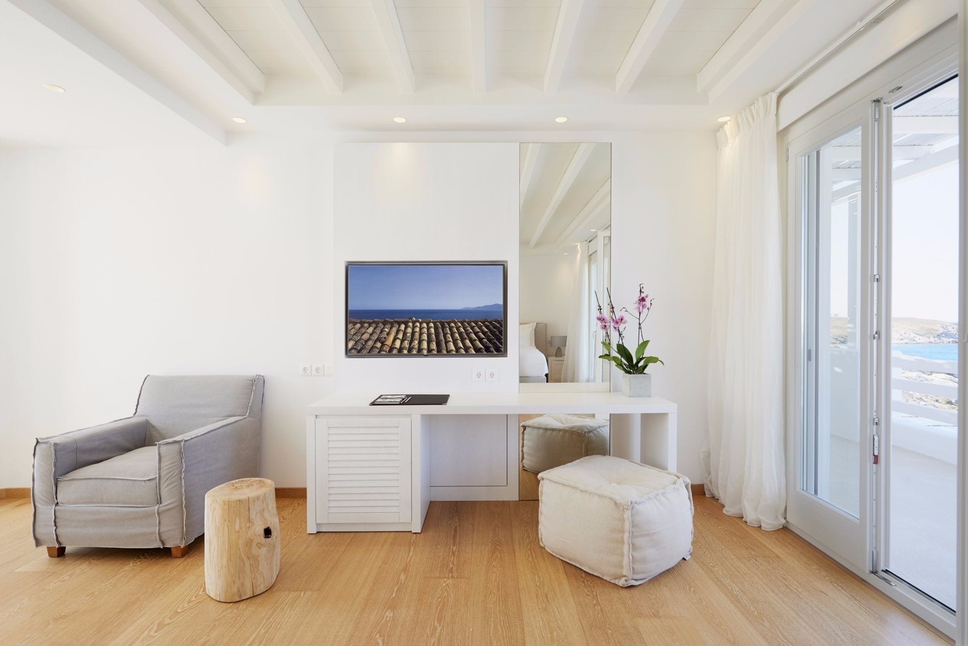 The rooms are across three levels that all face the gulf and the beach, this way ensuring sea view is available from every room. Each also features a sizeable balcony with a sitting area where guests can enjoy the cool breeze and ambiance of the Mykonian summer, yet still retain their privacy while taking in the gorgeous views.