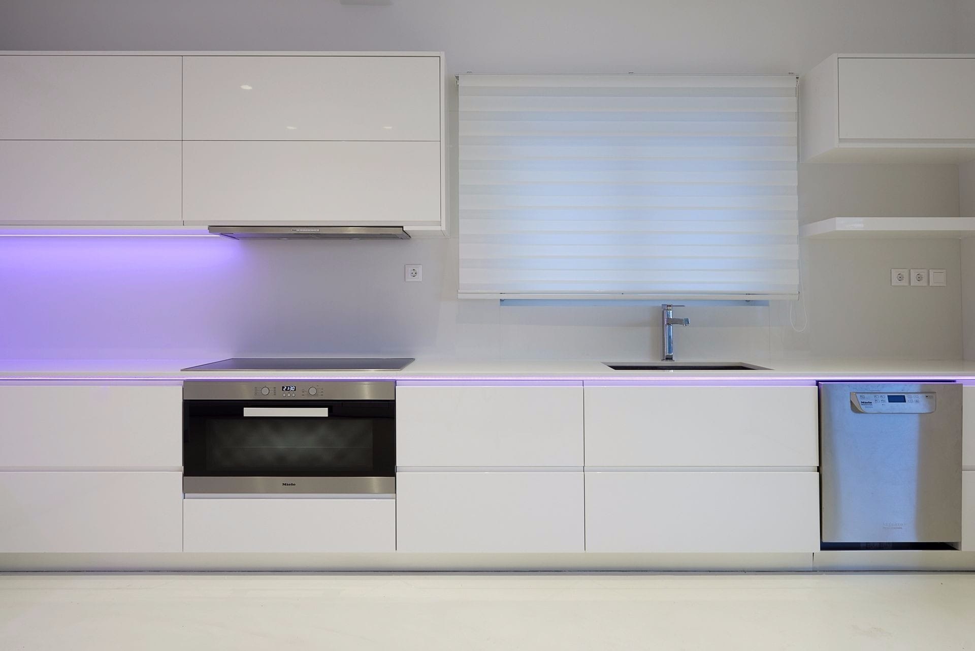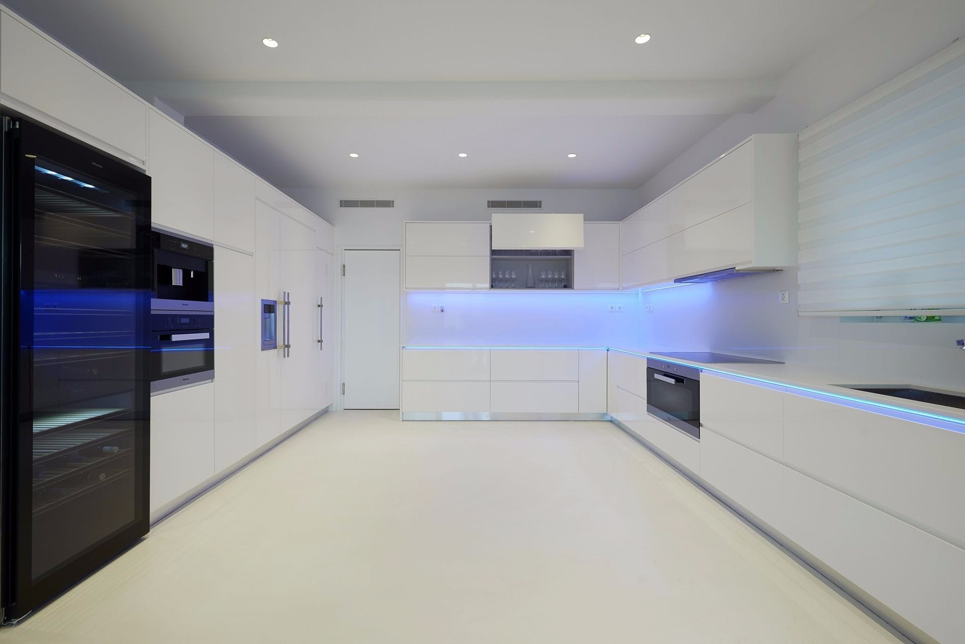 The interior living room opens up to the outdoor pool and terrace area by way of wide french doors, this way creating a sunlit space that will host many soothing moments of relaxing, leisure time. It features an elegant, dining table and is fitted out with modern, high grade, comfortable furniture plus a 72 inch home cinema for guests’ entertainment.