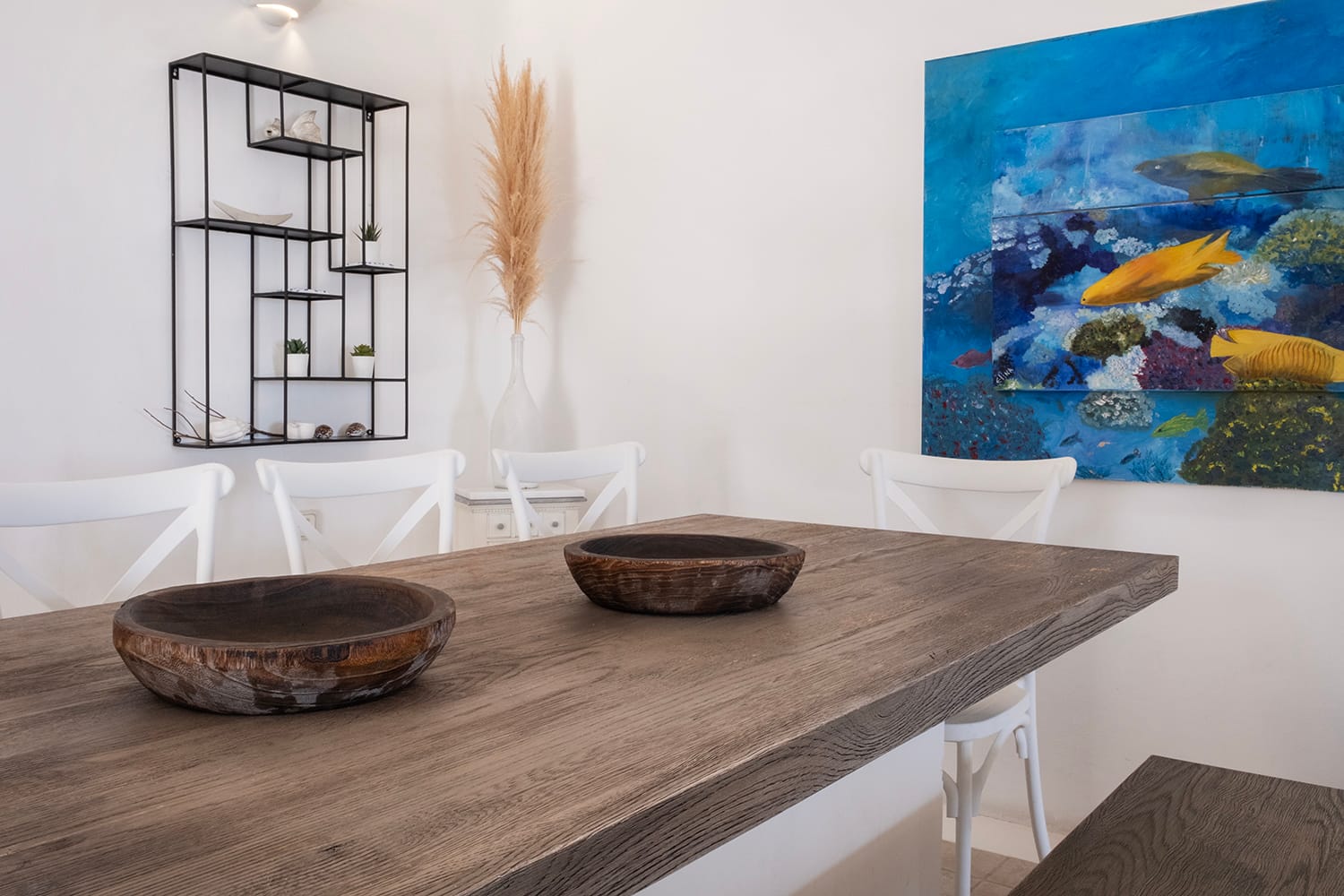 The ground level features the living and the dining room, with direct access to the pool and a big private veranda. This level is set with a fully equipped kitchen, next to the dining area with seating for 11.