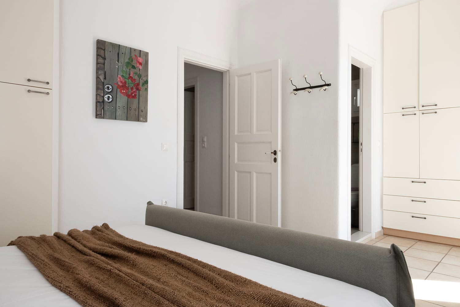Two more bedrooms are on this level: one with a double size bed and the other one with two single beds. Both of these bedrooms have their own small verandas with views to the backyard of the estate. An additional bathroom with shower is also on this level.