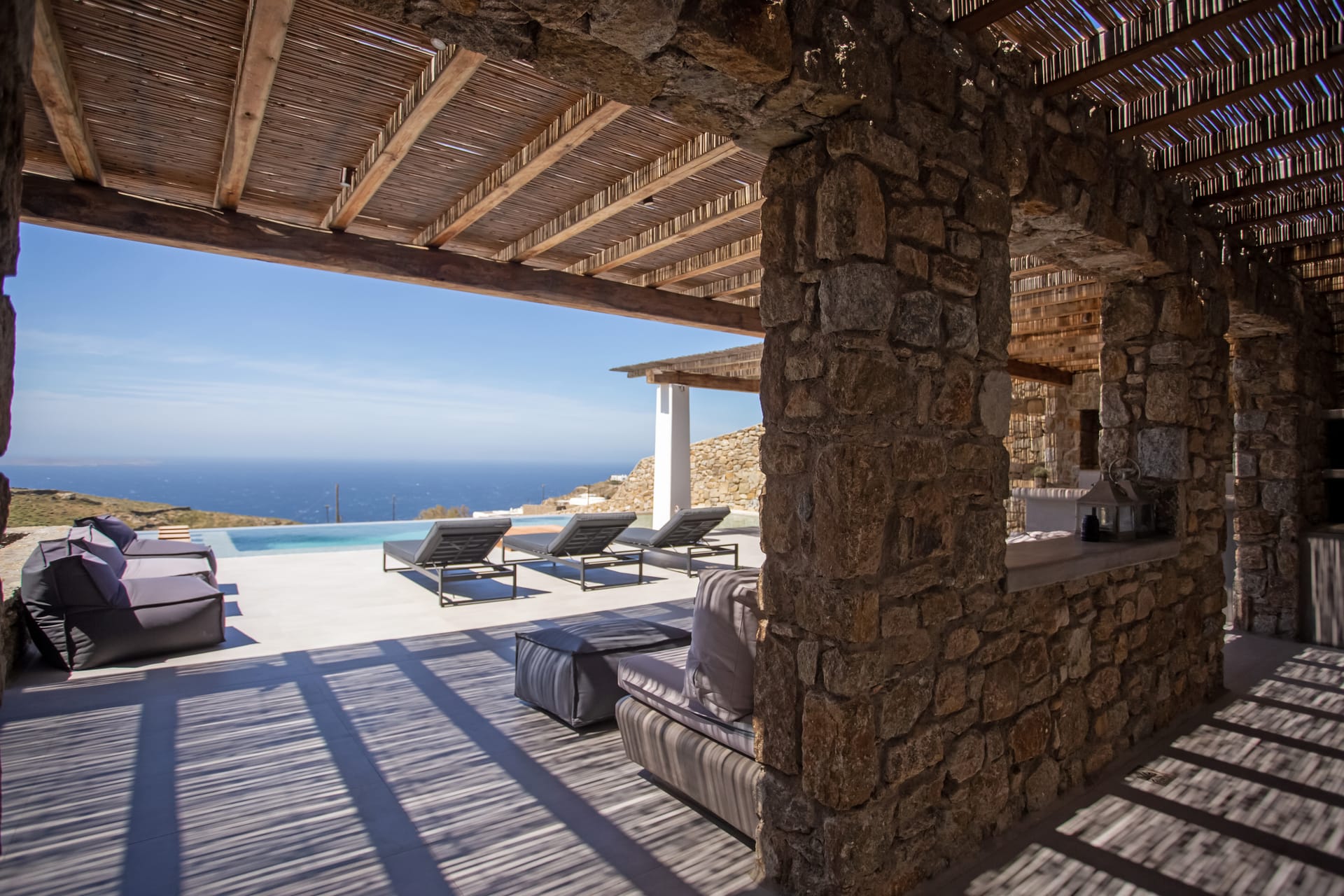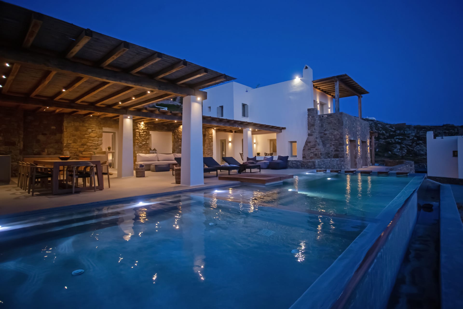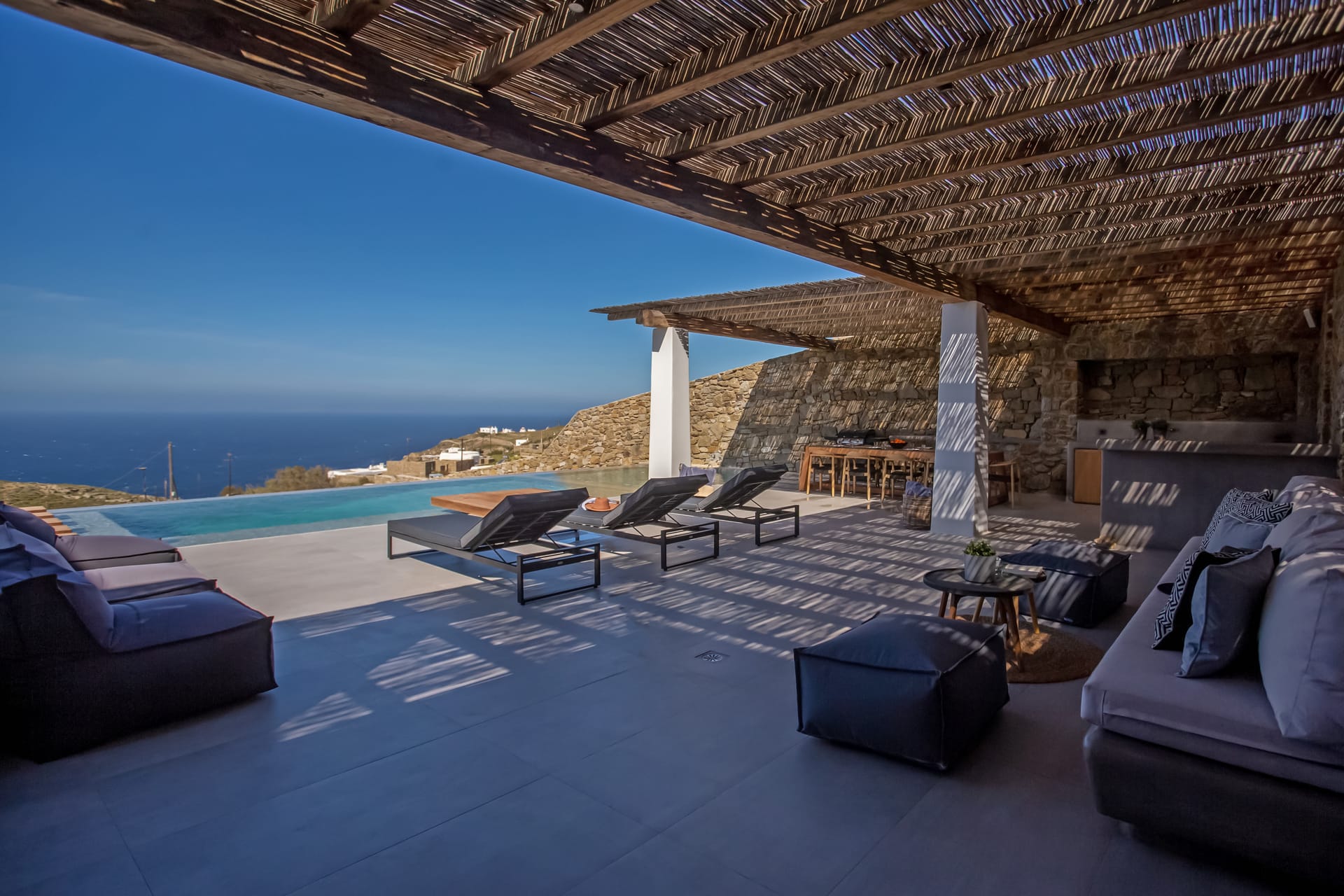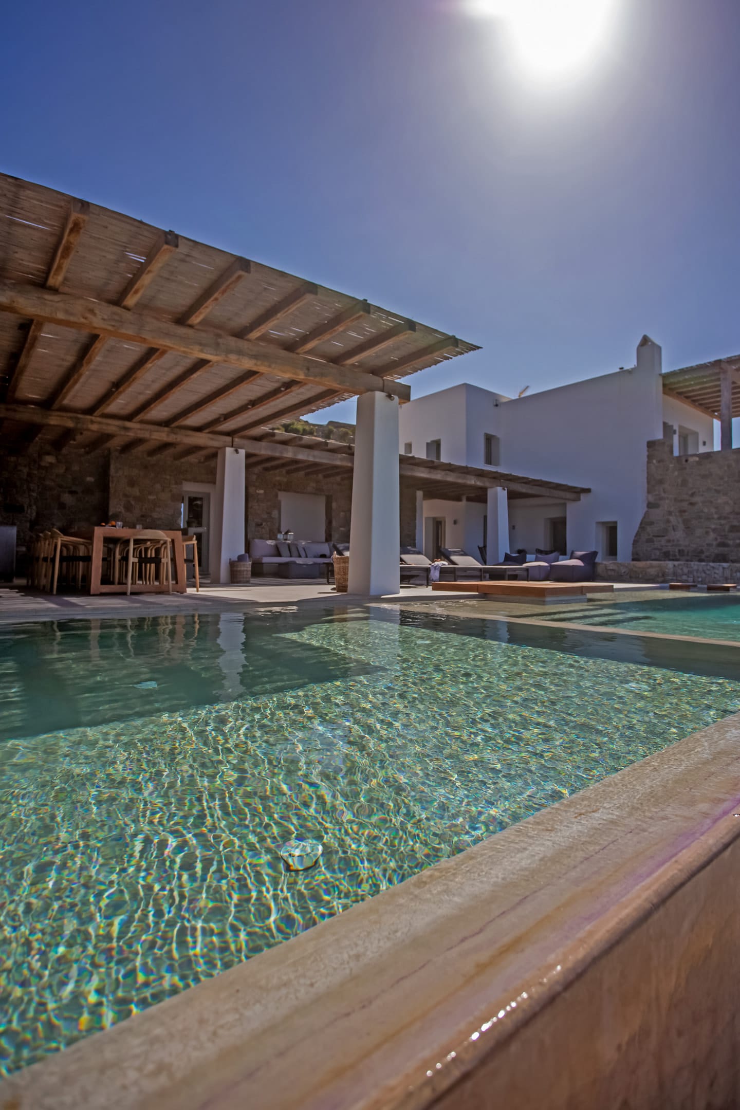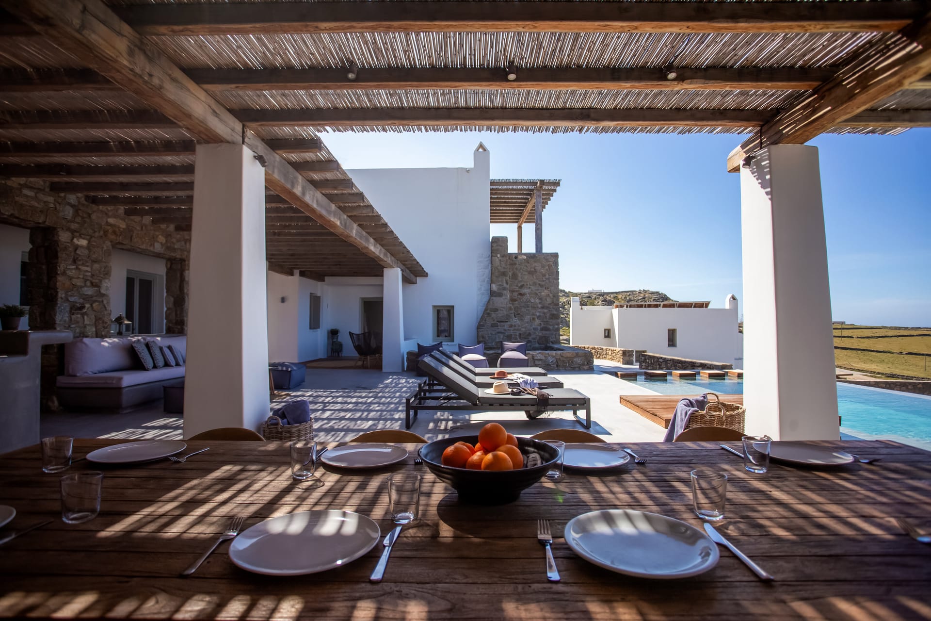 sophisticated minimal, contemporary , luxurious and stylish but also respecting local culture and architecture. designed with relaxed elegance, to serve a family as well as a big group of friends, with focus in functionality. less is more.