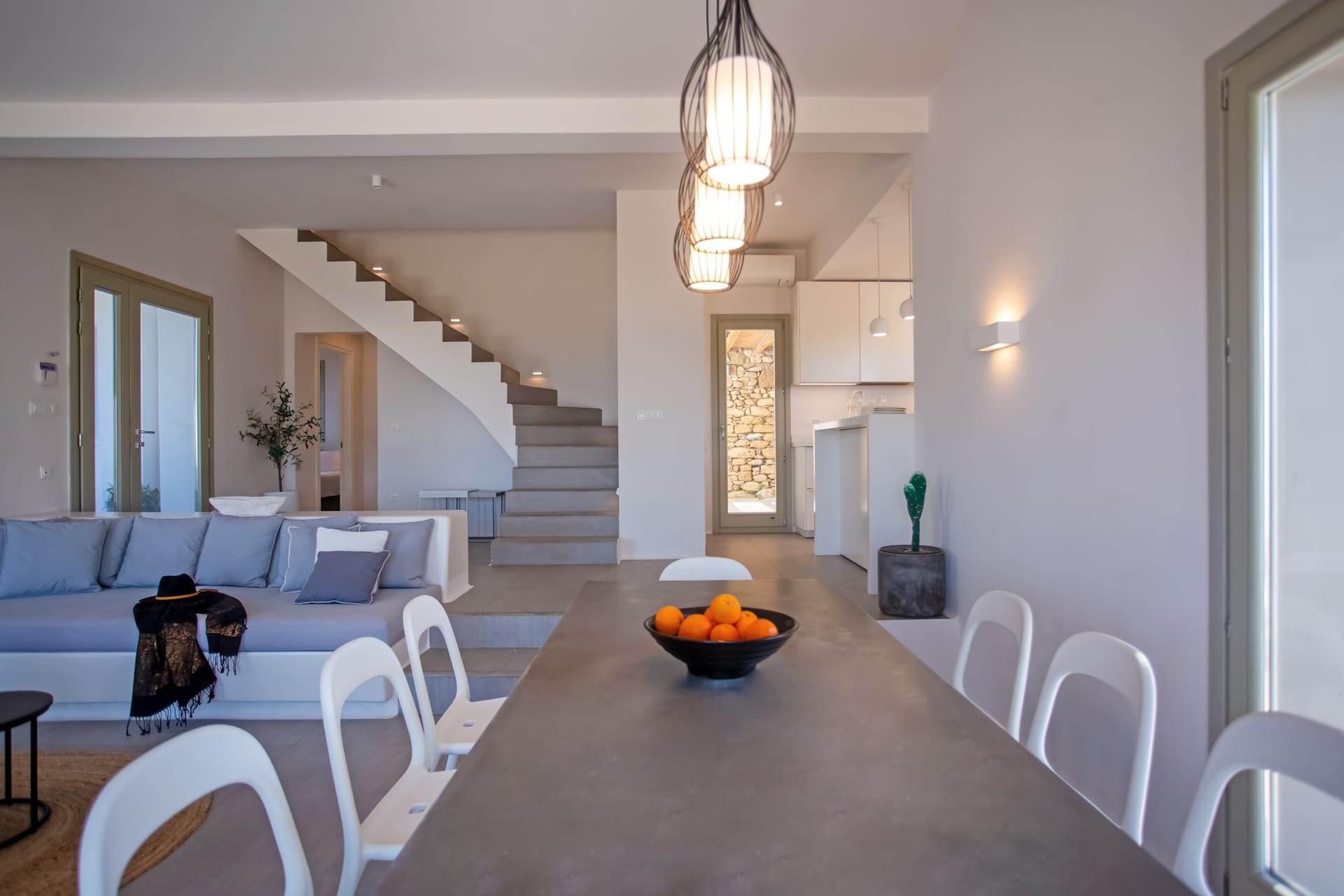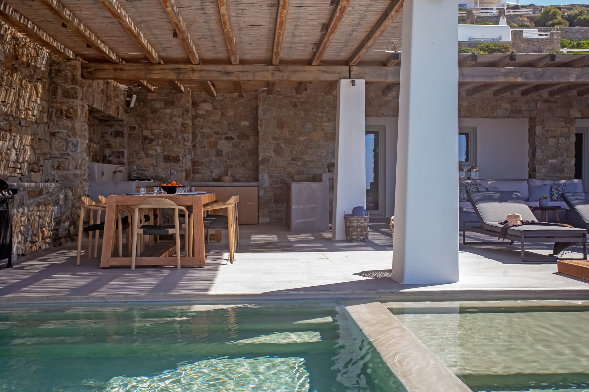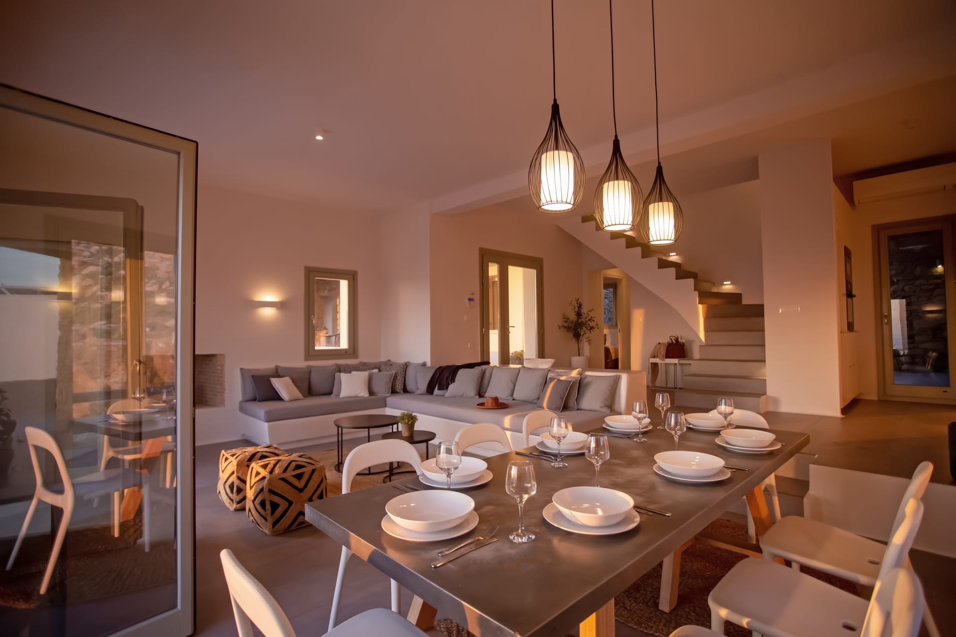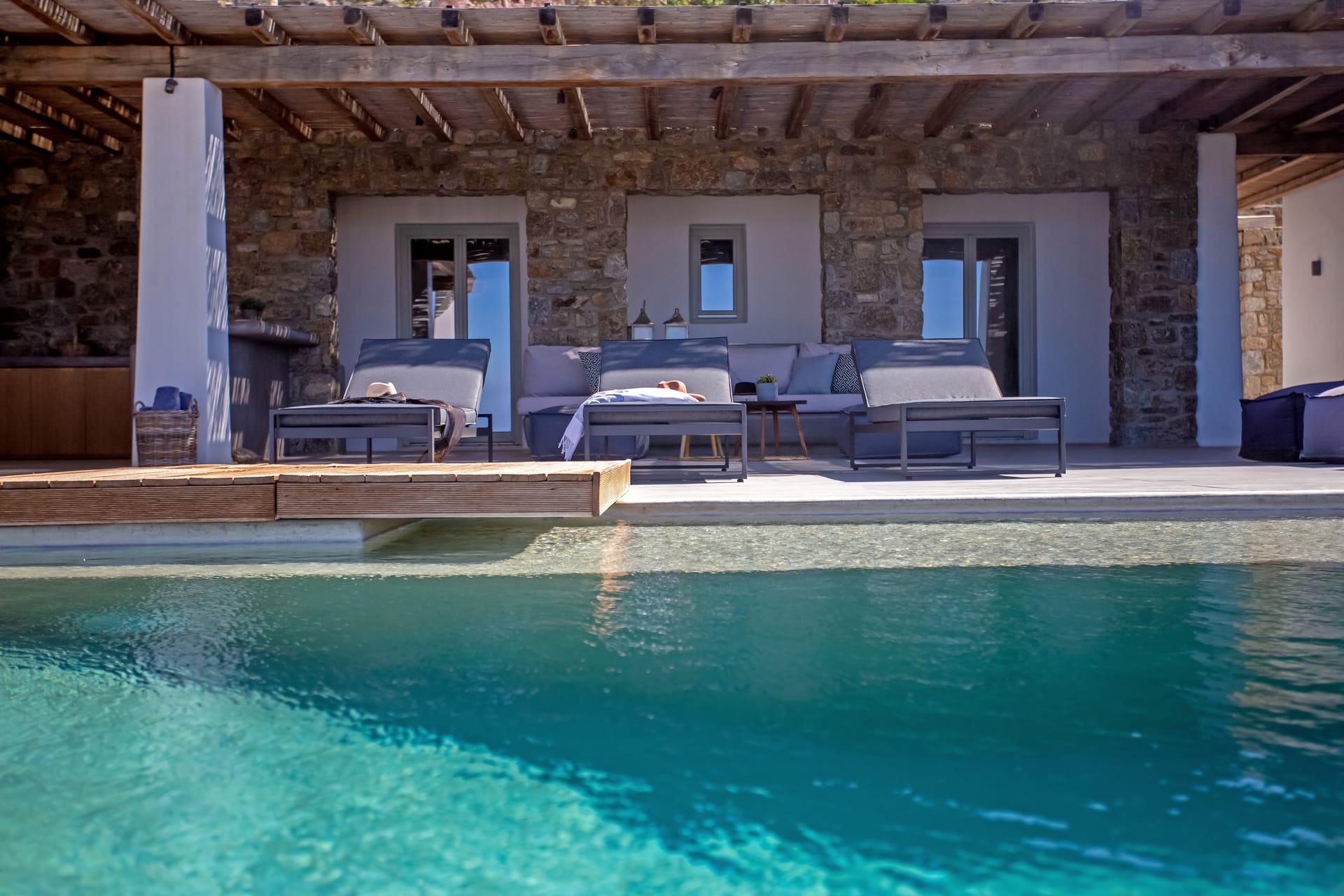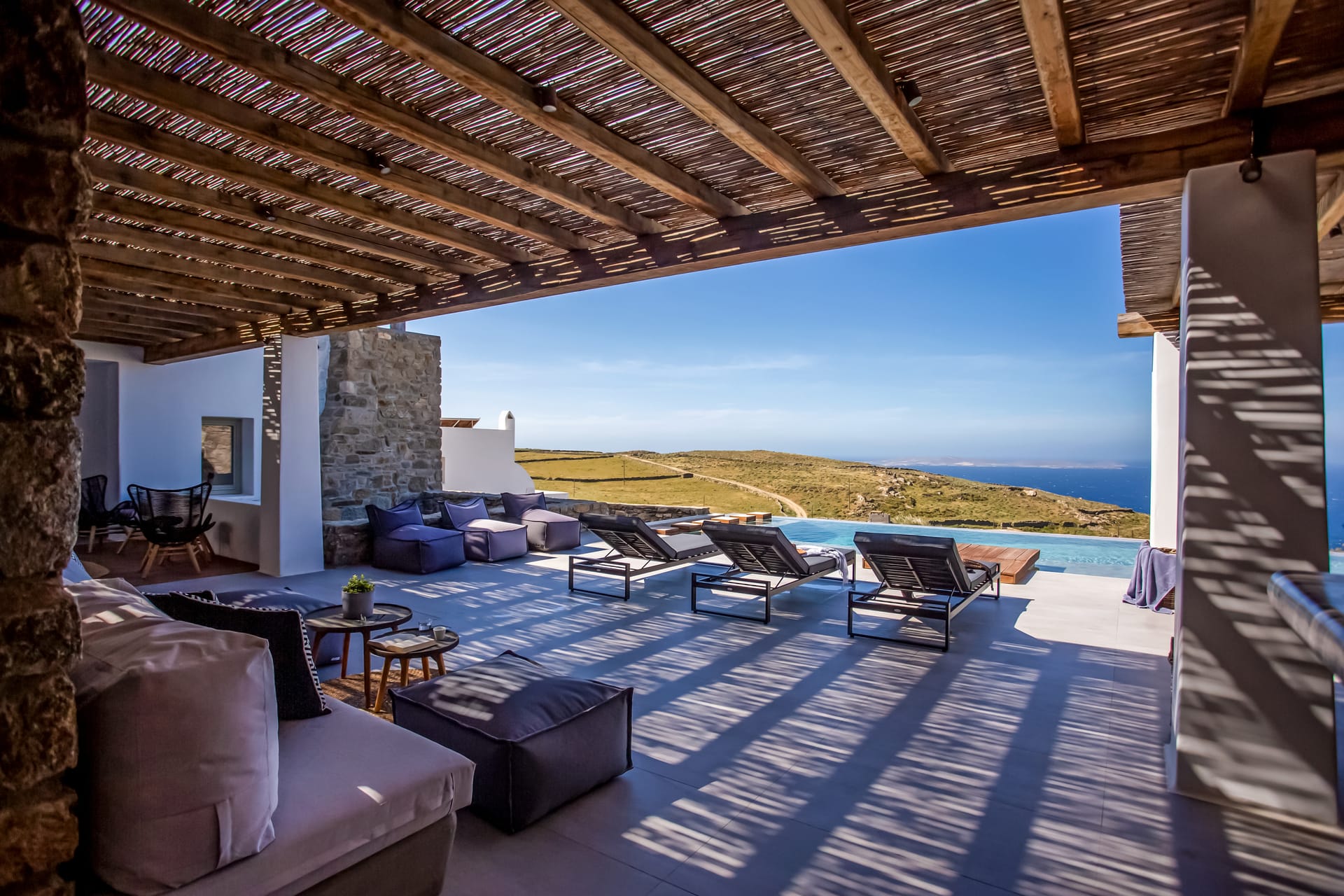 sophisticated minimal, contemporary , luxurious and stylish but also respecting local culture and architecture. designed with relaxed elegance, to serve a family as well as a big group of friends, with focus in functionality. less is more.