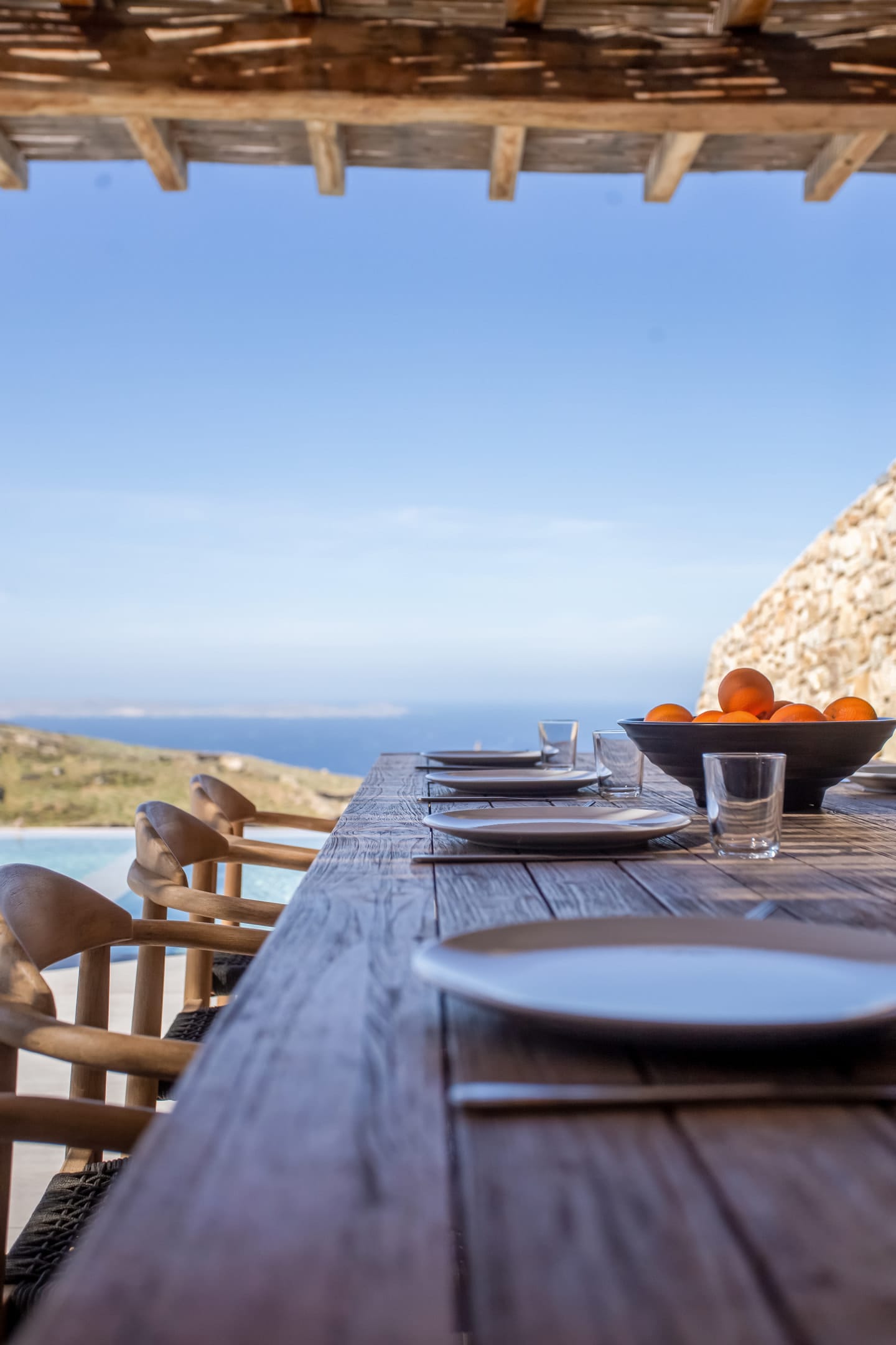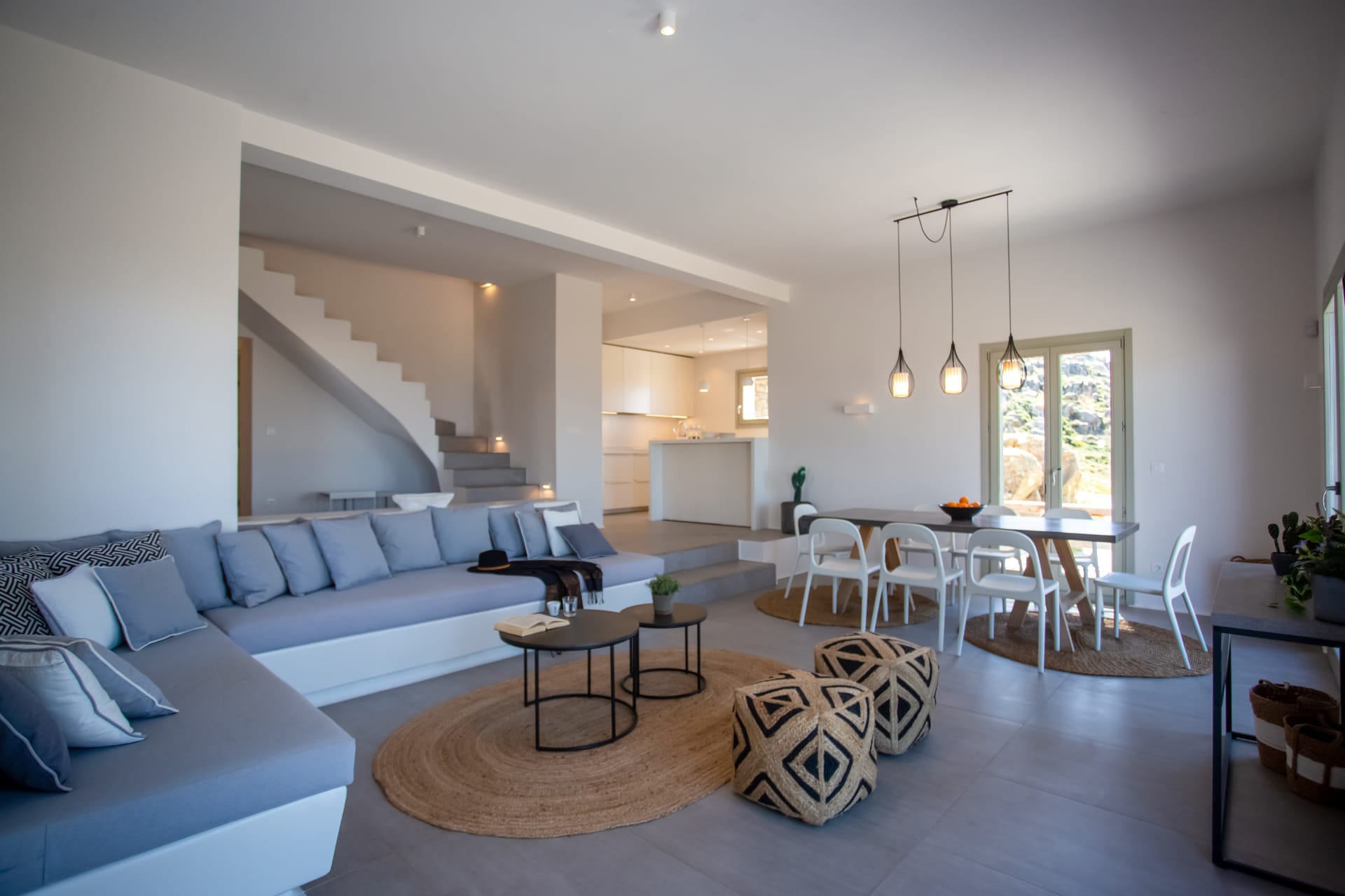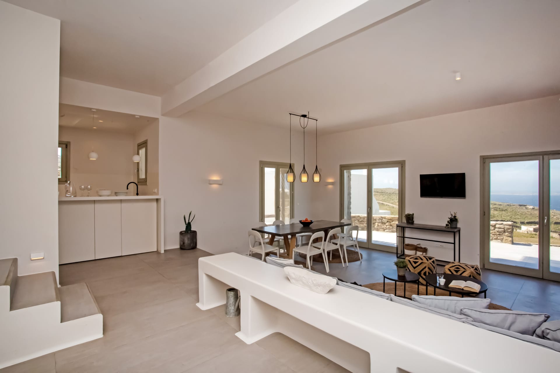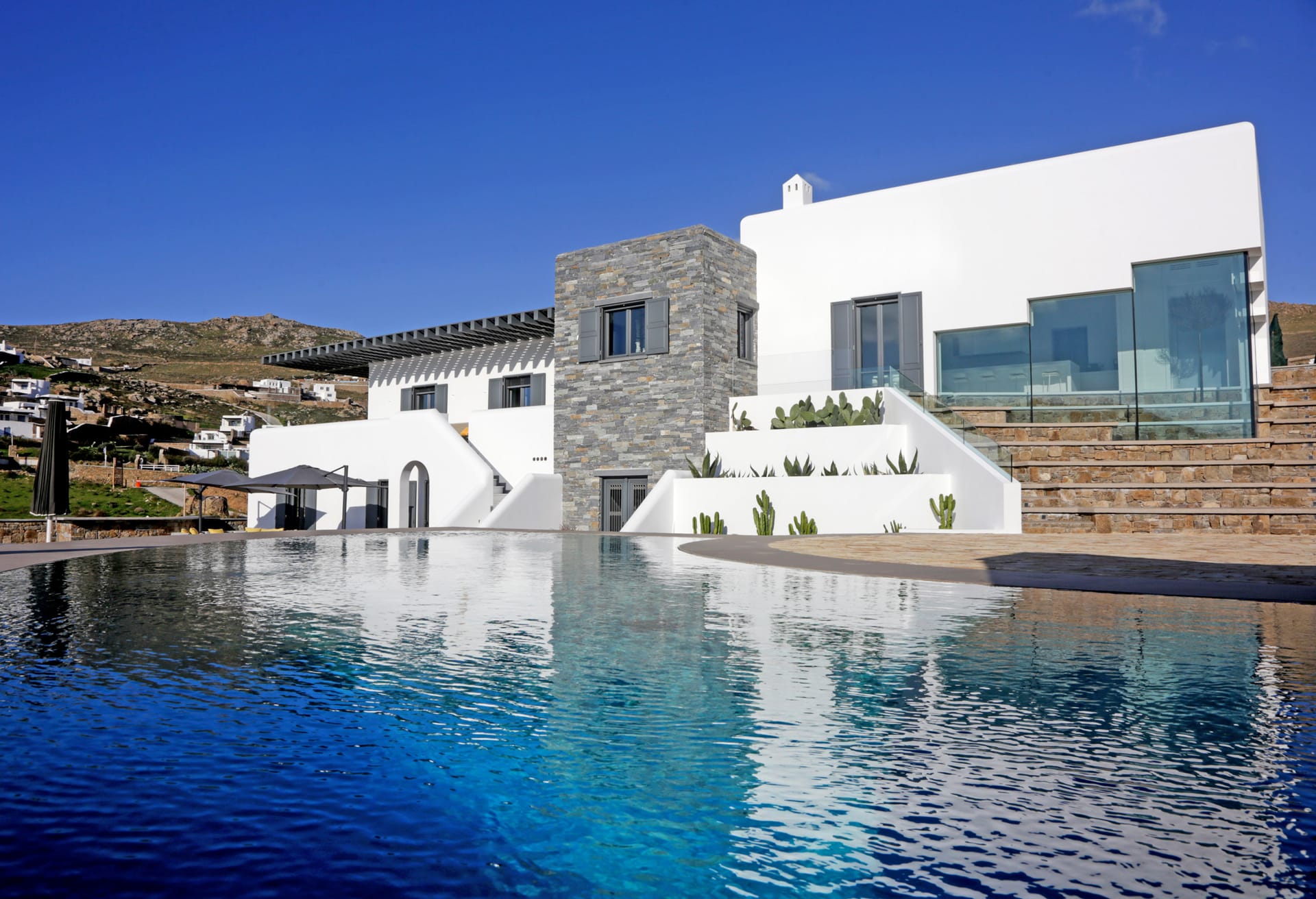 sophisticated minimal, contemporary , luxurious and stylish but also respecting local culture and architecture. designed with relaxed elegance, to serve a family as well as a big group of friends, with focus in functionality. less is more.