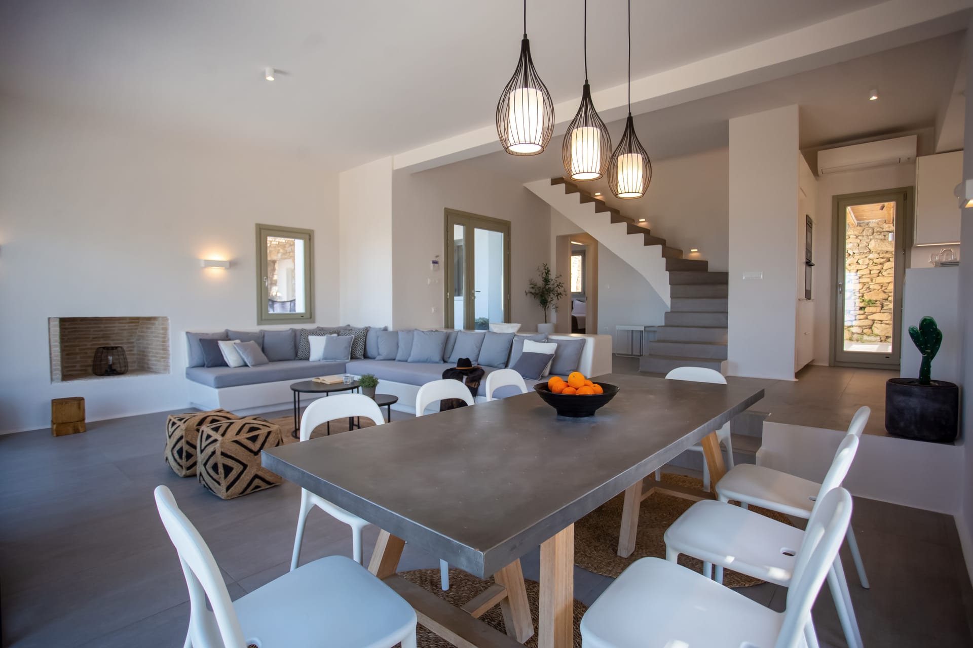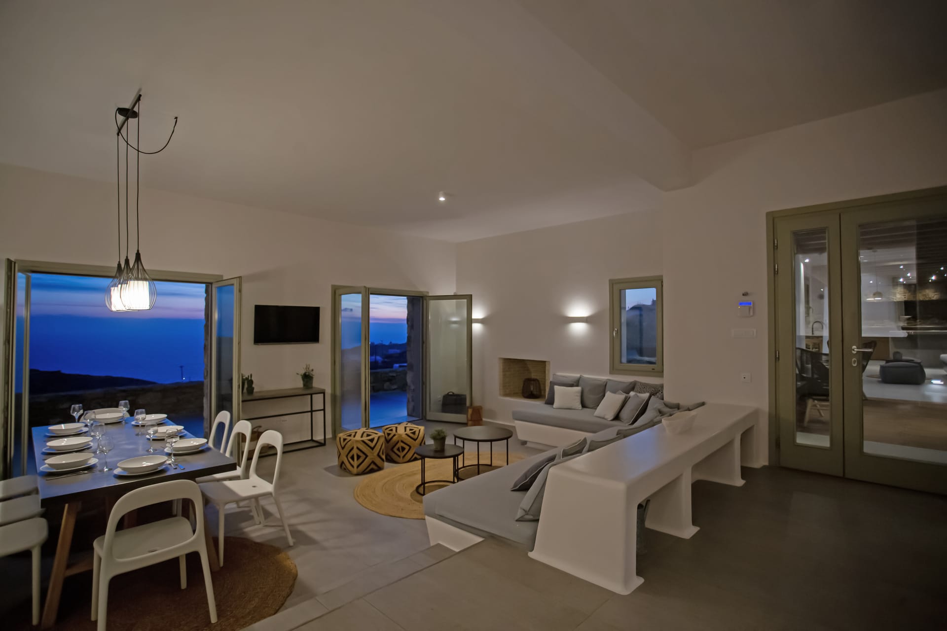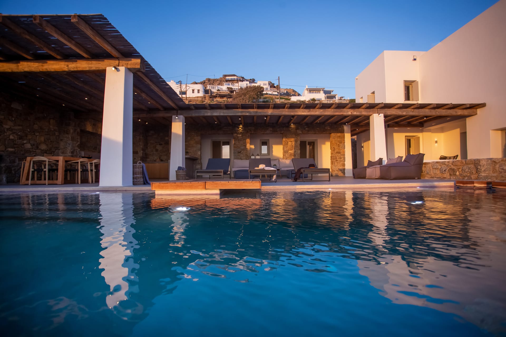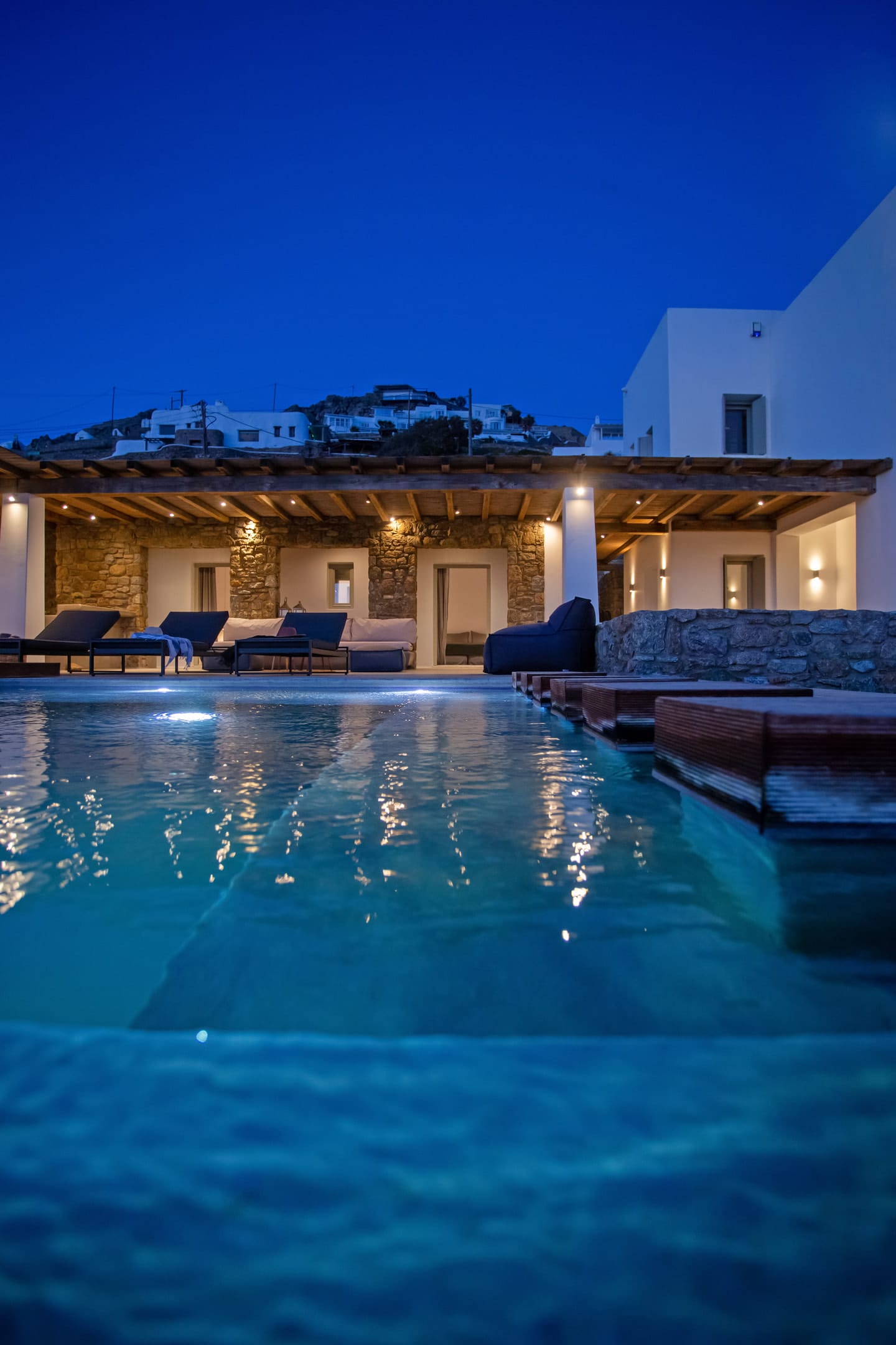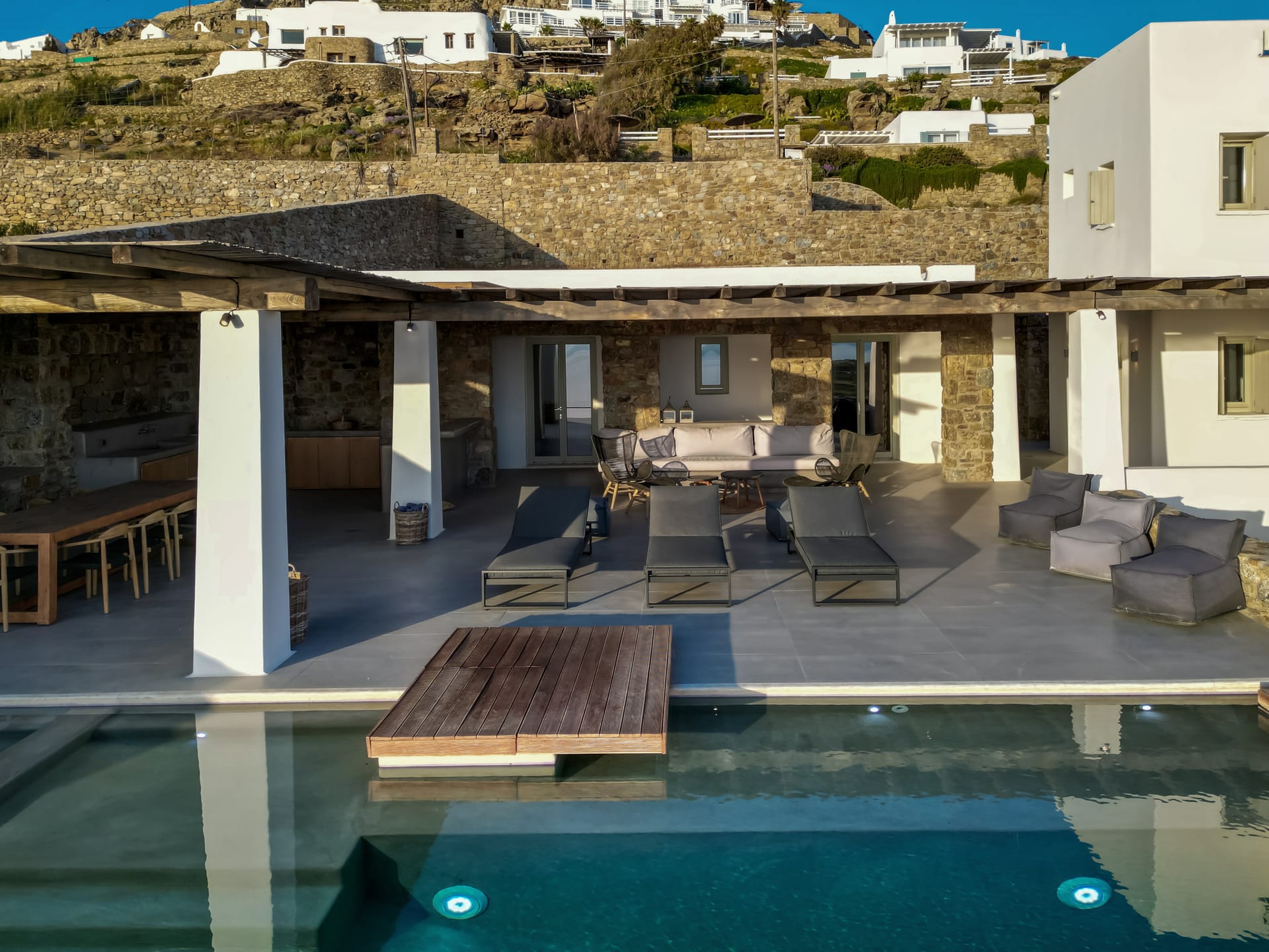 sophisticated minimal, contemporary , luxurious and stylish but also respecting local culture and architecture. designed with relaxed elegance, to serve a family as well as a big group of friends, with focus in functionality. less is more.