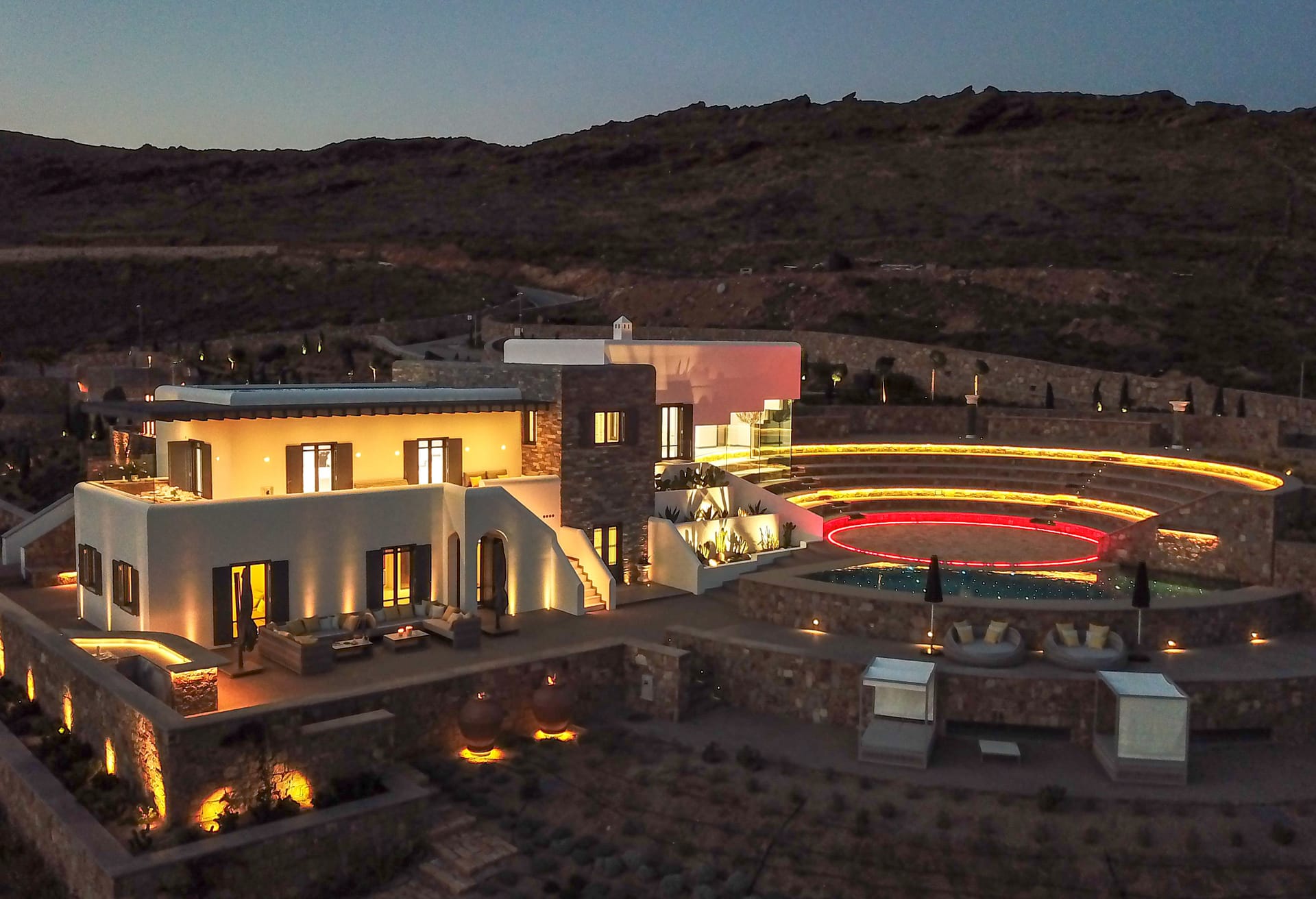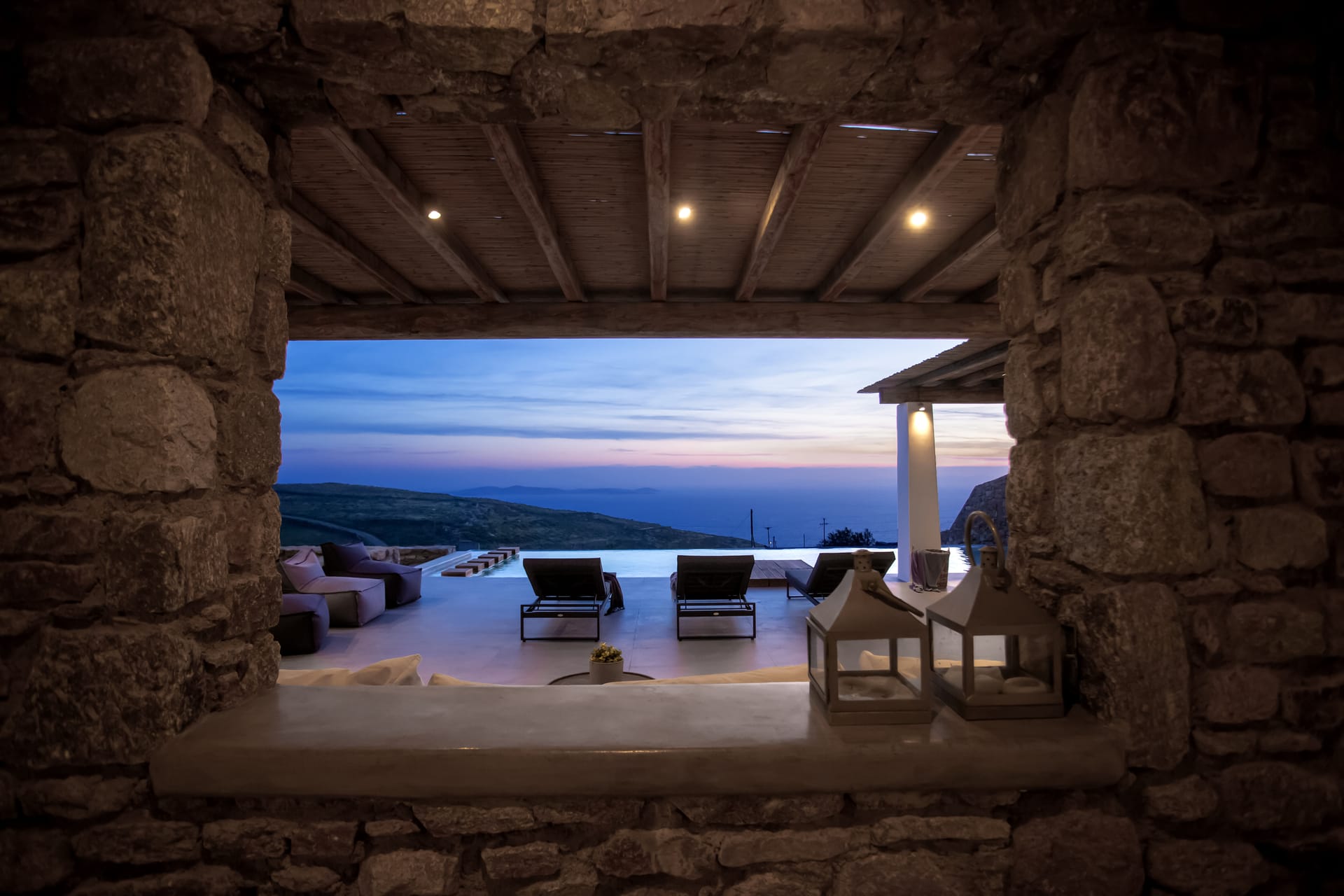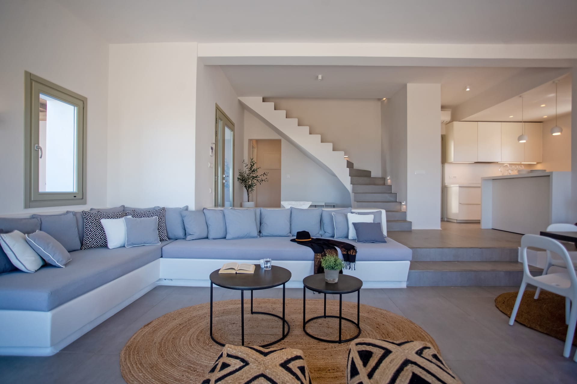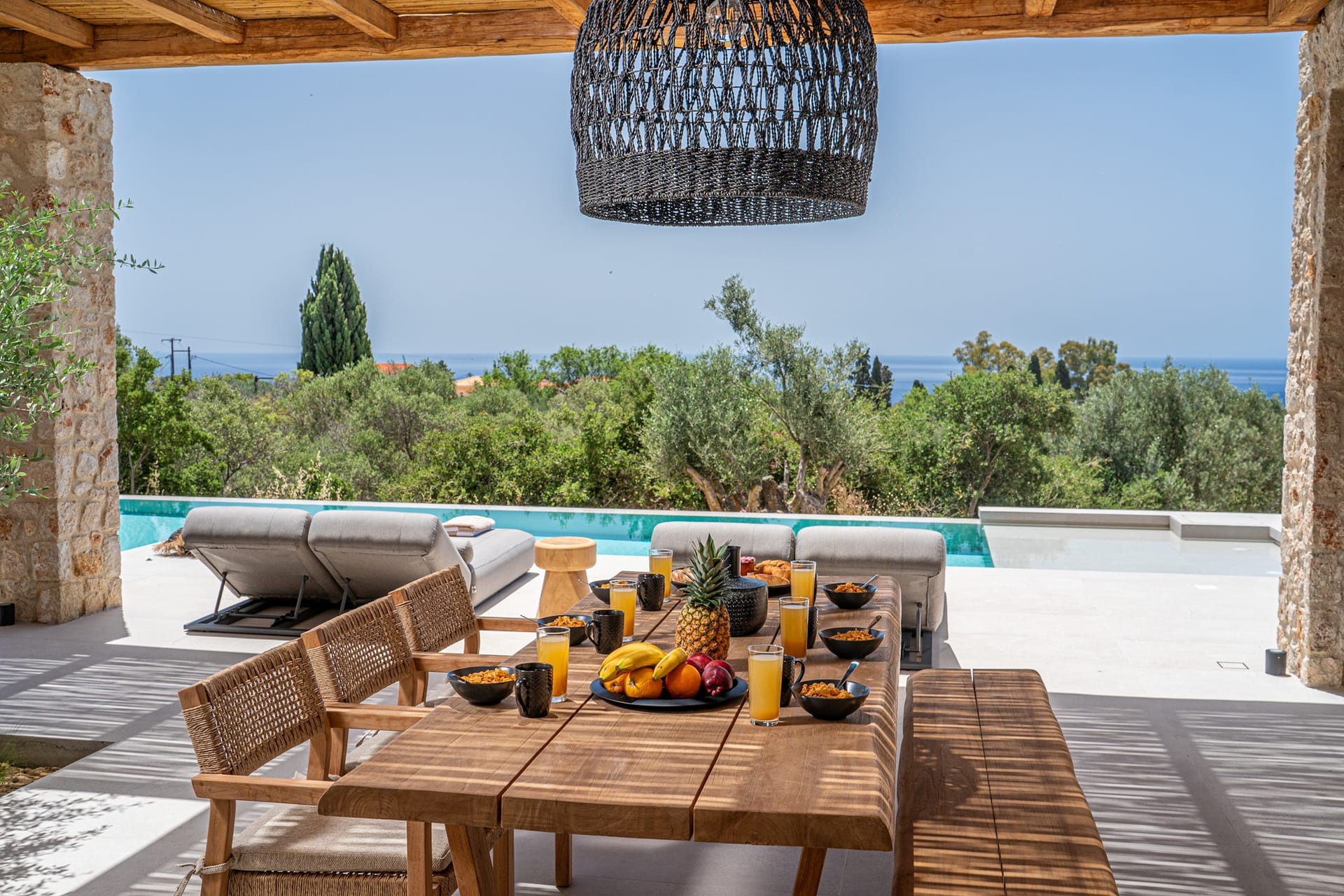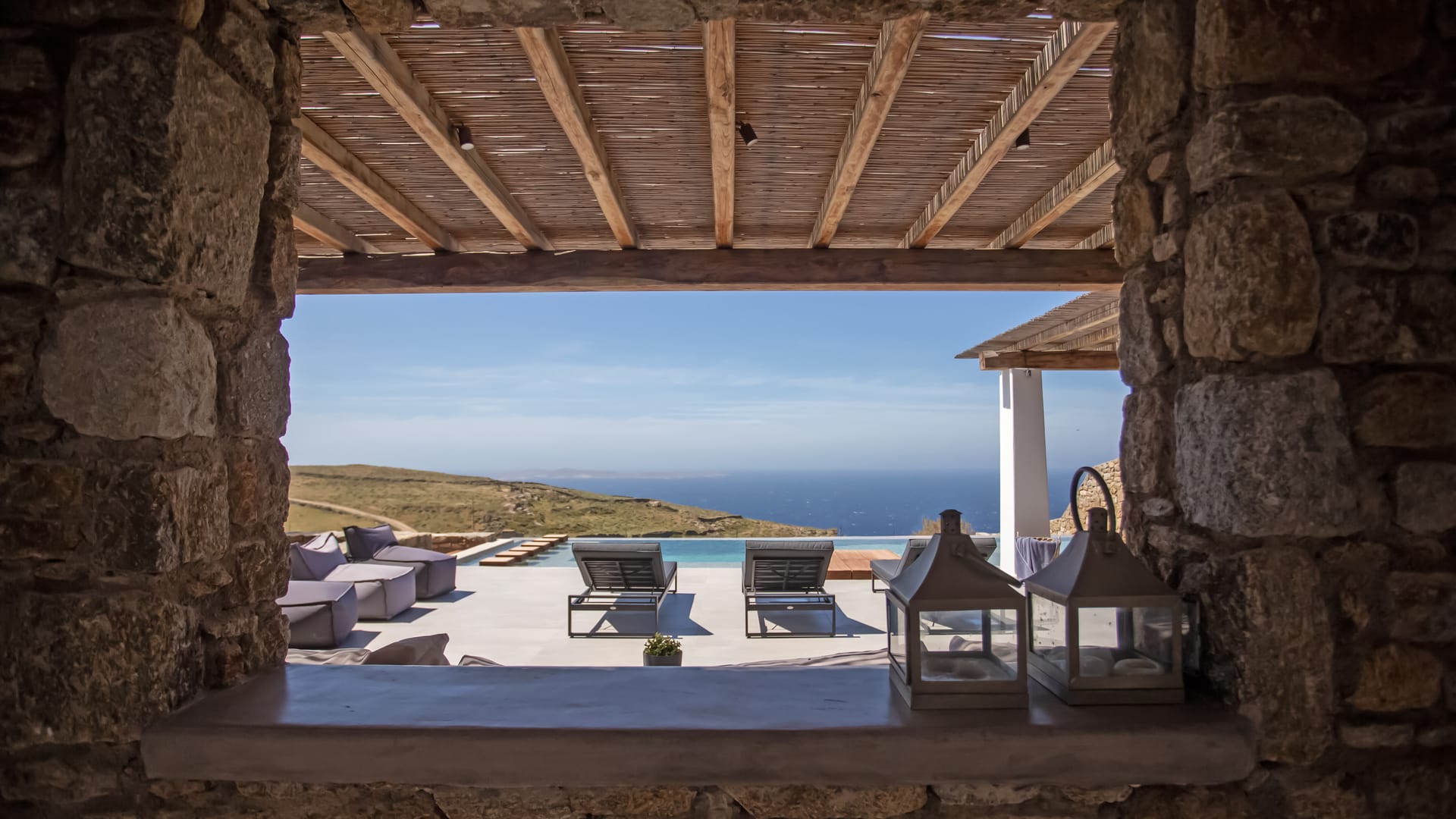 sophisticated minimal, contemporary , luxurious and stylish but also respecting local culture and architecture. designed with relaxed elegance, to serve a family as well as a big group of friends, with focus in functionality. less is more.