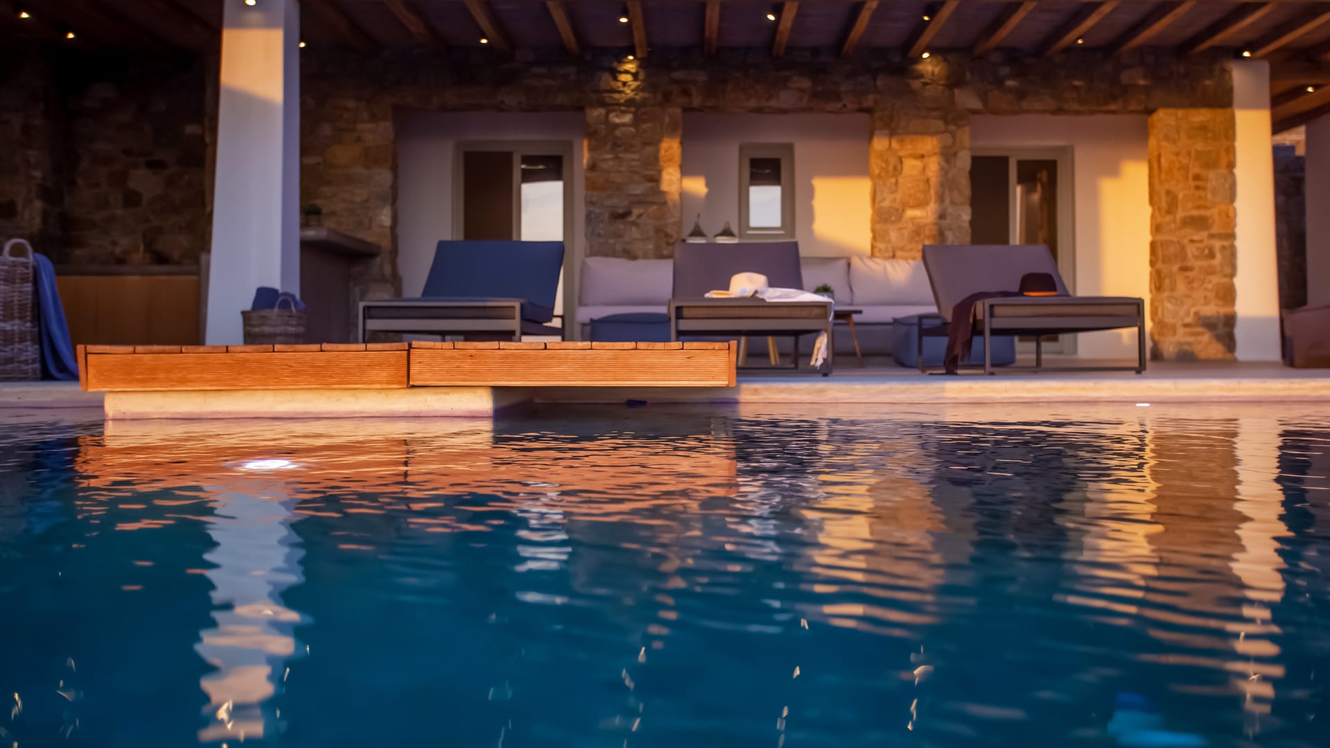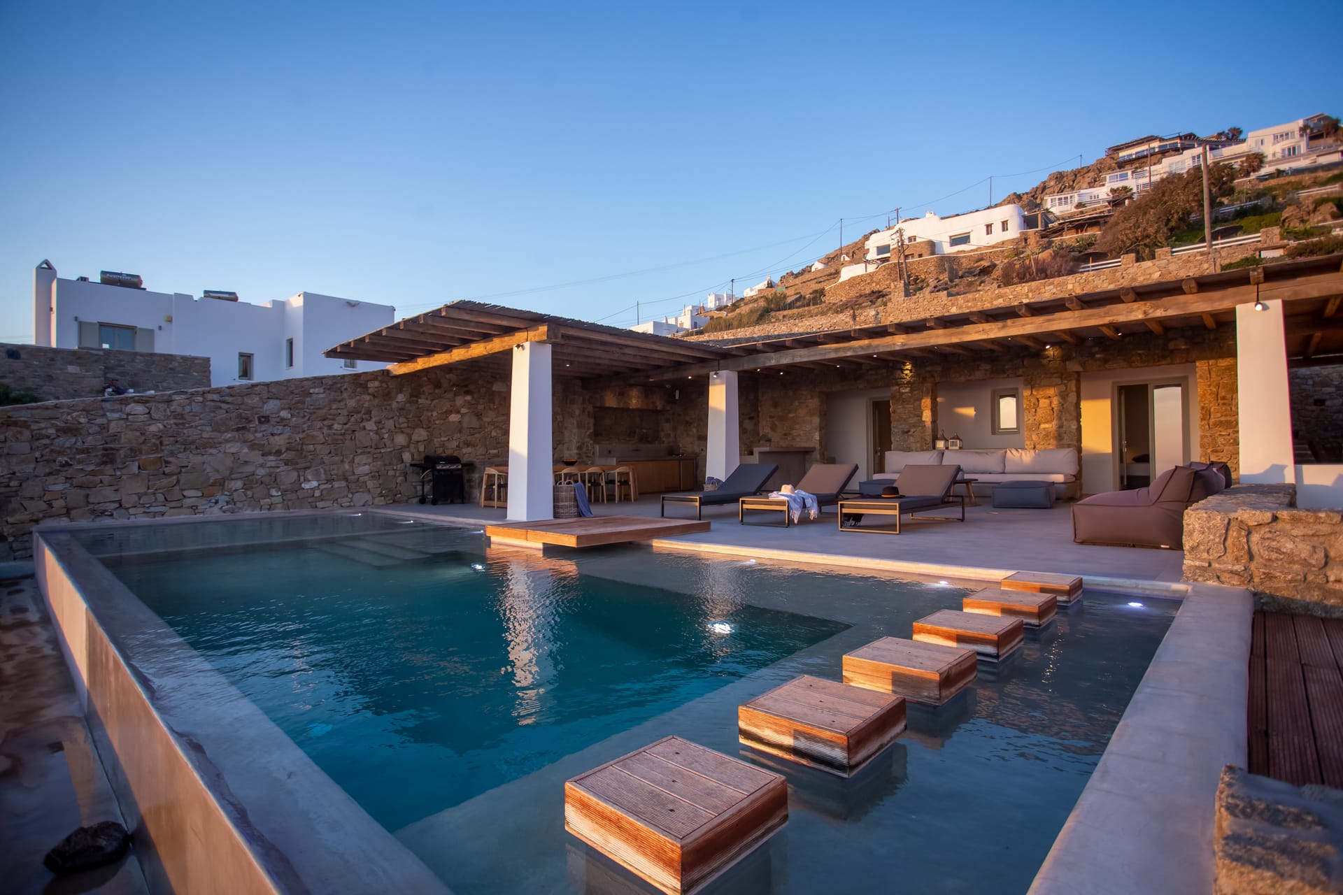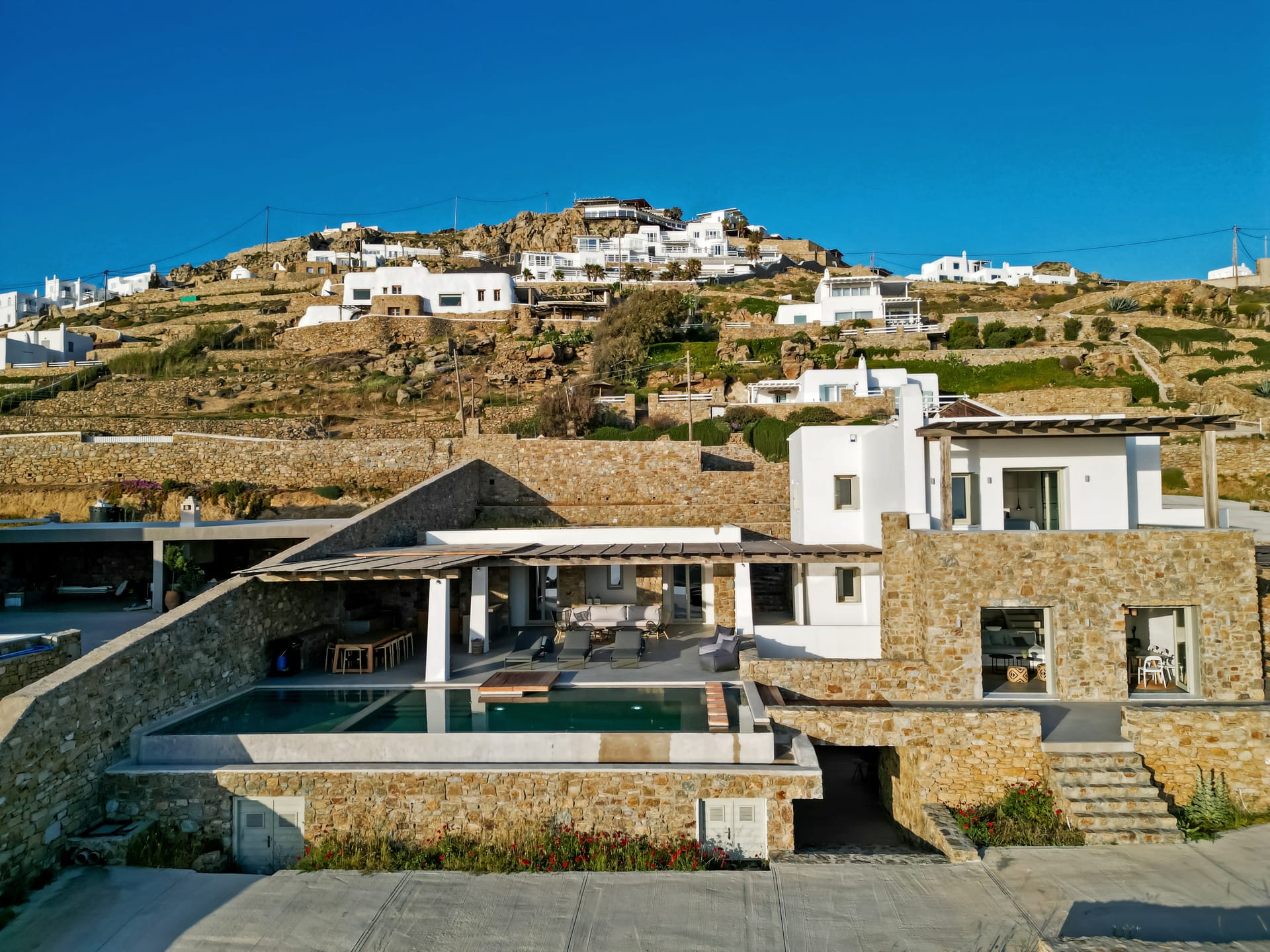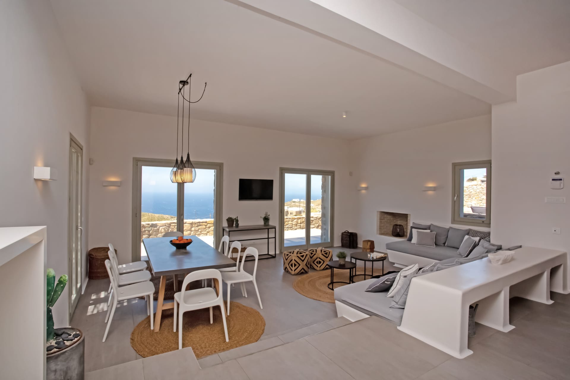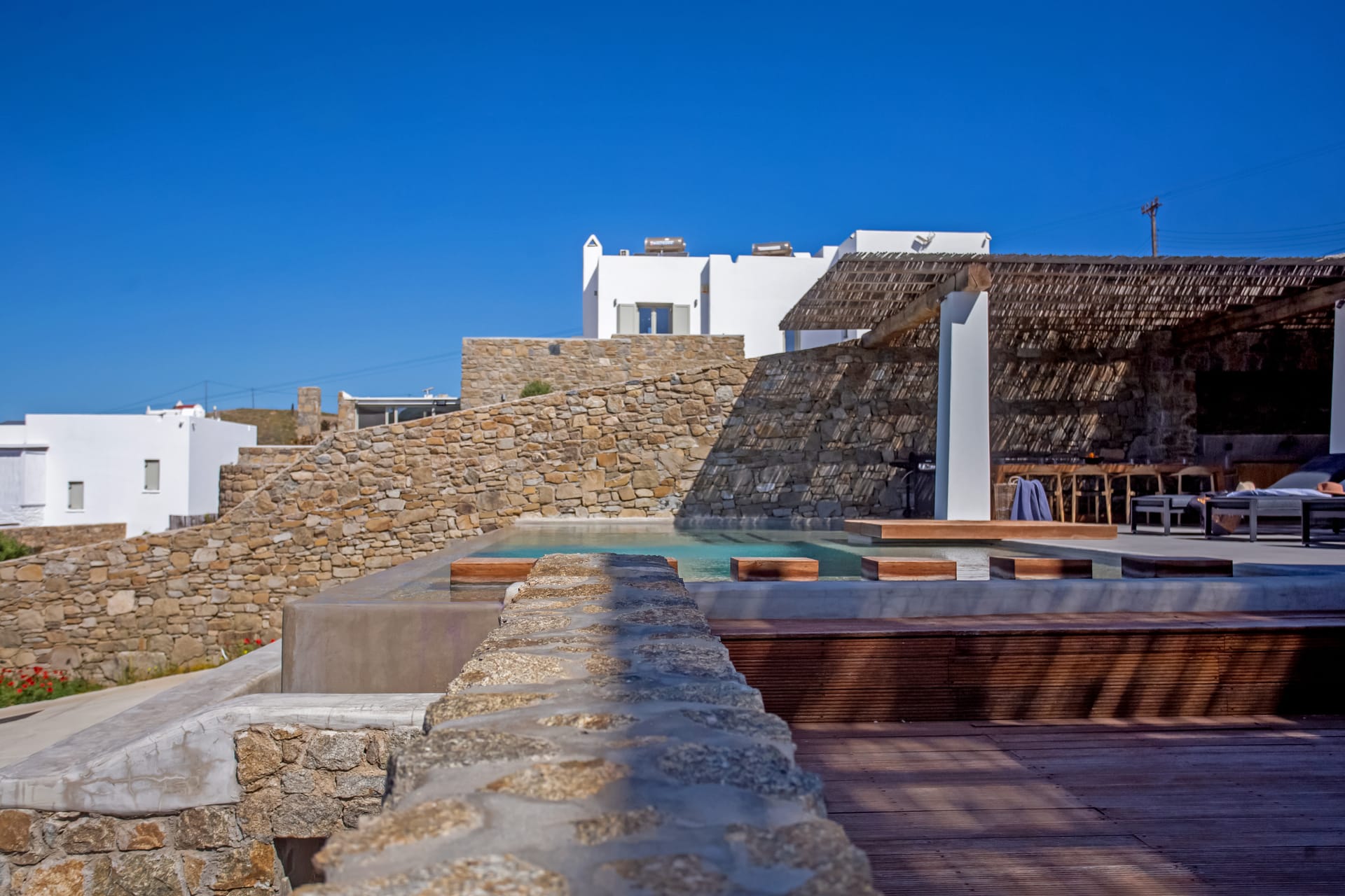 sophisticated minimal, contemporary , luxurious and stylish but also respecting local culture and architecture. designed with relaxed elegance, to serve a family as well as a big group of friends, with focus in functionality. less is more.