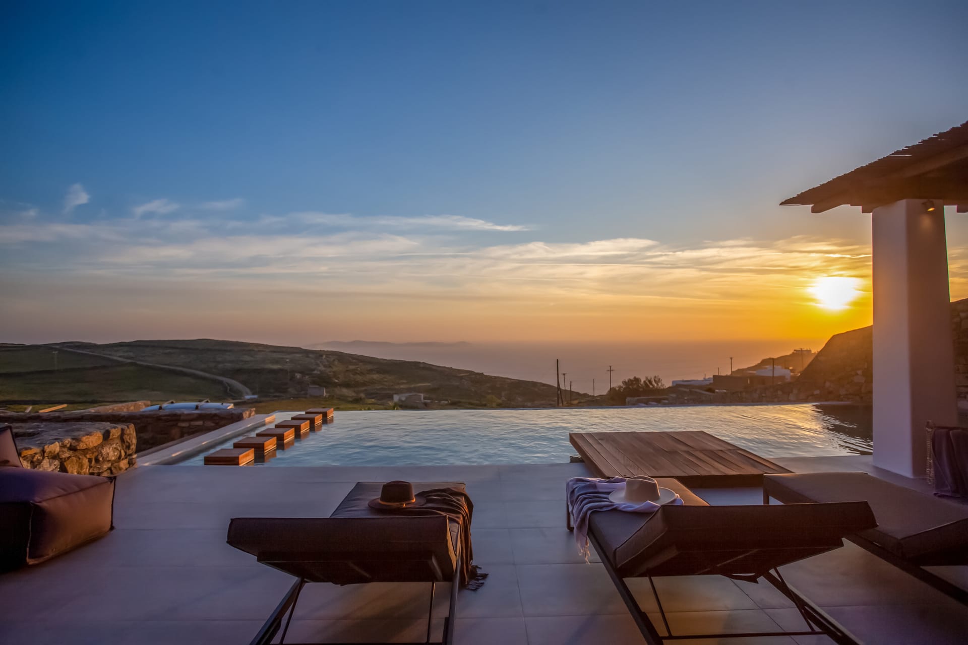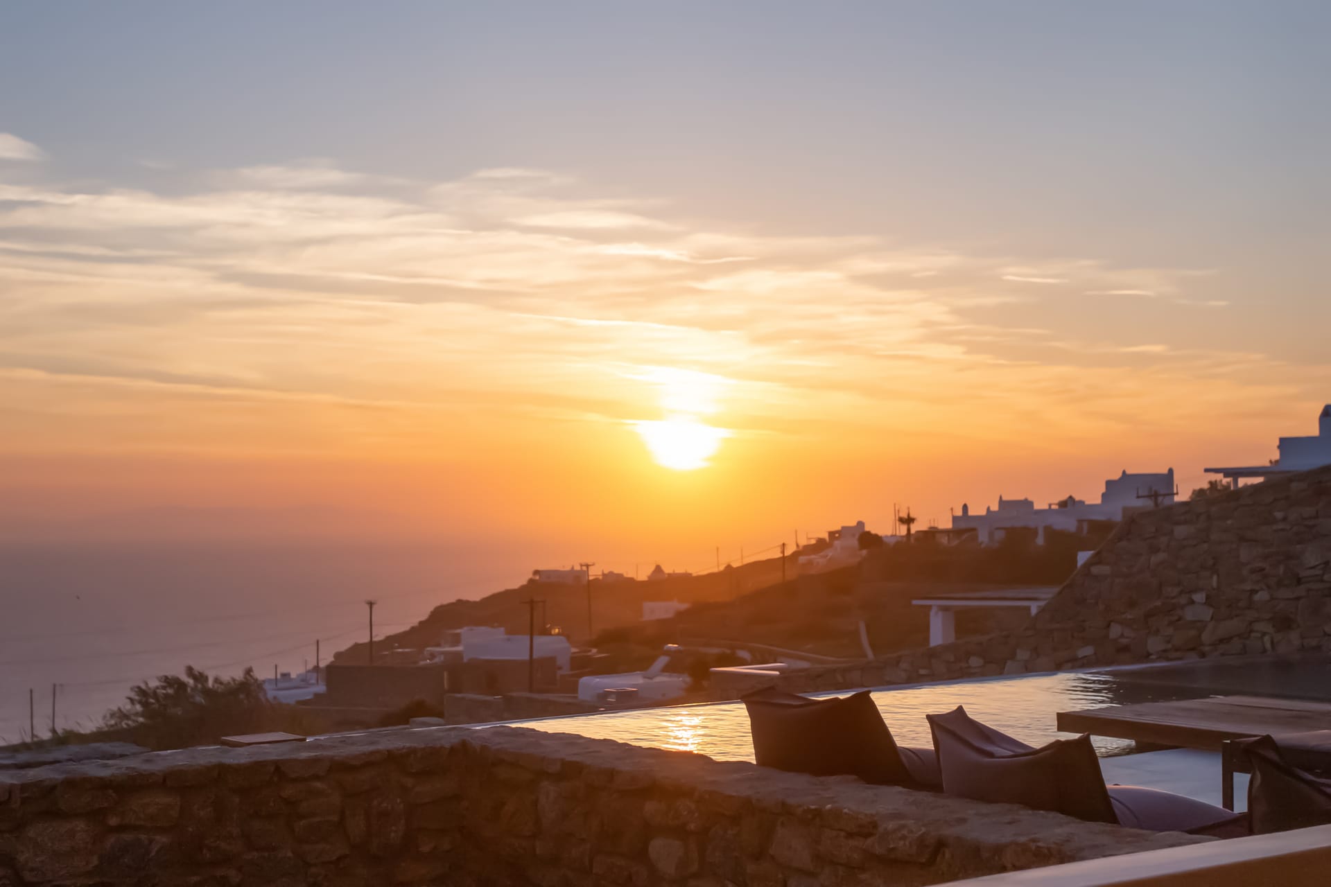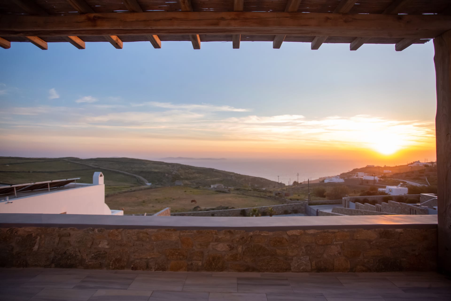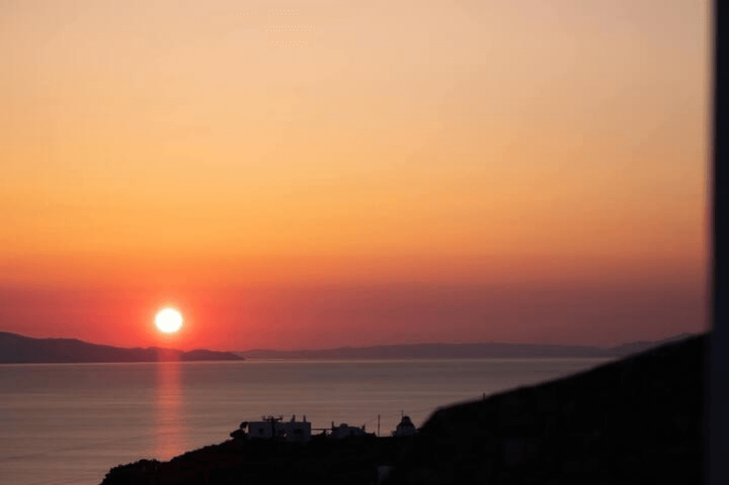 Spectacular views to sea and close islands of Syros, Delos and the Aegean archipelago. Amazing sunset views!