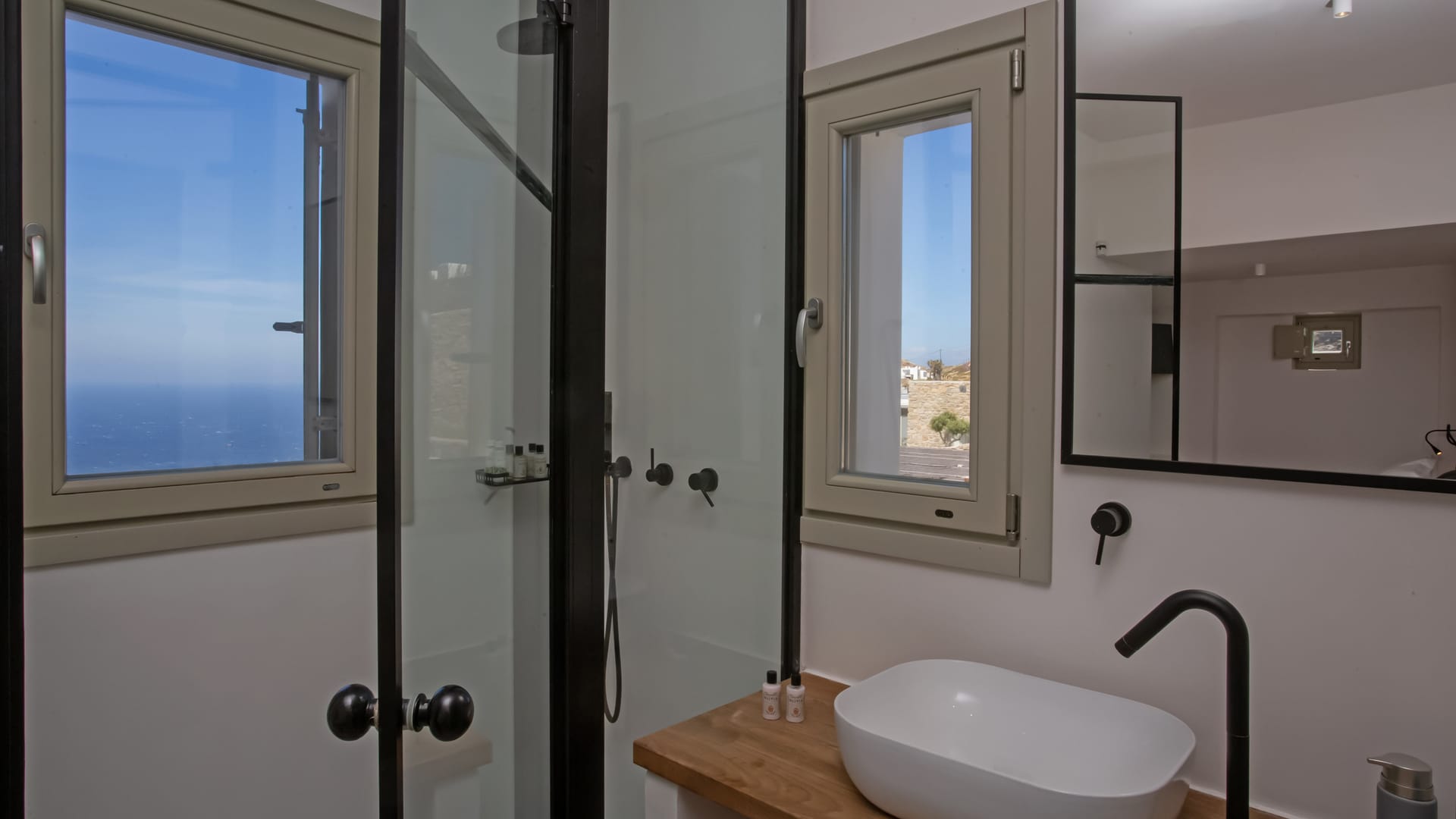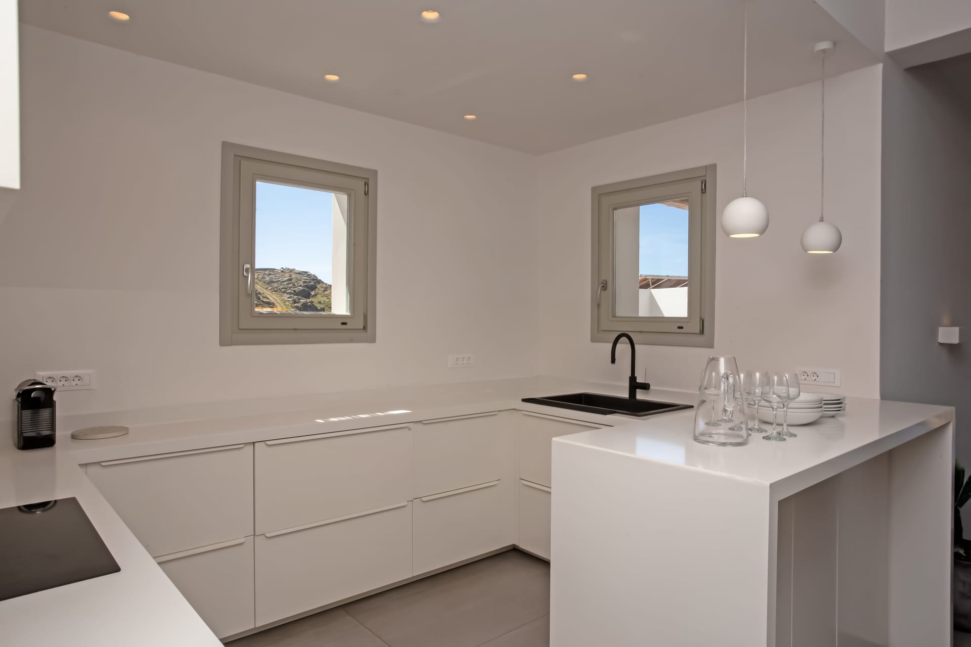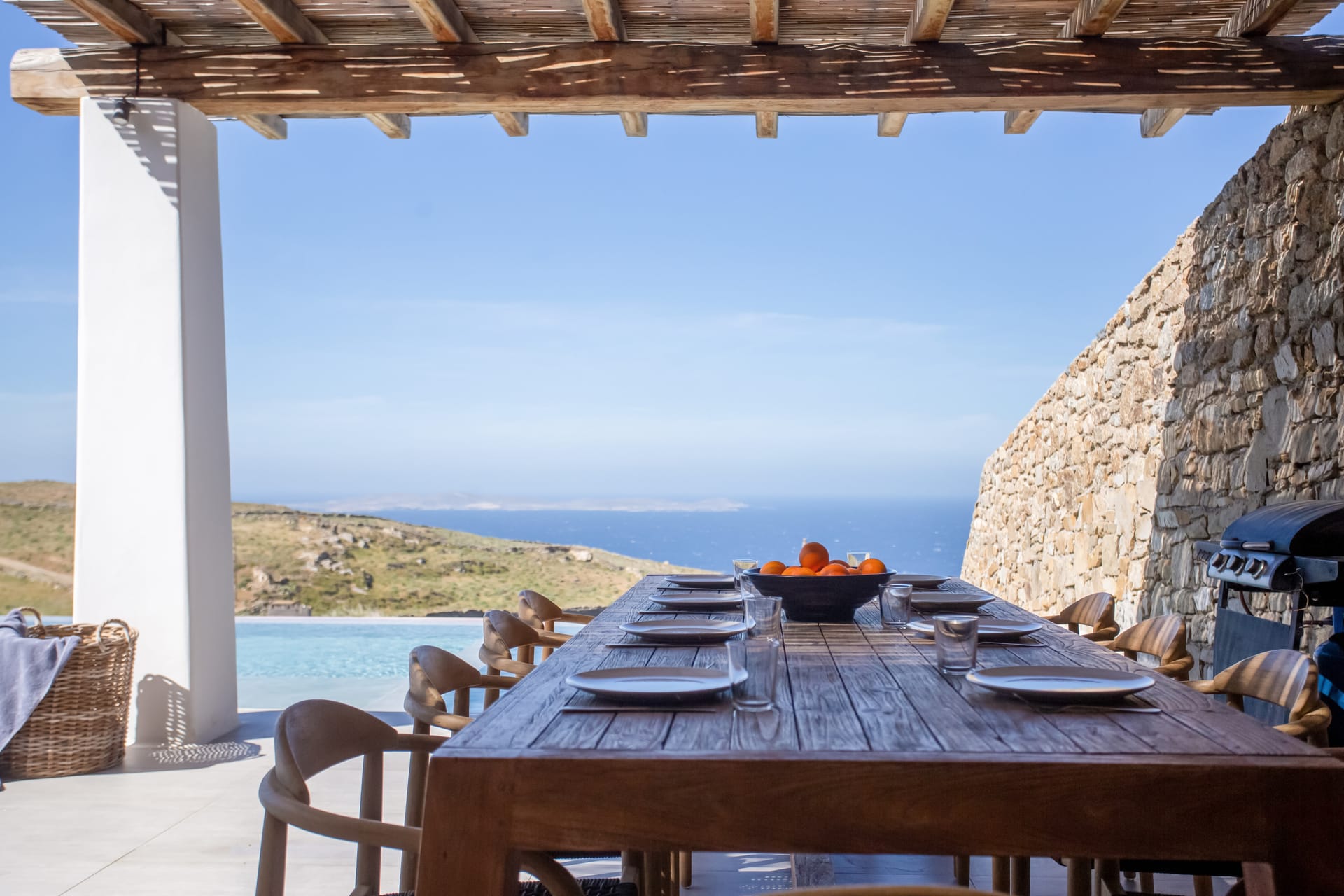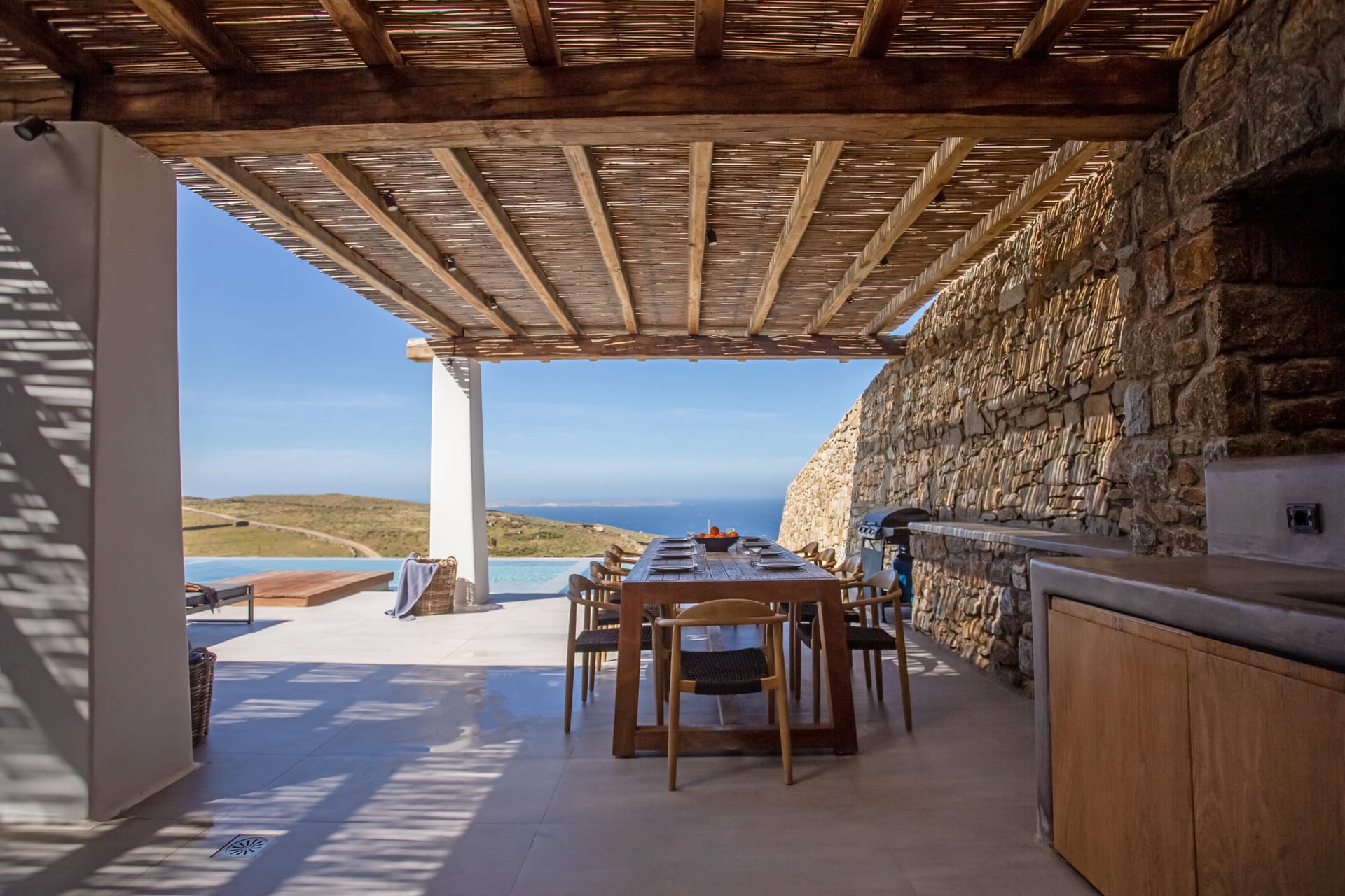 you can enjoy the pool, along with great sea views and same time BBQ or cook in the fully equiped secondary outdoor kitchen. and in the evening you can have cocktails in the bar, enjoying a glorious sunset. both kitchens have stoves, fridge and dishwashers, as well as all basic utensils.