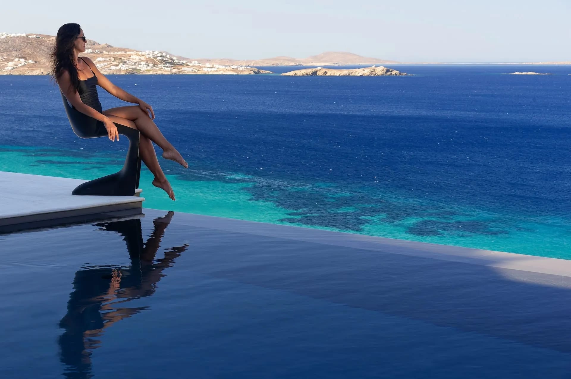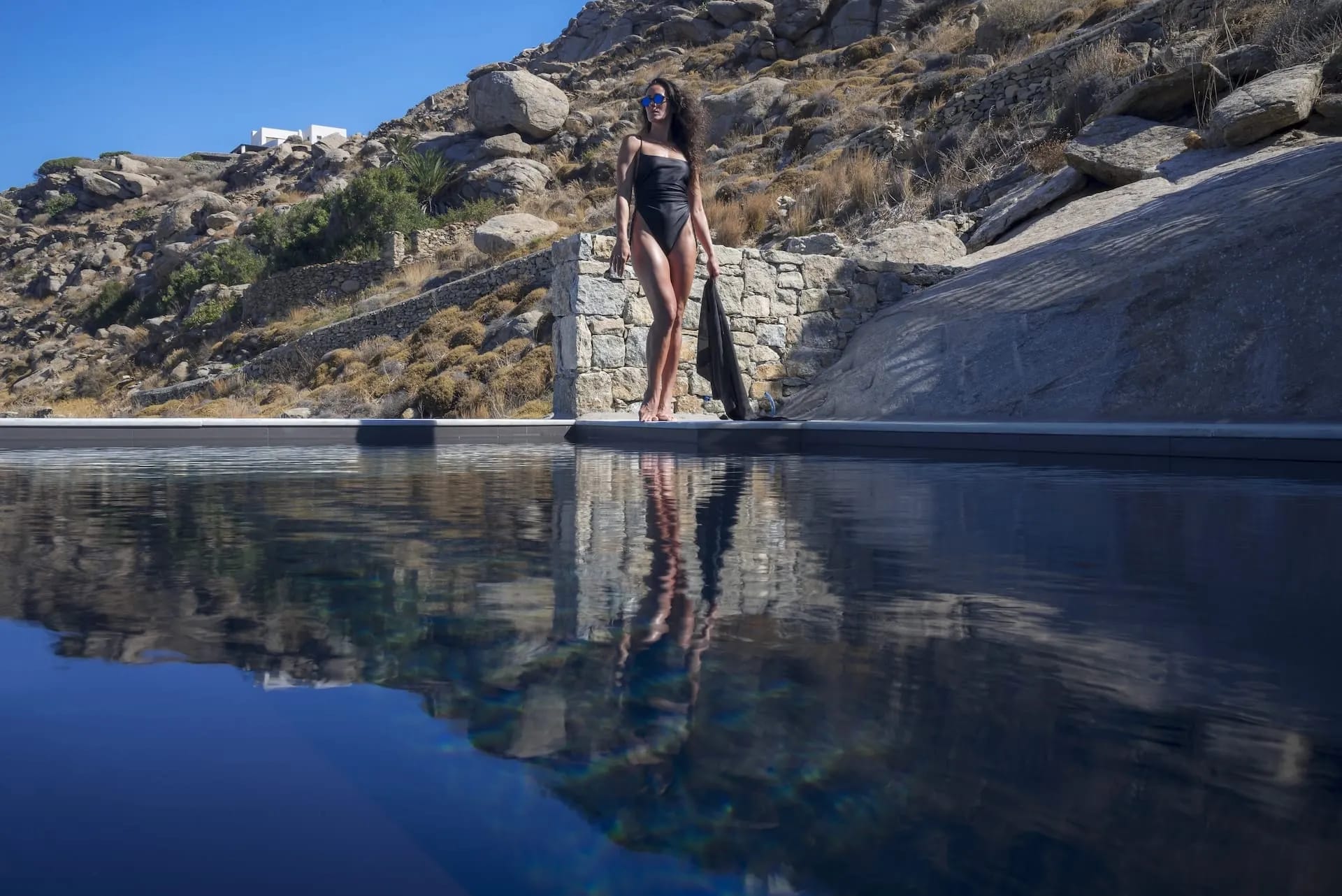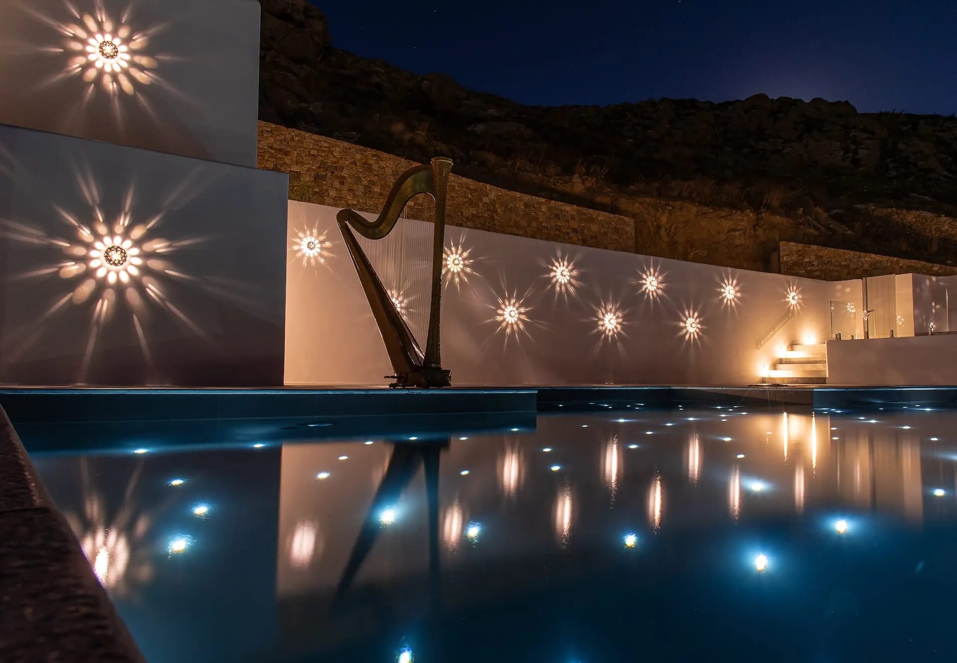 Outdoor living is breathtaking at the Mykonos Riviera 8 bedroom villa: Impressive as much as delightful, its sizeable exterior grounds 250 sqm include a sensational, 80 sqm heated infinity sky pool with starlight effect, lined up with designer cabanas, daybeds, floating sunbeds a beautifully appointed alfresco lounge, a dining area with a large table, a pool bar, a BBQ set up and a shaded pergola.