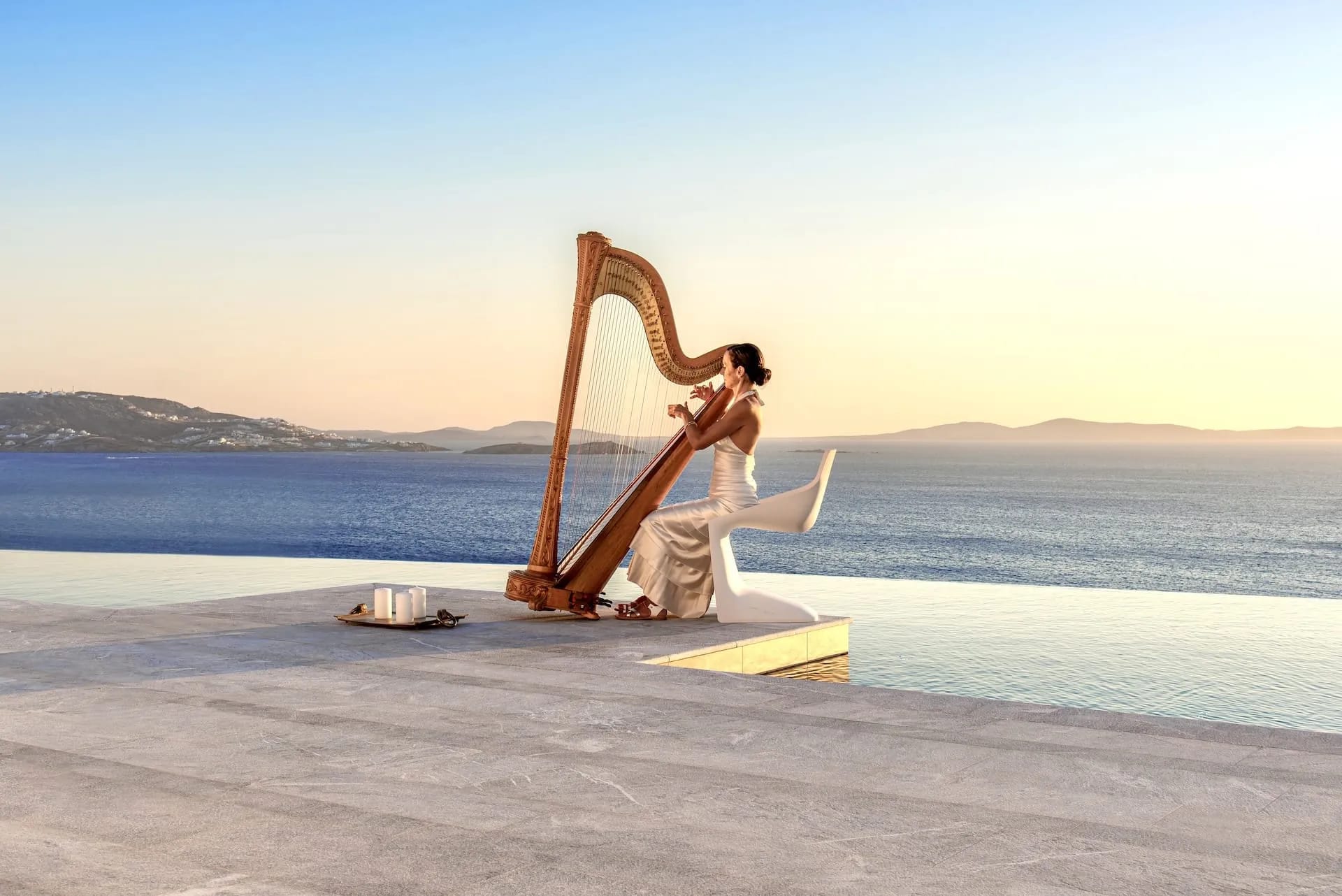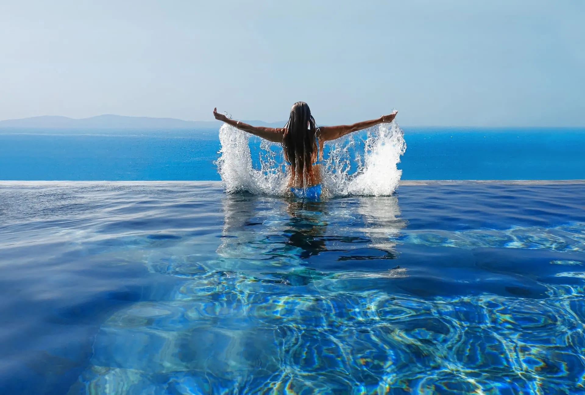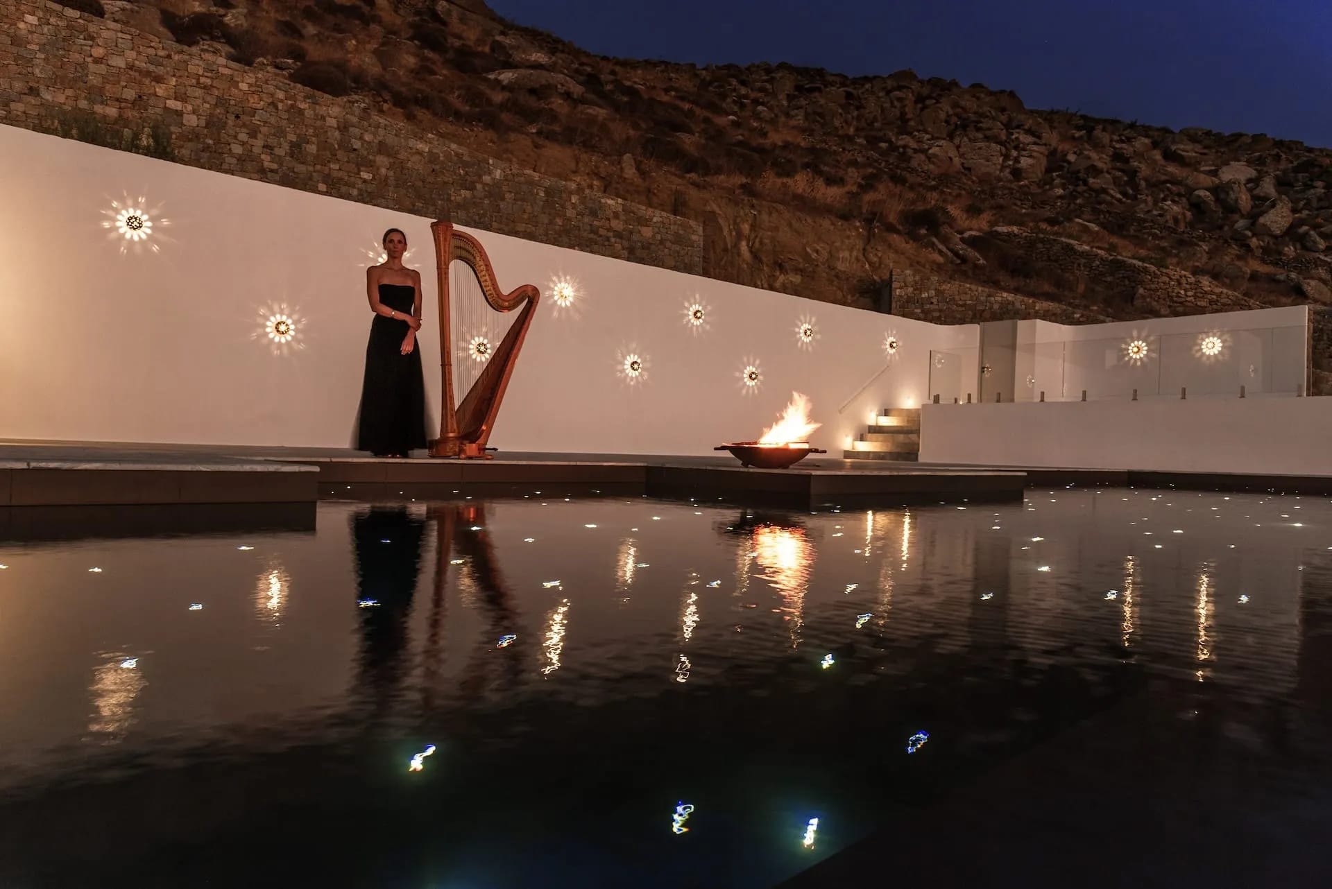 Outdoor living is breathtaking at the Mykonos Riviera 8 bedroom villa: Impressive as much as delightful, its sizeable exterior grounds 250 sqm include a sensational, 80 sqm heated infinity sky pool with starlight effect, lined up with designer cabanas, daybeds, floating sunbeds a beautifully appointed alfresco lounge, a dining area with a large table, a pool bar, a BBQ set up and a shaded pergola.