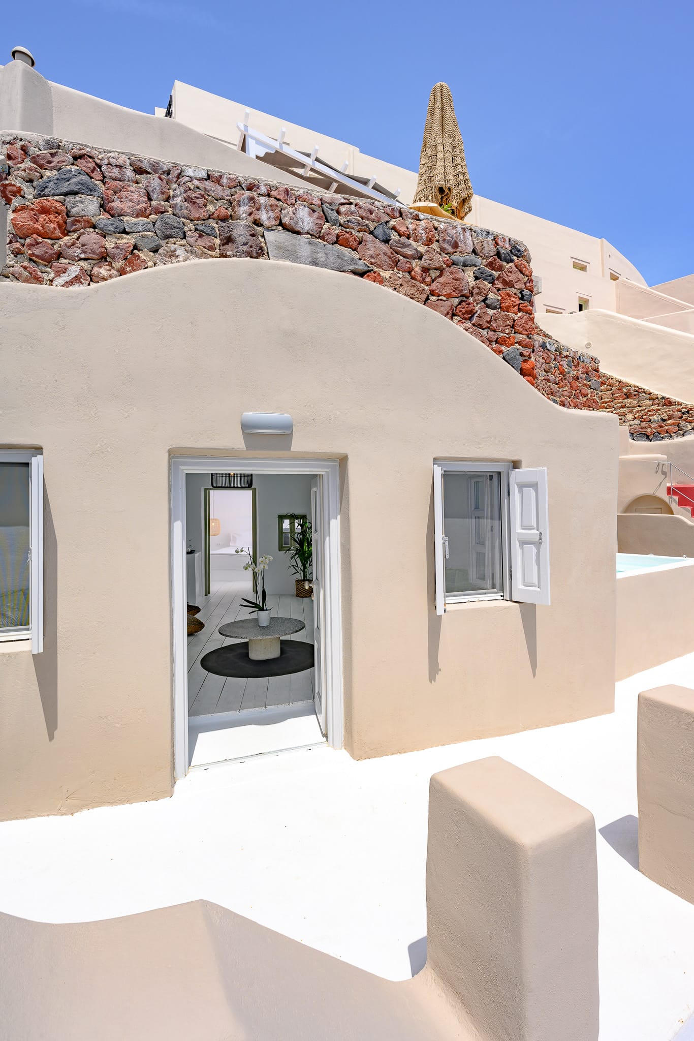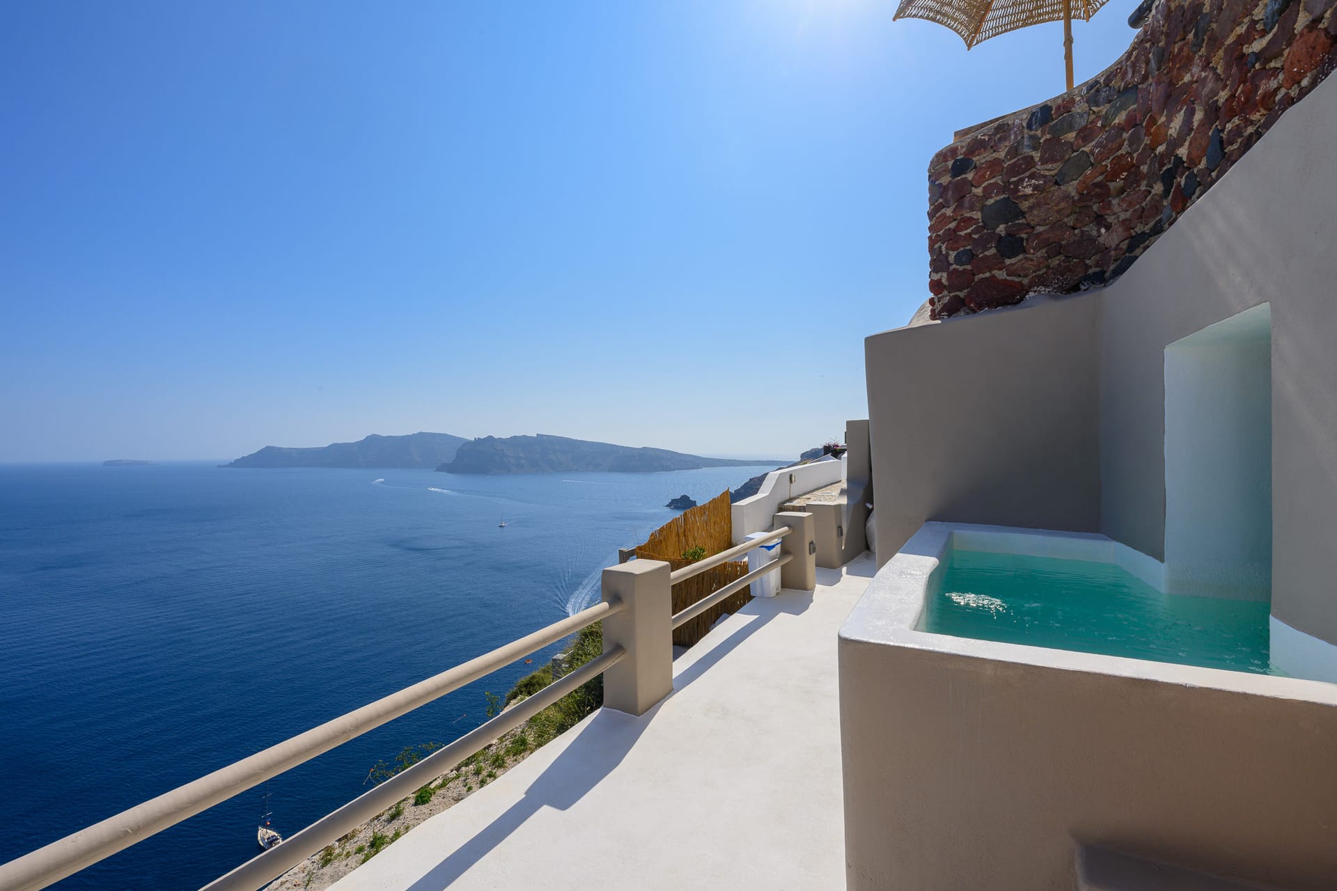 Indoor and outdoor heated plunge pool: Relax in your private plunge pool, perfect for a soothing soak while enjoying the panoramic caldera view and the volcano .