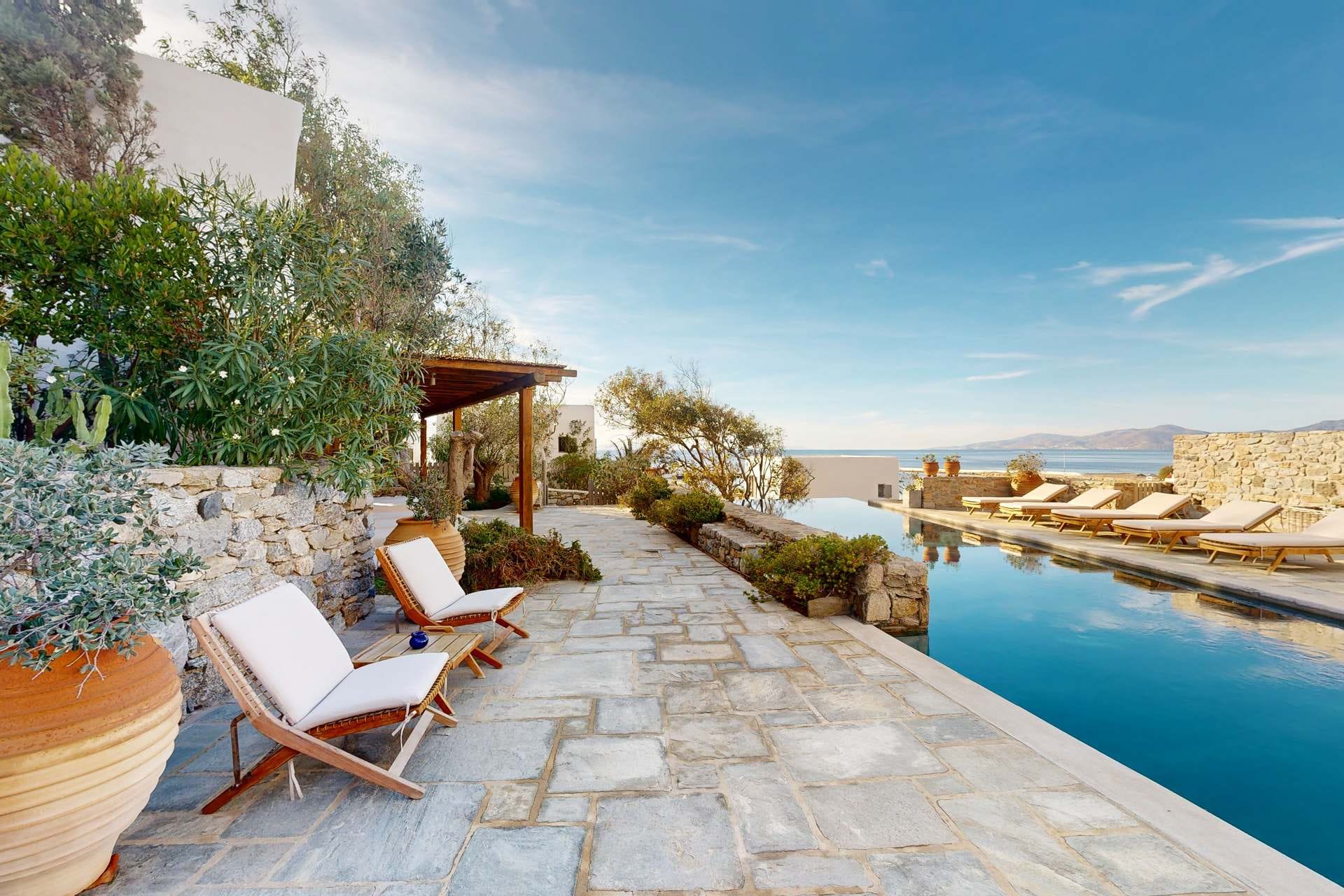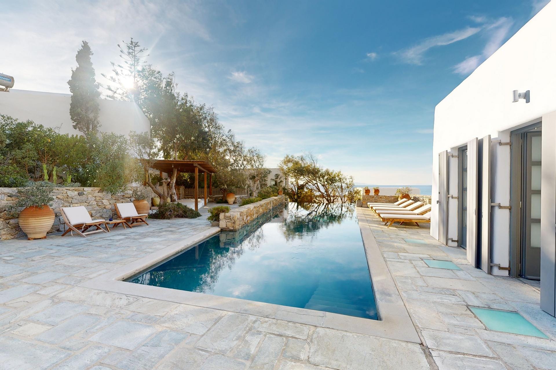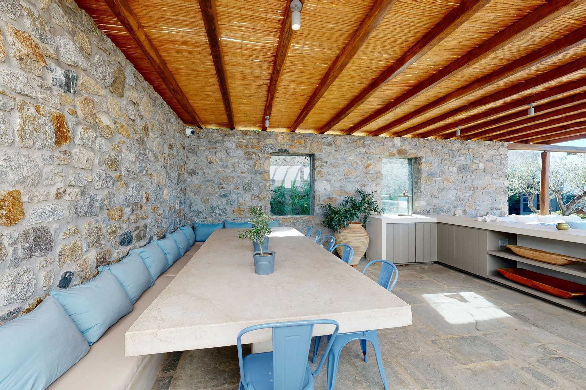 Panormos Bay Premium Villa 2 hosts a stylish bedroom, en suite luxurious bathroom with rainfall shower, an airy living room with a contemporary minimalist kitchenette and a sun kissed capacious private terrace embracing a private pool bounded by stylish and comfy sunbeds, a generous shaded sitting area and a stone-built BBQ. The perfect choice for guests wishing to sojourn with bespoke intimacy in an opulent environment.