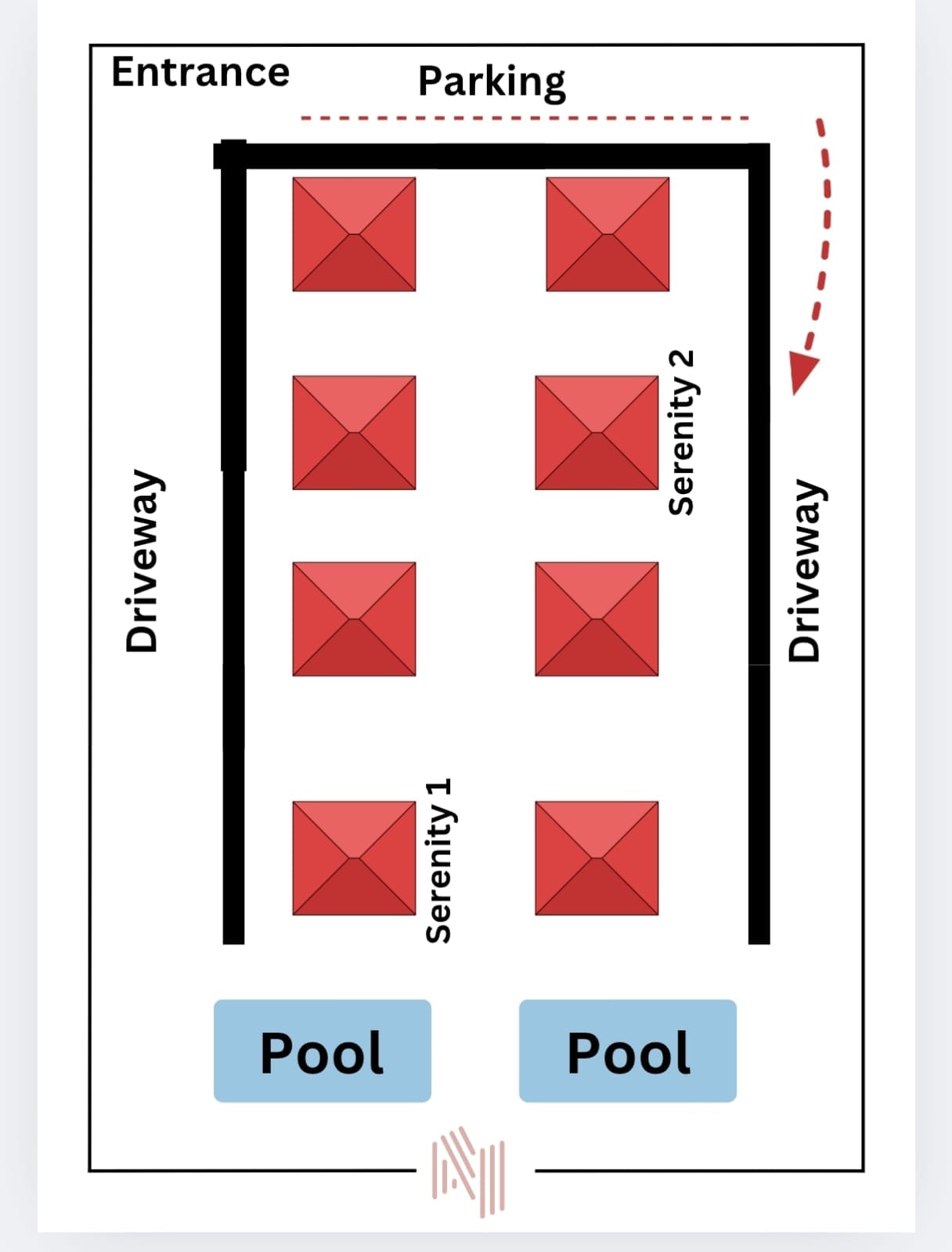 The basement of the Villa includes a hall with a sofa bed that expands into a queen, a separate bedroom with a queen-size bed, and a shared bathroom and a laundry Room. On the ground floor, you'll find a welcoming lounge area, a fully equipped kitchen, and a bedroom featuring two single beds, along with a bathroom and access to the patio and BBQ area. The first floor boasts a loft-style master bedroom with a queen bed, en-suite bathroom, and private balcony overlooking the shared pool!