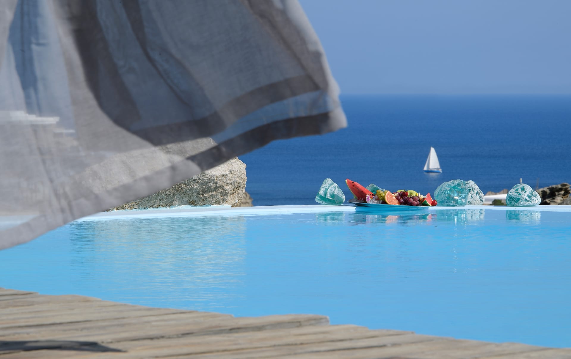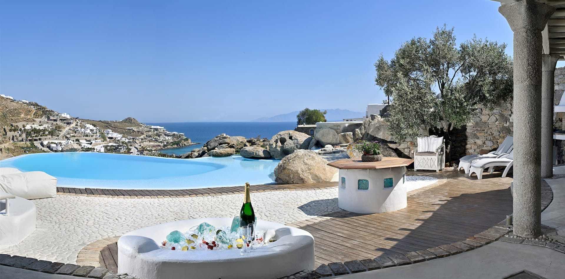 The highlight of the outdoor space is undoubtedly the infinity pool, offering a mesmerizing vista of the Aegean Sea that stretches to the horizon.