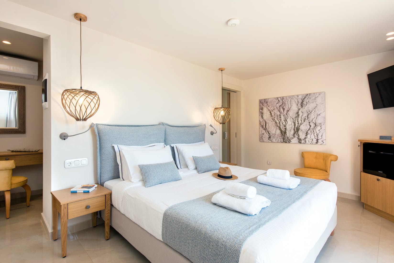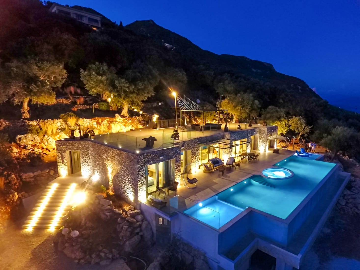 As you enter the Villa, there is a spacious living room with a TV ideal for relaxing while gazing at the wonderful view. A dining area (can host up to 12 guests) and a fully equipped open-plan kitchen with all modern equipment and amenities shares the immense open space of the living and dining room. Large floor-to-ceiling windows open to the pool lounge from the vast open space lounging and dining area. On the same level, there are two ensuite bedrooms with Super-King-sized beds with french windows onto the pool area. There are also two more ensuite bedrooms with Super-King-sized beds that can be transformed into twin beds.