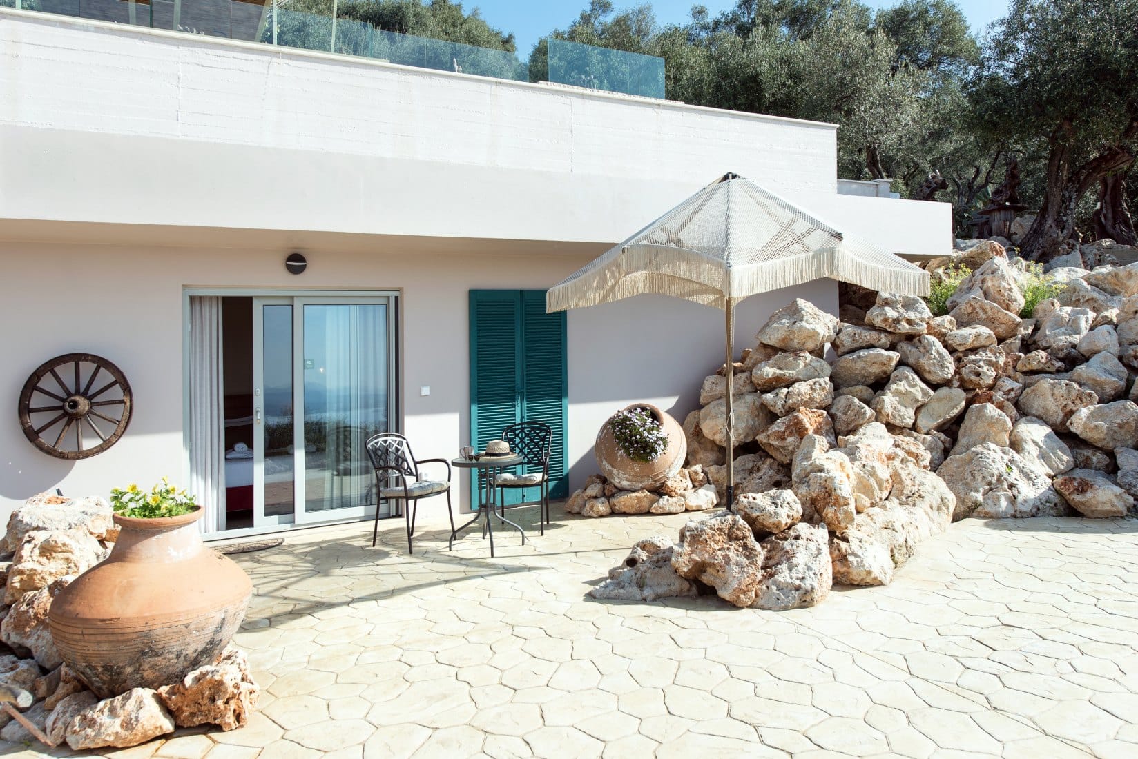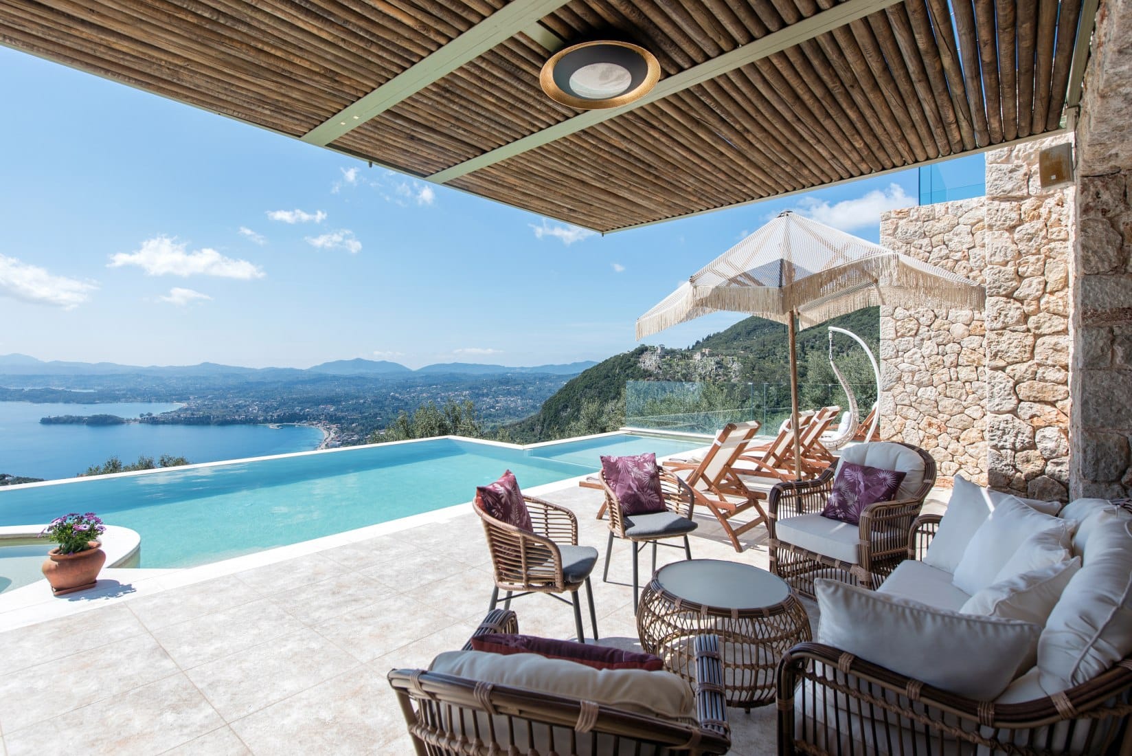 Nestled in a peaceful location on the rocky mountainside amongst acres of Greek Mediterranean plantation, in the region of Spartylas, in Corfu, the charming Villa Cyrene is the ideal destination for families or groups of friends who pursuing seclusion moments.