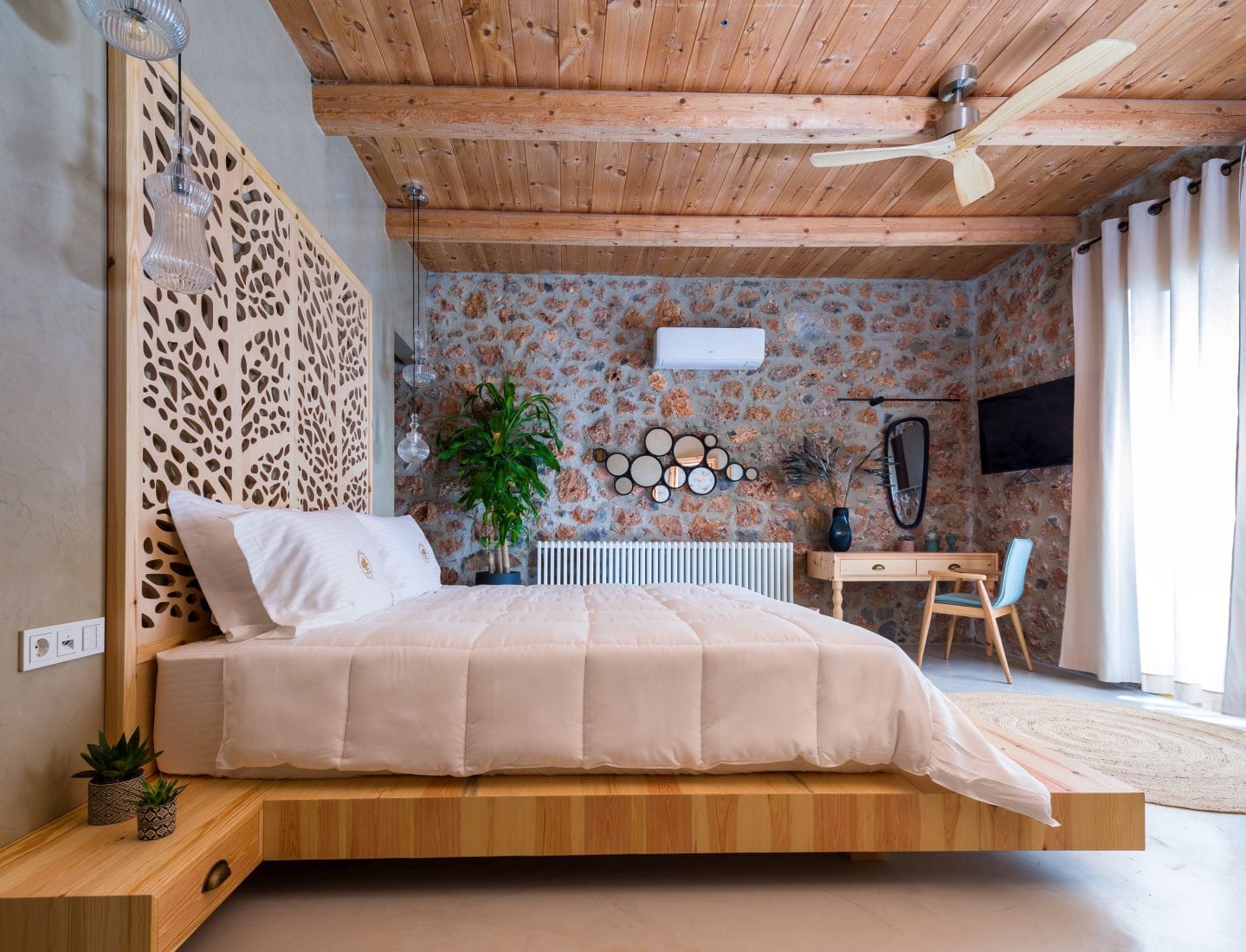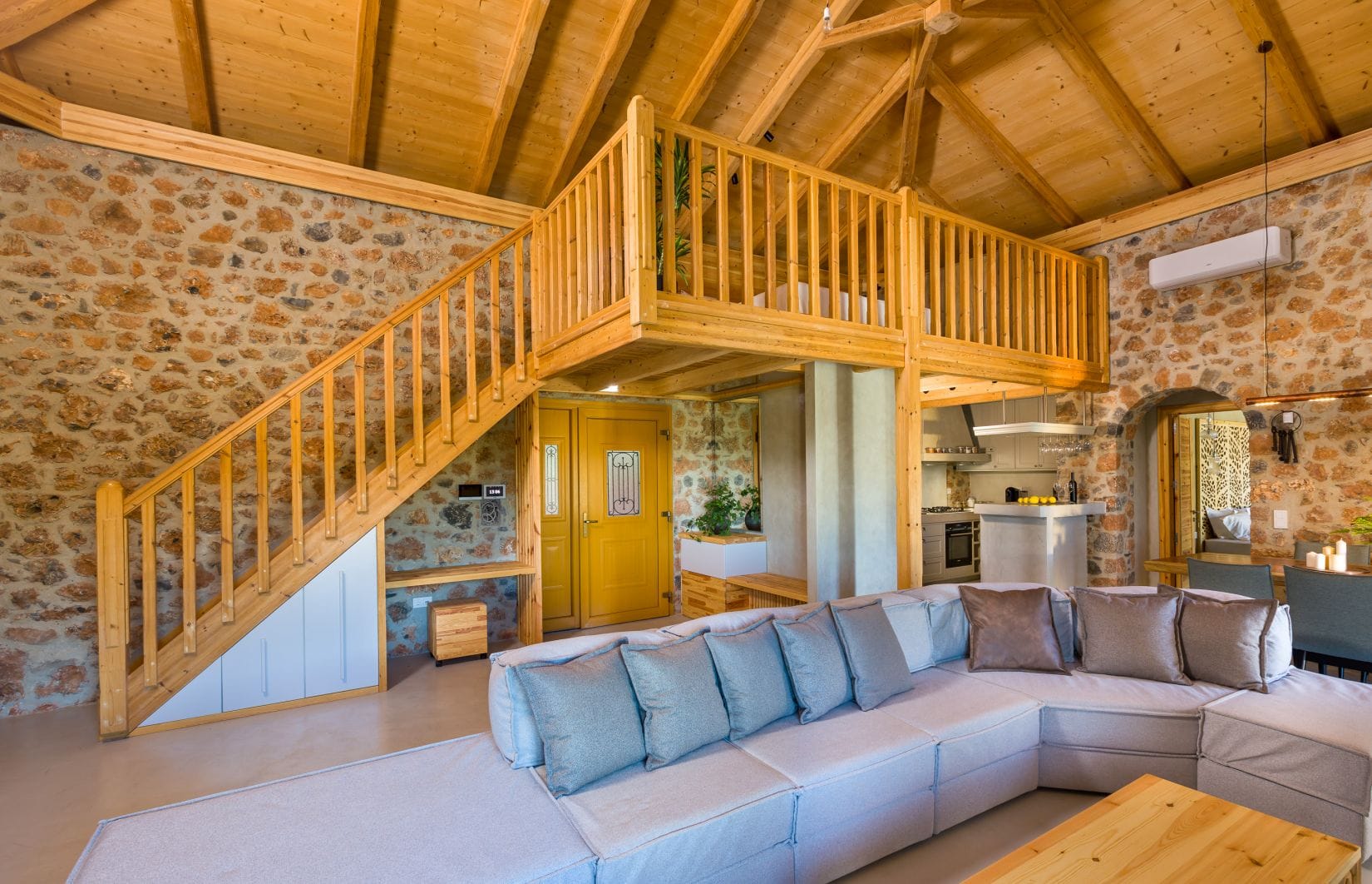 Villa Sirocco is a striking example of Mediterranean design, showcasing a harmonious blend of natural stone, rich wooden elements, and smooth mortar that creates a warm, inviting atmosphere. The villa’s open-plan layout maximizes light and space, offering panoramic mountain views that can be admired from almost every corner. Each room is adorned with tasteful furnishings and decor that reflect the beauty of the surrounding landscape.