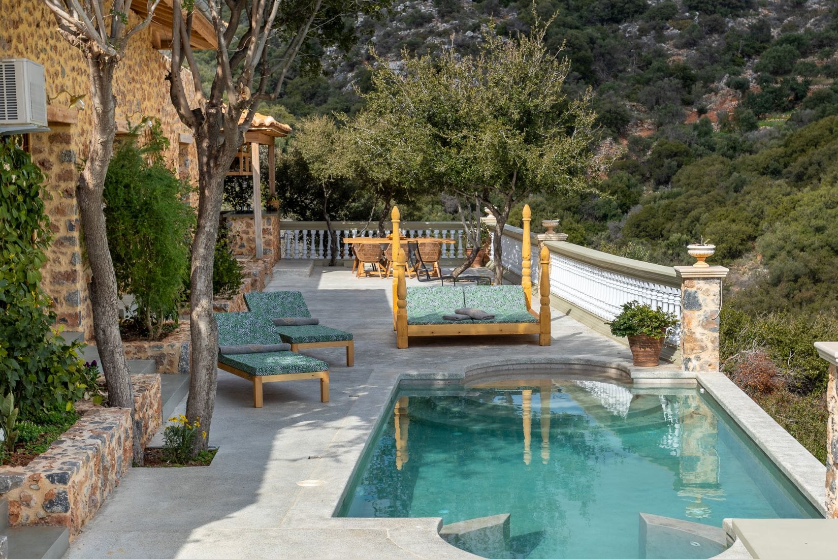 Step outside to discover your personal oasis! The villa features an expansive heated private pool (4m x 8m x 1.4m) with built-in jets, ideal for cooling off on warm Cretan days. Surrounding the pool are comfortable sun loungers and a luxurious daybed, perfect for sunbathing or enjoying a good book.
