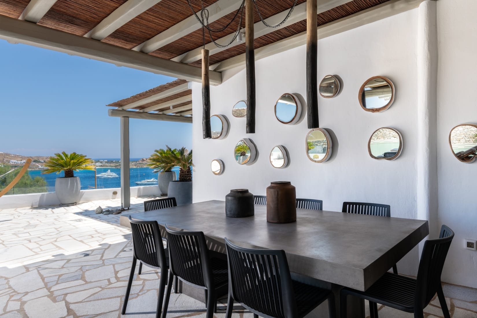 The outdoor area includes huge terraces with a lounge and open-air dining facilities, shaded pergolas and a large swimming pool. The villa guarantees tranquility, as the picturesque landscape and the panoramic sea view captivate your eye. Whether for a delightful breakfast, a cocktail by the pool, or a dinner al-fresco, the experience will remain one to remember for ages.