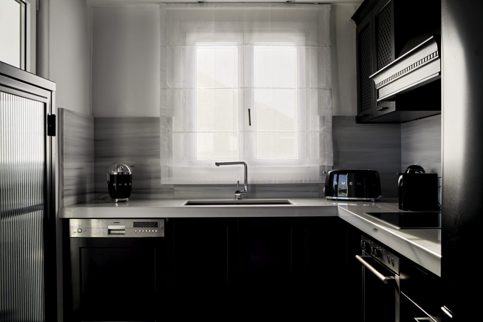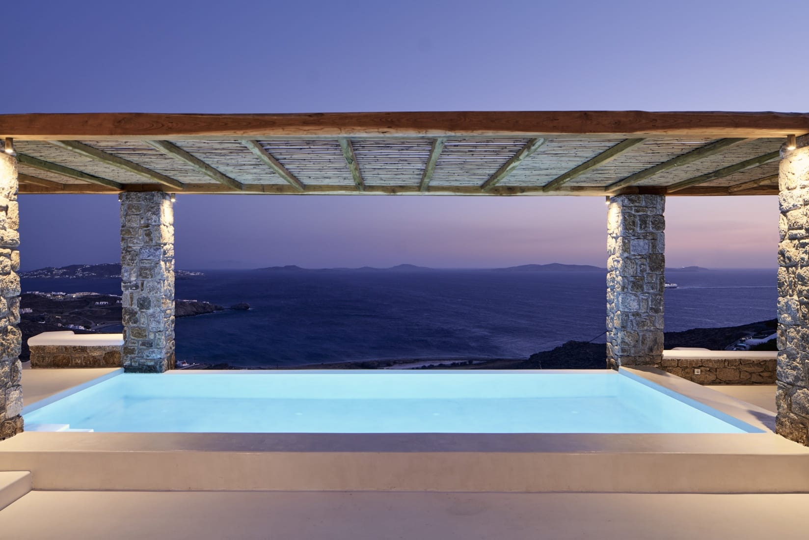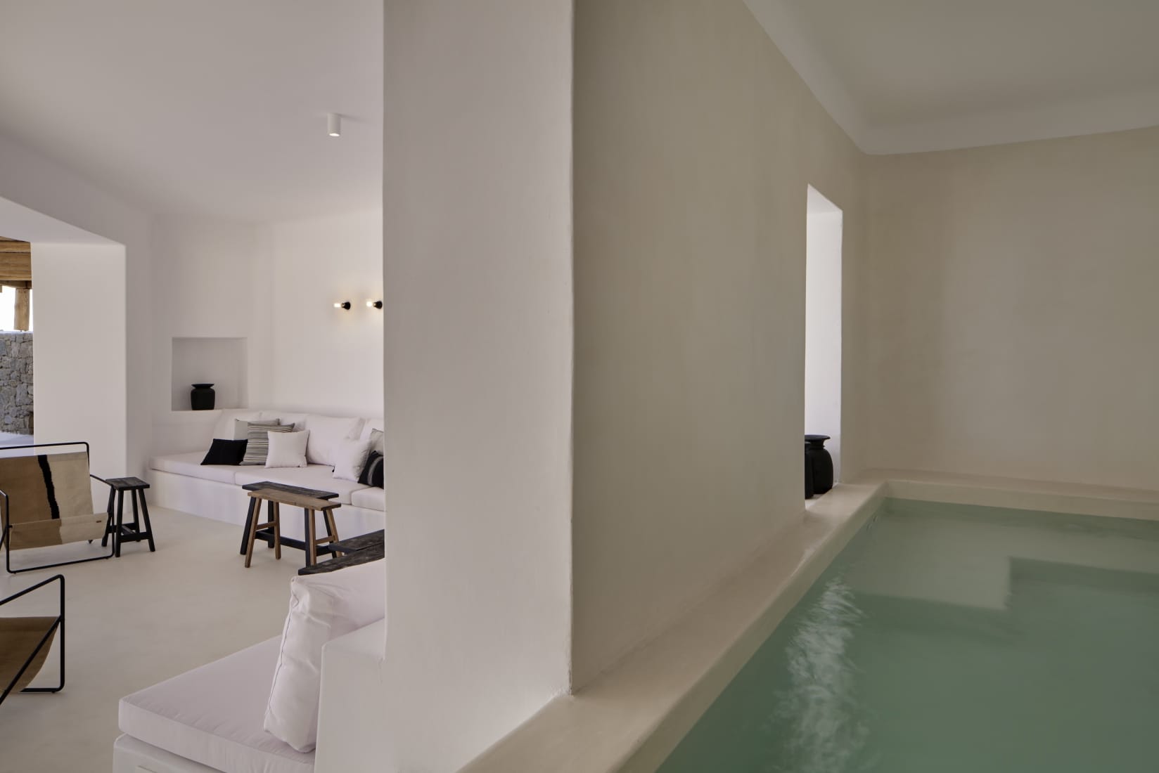 On the Pool Level which is the entrance and welcoming area of Villa Lauretta, there is a large independent living room (semi-open) with an indoor heated plunge pool, a sizeable pi-shaped built-in sofa, and a tall glass opening with a sea and sunset view, an indoor dining area (access to a pergola shaded veranda with sitting and dining areas), a fully equipped kitchen with all necessary appliances On the same level, there is an ensuite double bedroom (Queen size bed) with walk-in shower and access to a private veranda with a lounge space and sea view.