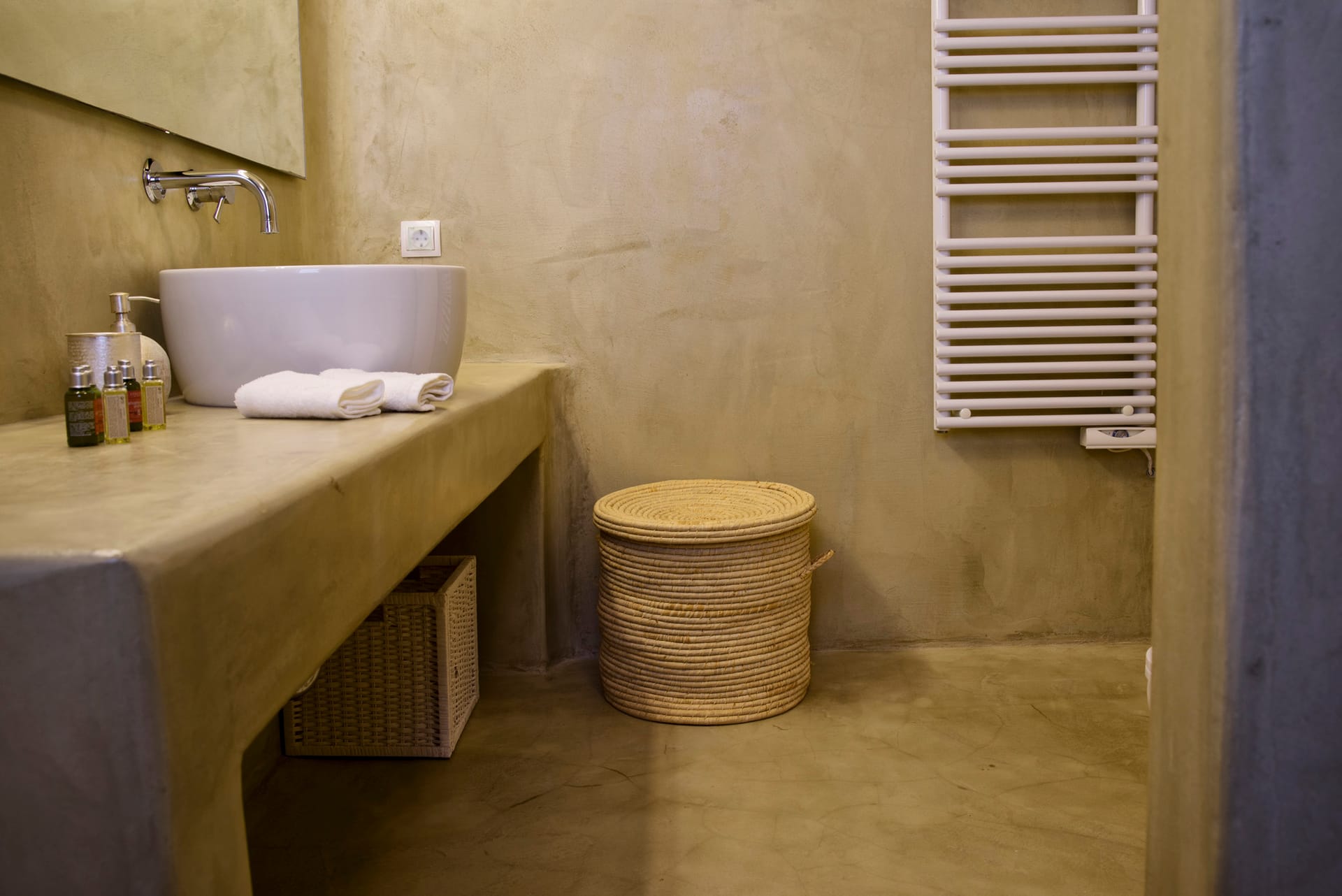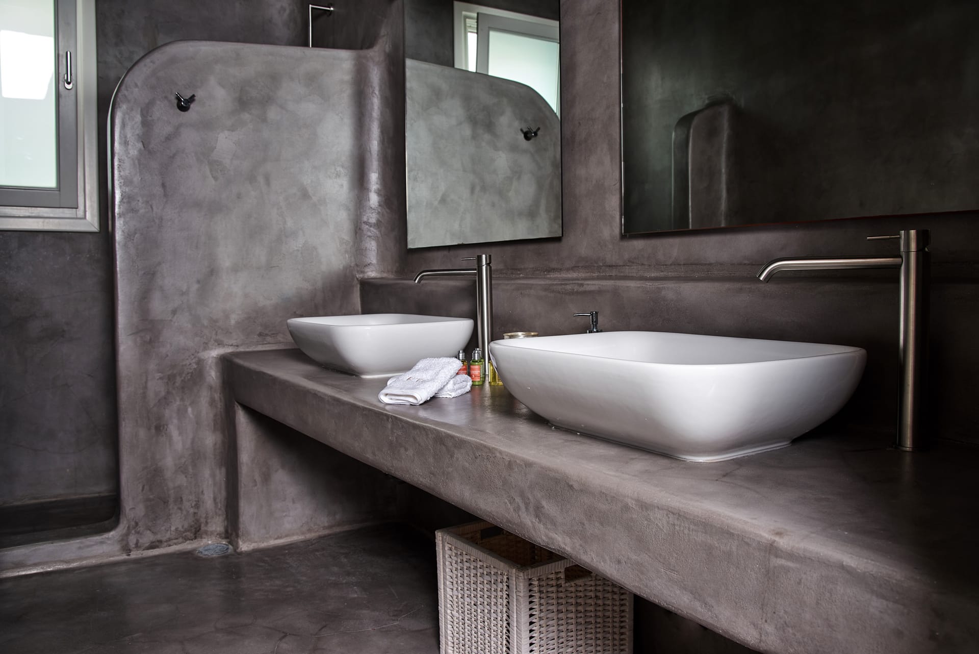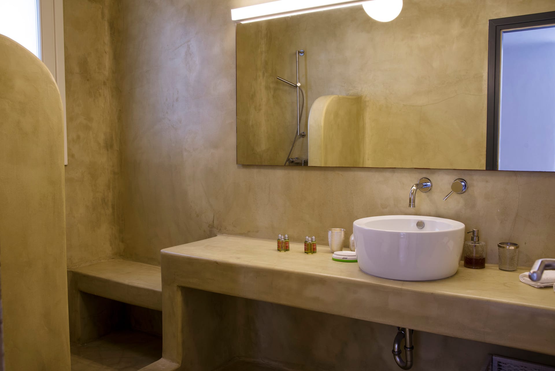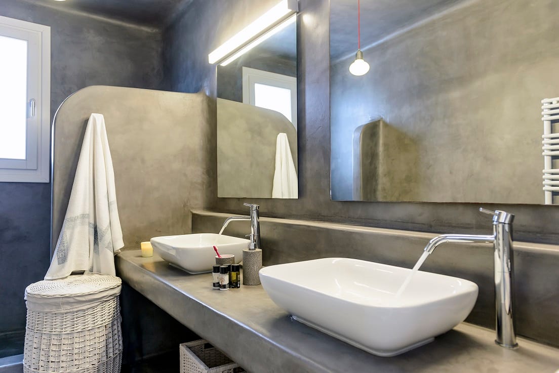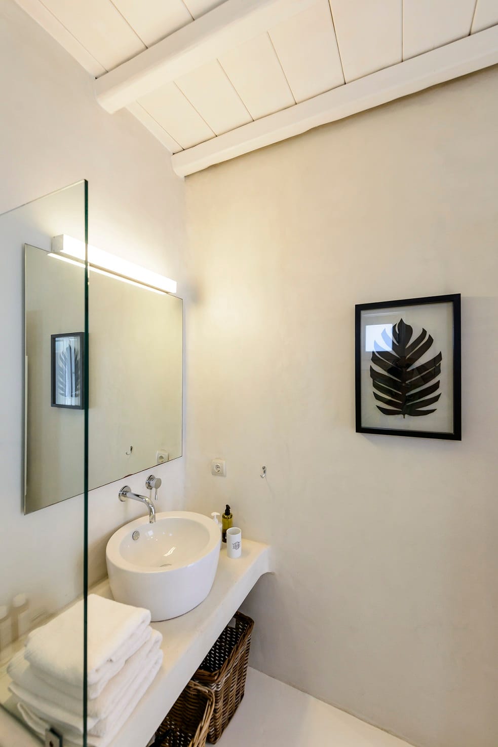 The ever-so-popular modernization of Cycladic architecture is featured throughout the indoor spaces, cleverly embellished by the personal touches of the discerning owners. The common spaces and bedrooms are thoughtfully placed on separate levels for added comfort with one of the bedrooms being completely independent from the main house (the guest house).